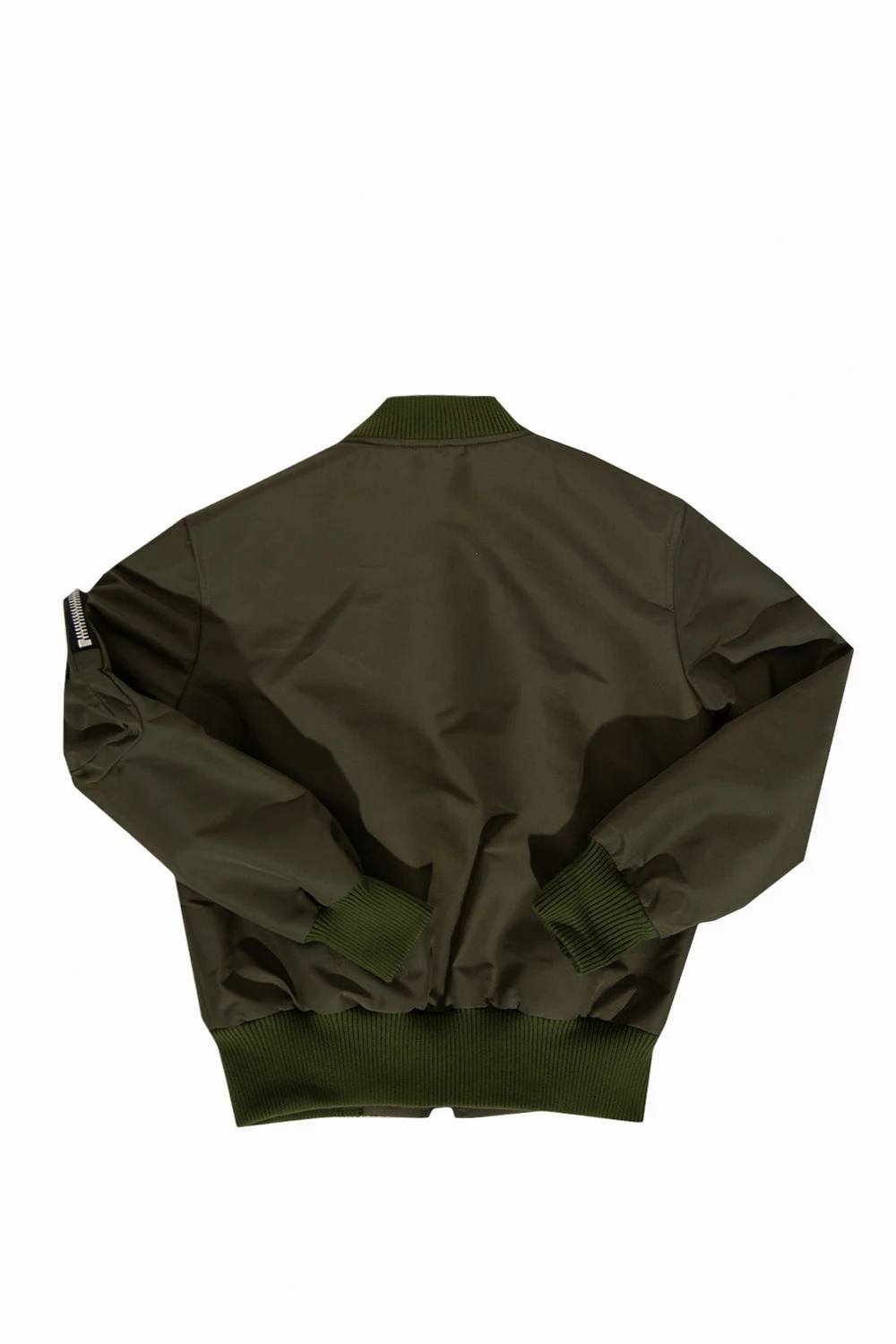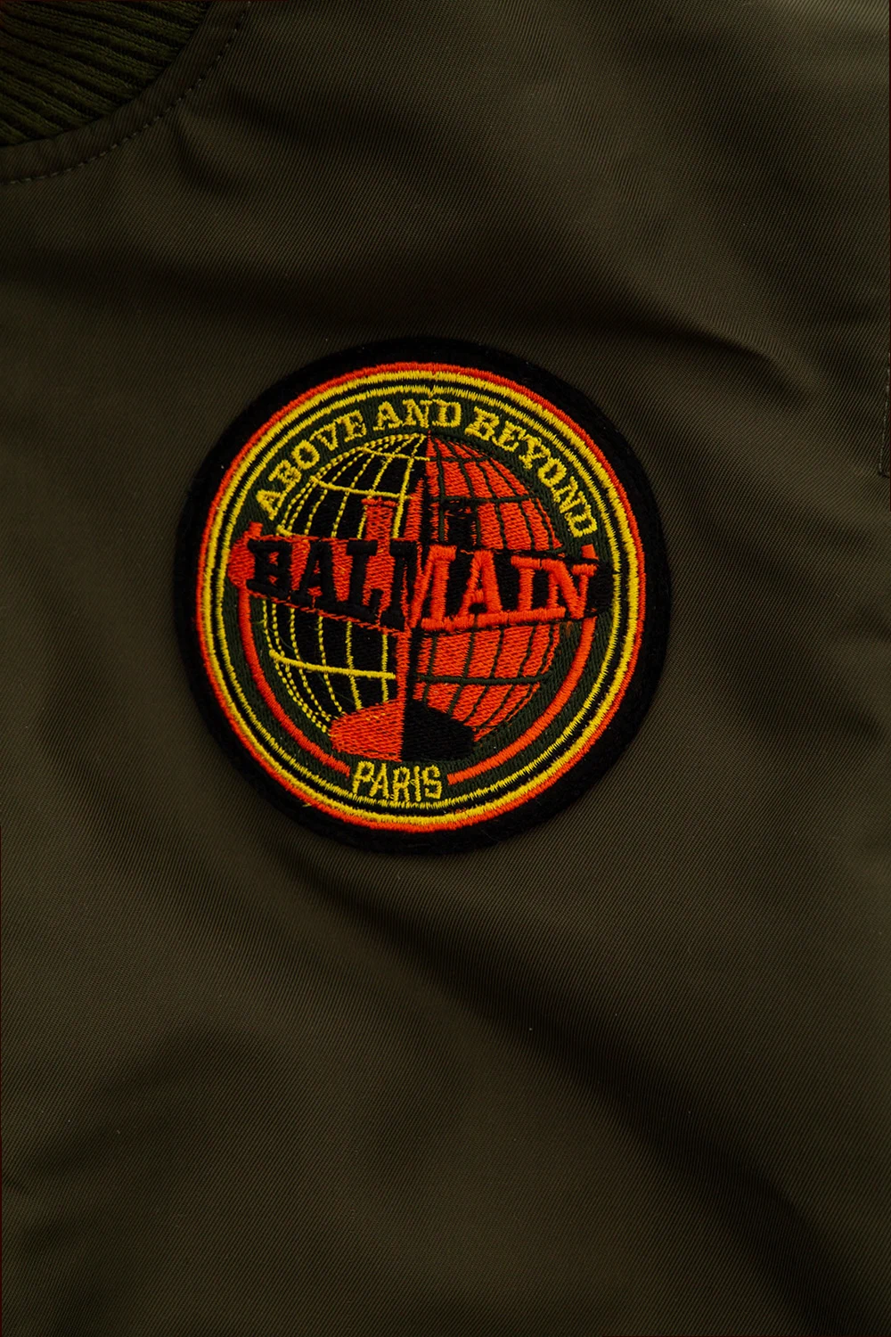 Khaki bomber jacket from Balmain Kids. Emblazoned with a colourful logo patch, this style features a zip fastening, two slip pockets on the front, two zipped pockets on the sleeves (one is accentuated with a green and black patch) and rib detailing on the collar, bottom hem and cuffs.