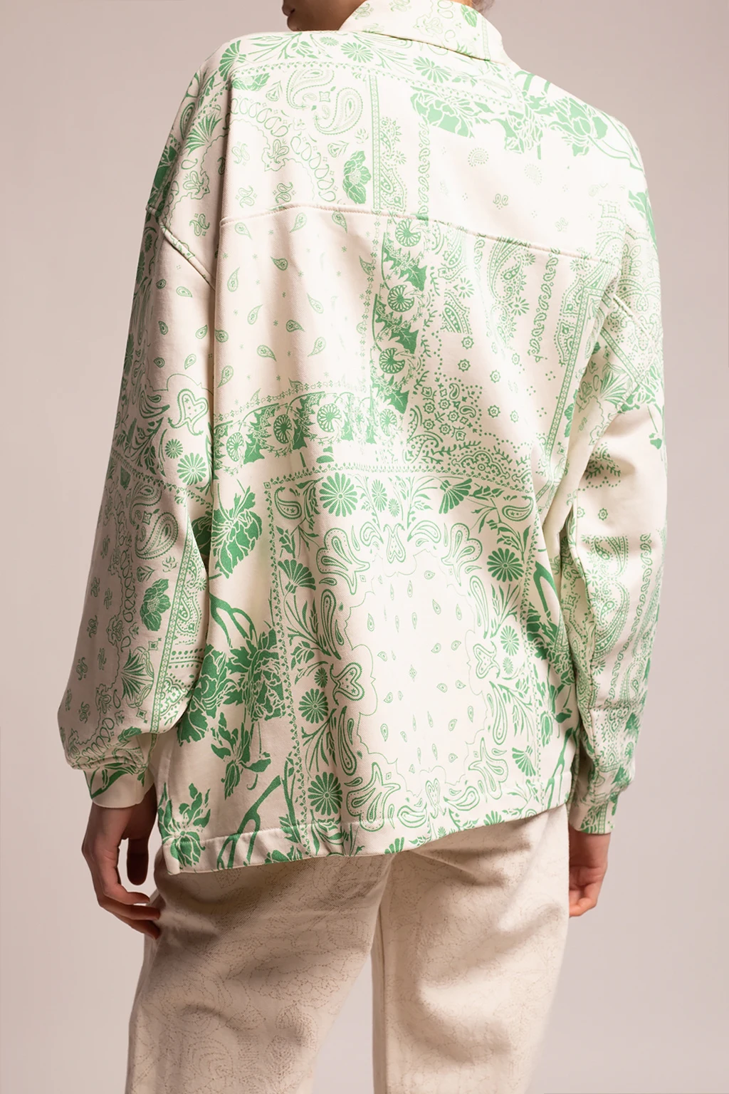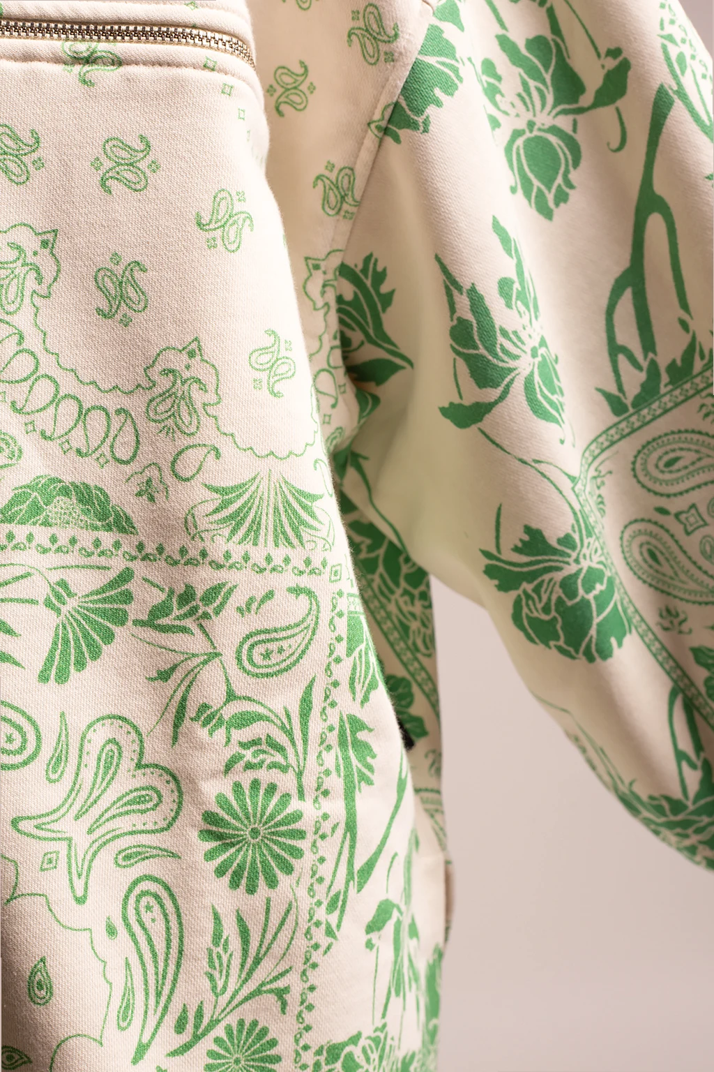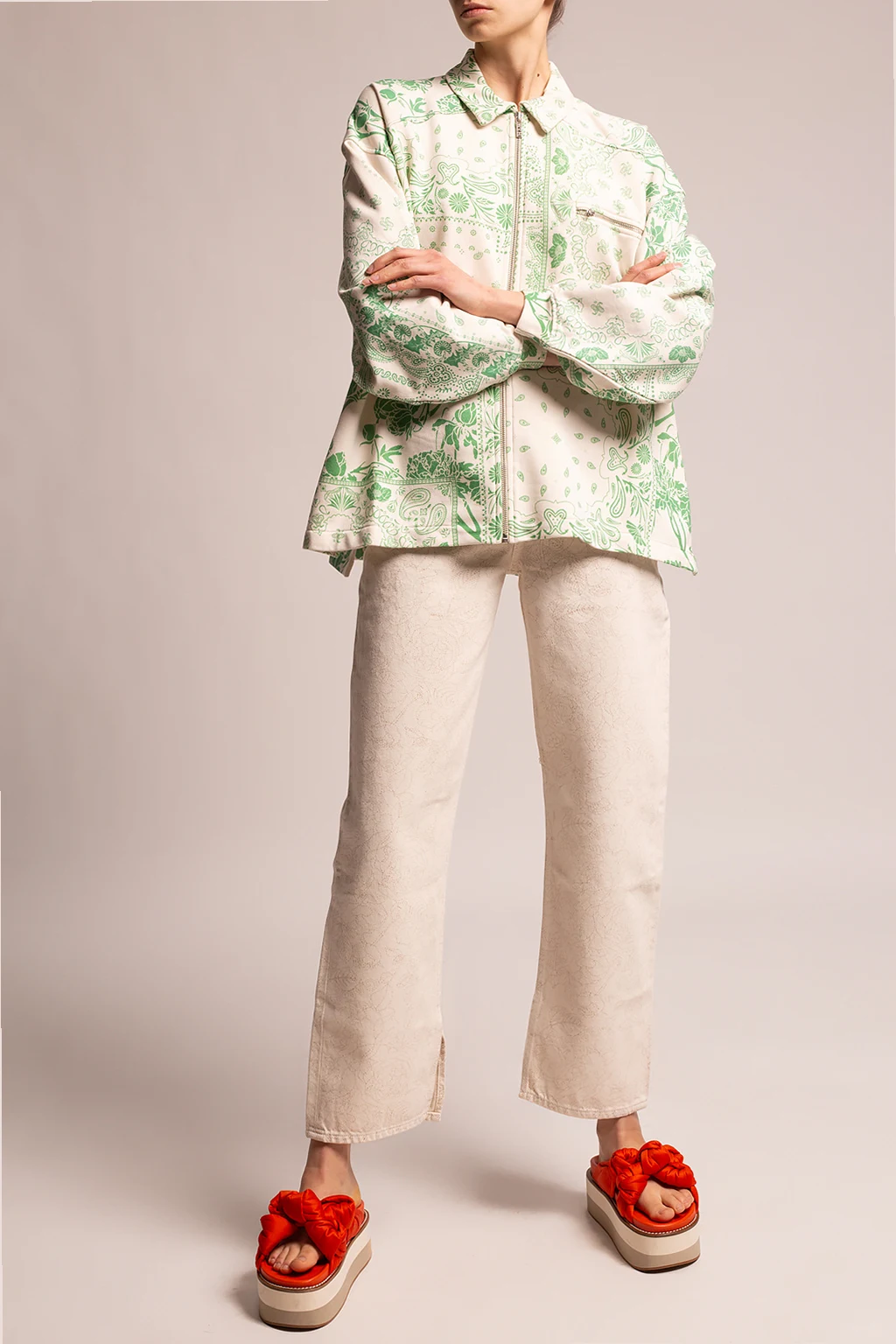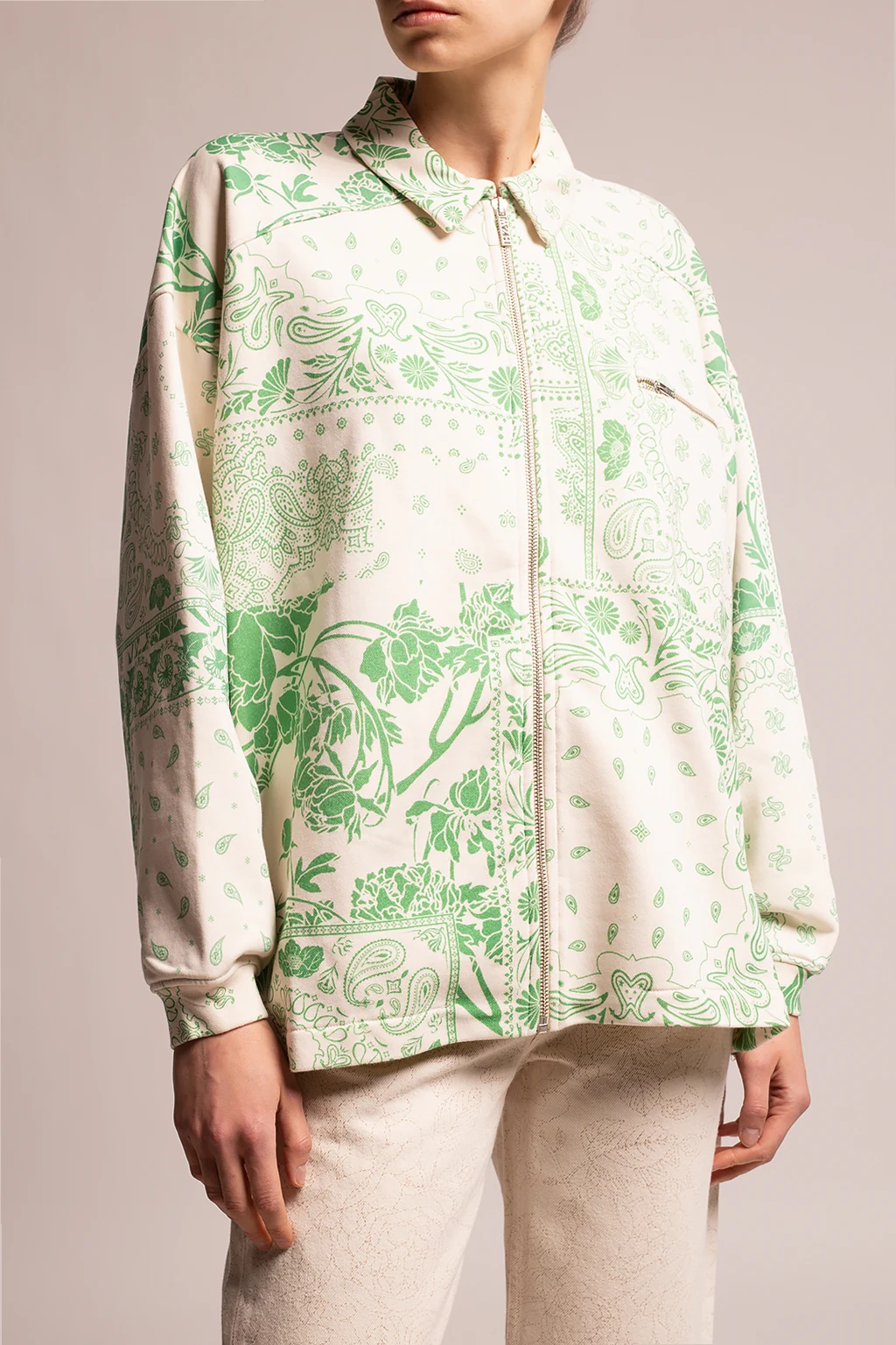 Cream sweatshirt from Holzweiler. Crafted from a blend of organic cotton and recycled polyester, this style fastens via a zip and showcases a green floral print, a single zip pocket on the front and long sleeves with elasticated cuffs.
