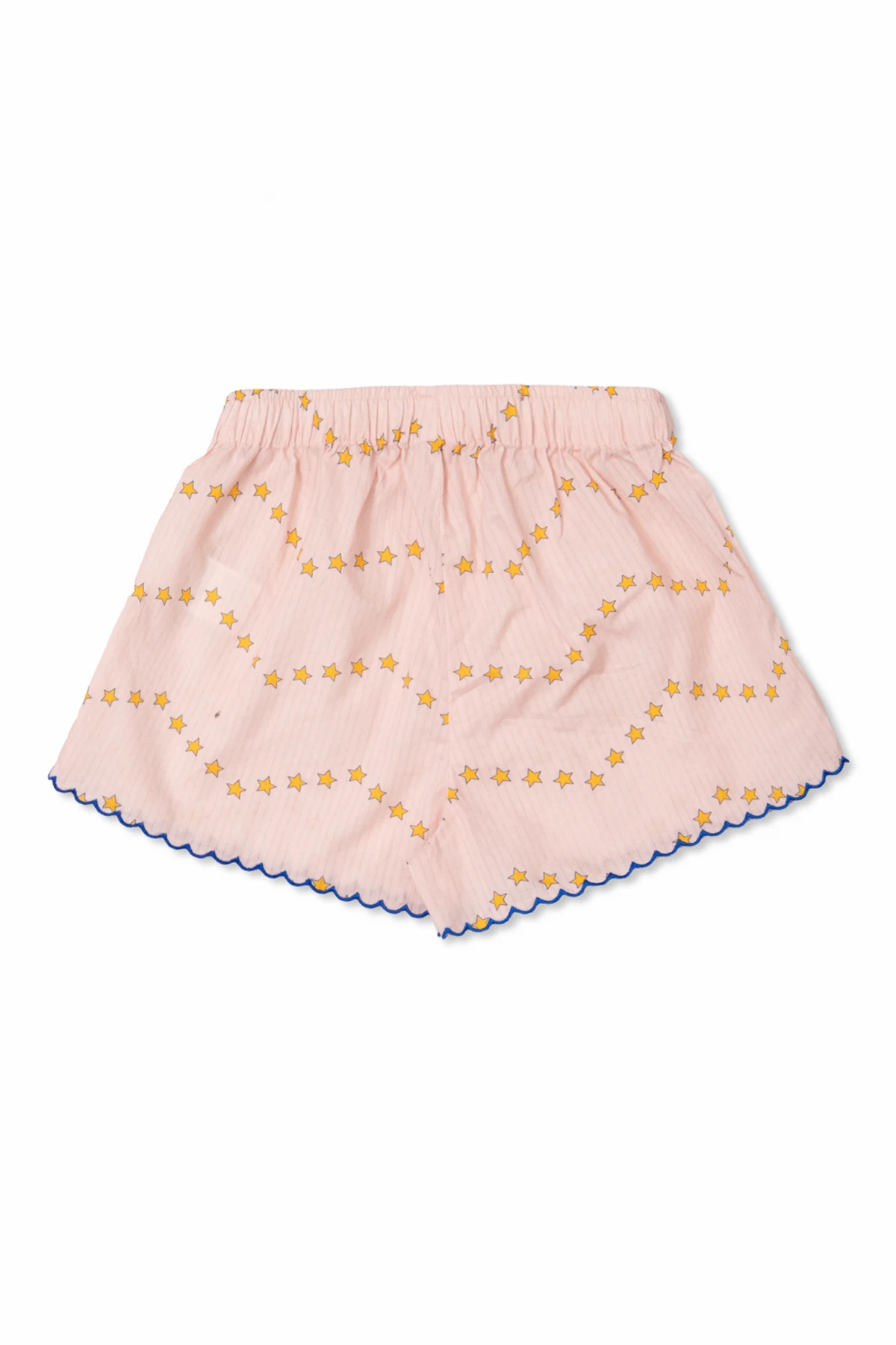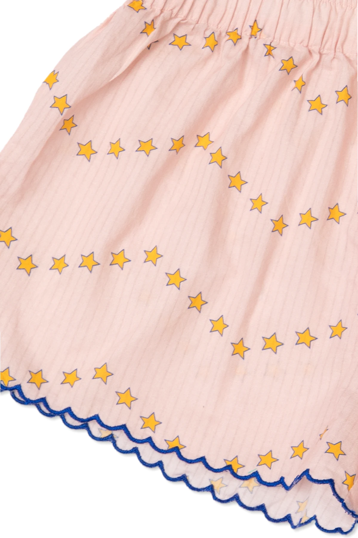 Der lockere Schnitt in Kombination mit dem elastischen Bund garantiert Bewegungsfreiheit und passt sich verschiedenen Körperformen an. Die Shorts sind mit einem regelmäßigen, gelben Sternenmuster verziert, das horizontal angeordnet ist und ihnen Charakter verleiht, wodurch sie sich von anderen abheben. Zusätzlich ist der untere Rand der Beinöffnungen mit einer entzückenden Rüsche mit blauer Paspelierung verziert, was ihren mädchenhaften Charme unterstreicht und eine Prise Eleganz hinzufügt.
