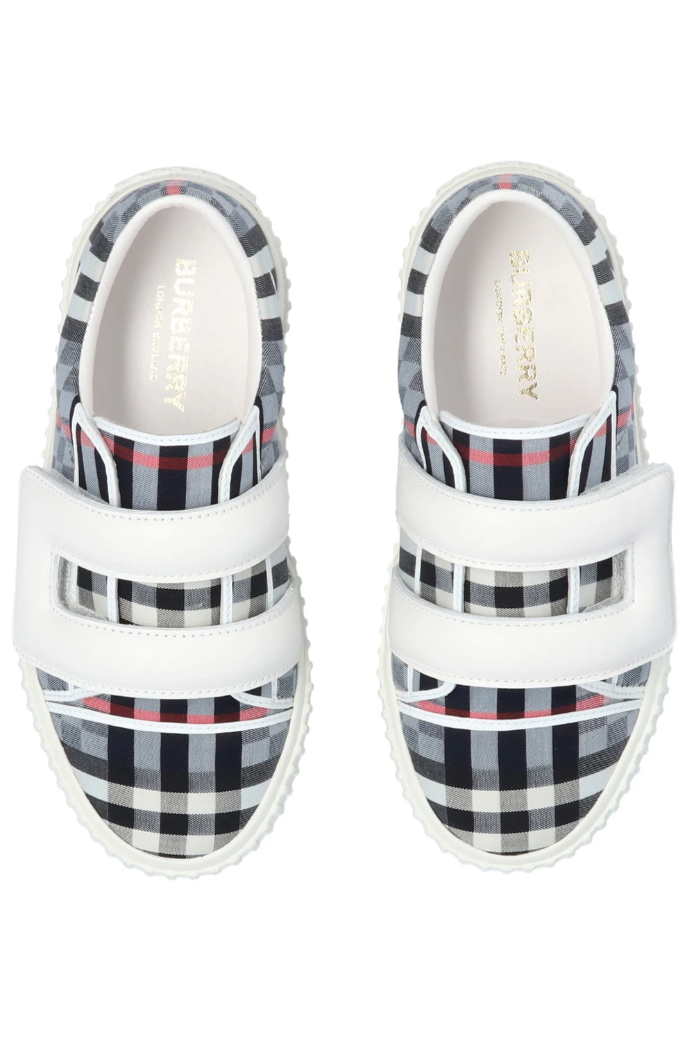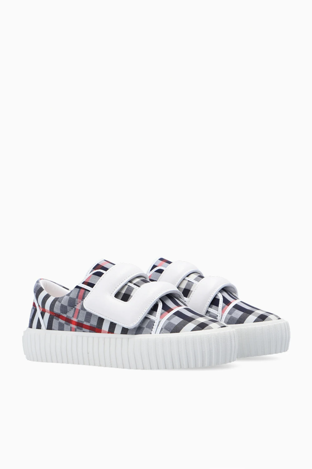 White, black and red sneakers from Burberry Kids. Crafted from fabric and leather, this lace-up model showcases a check pattern, two velcro straps and a white rubber sole.