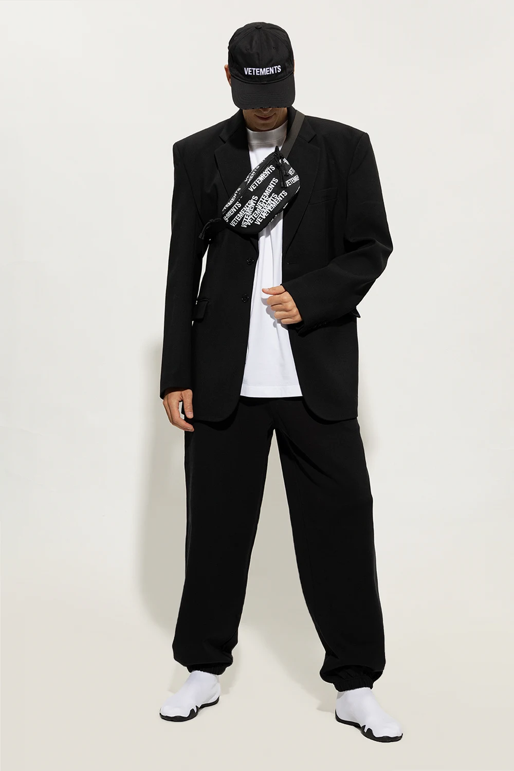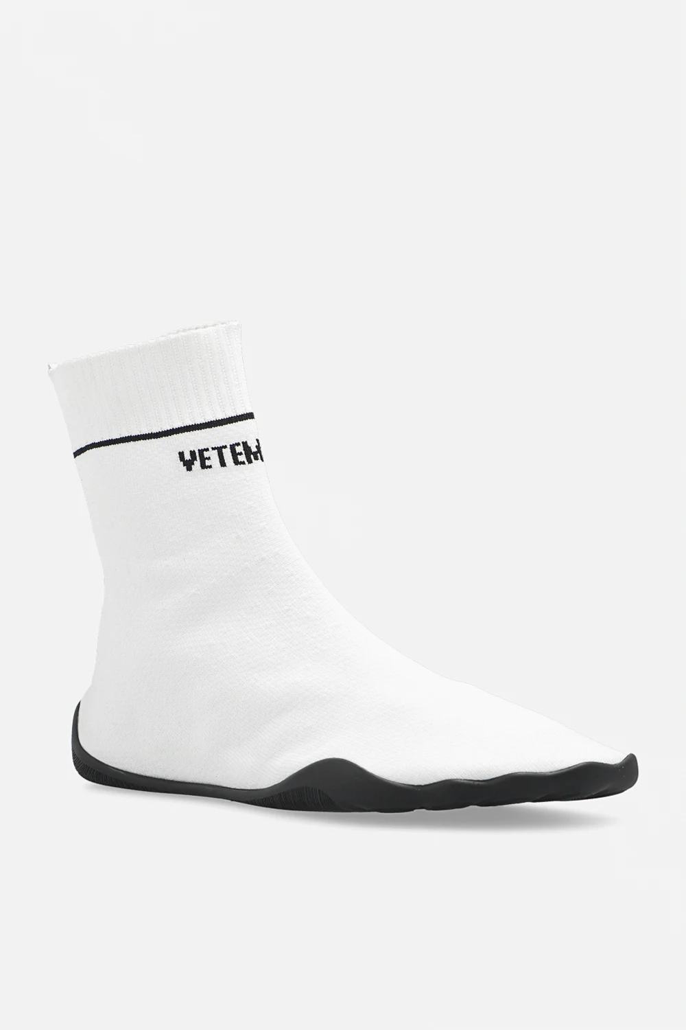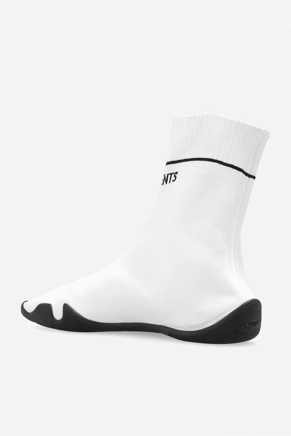 White slip-on sock sneakers from VETEMENTS. Made of stretchy fabric, this pair is complete with a logo embroidery, ribbed edge and black decorative rubber sole.