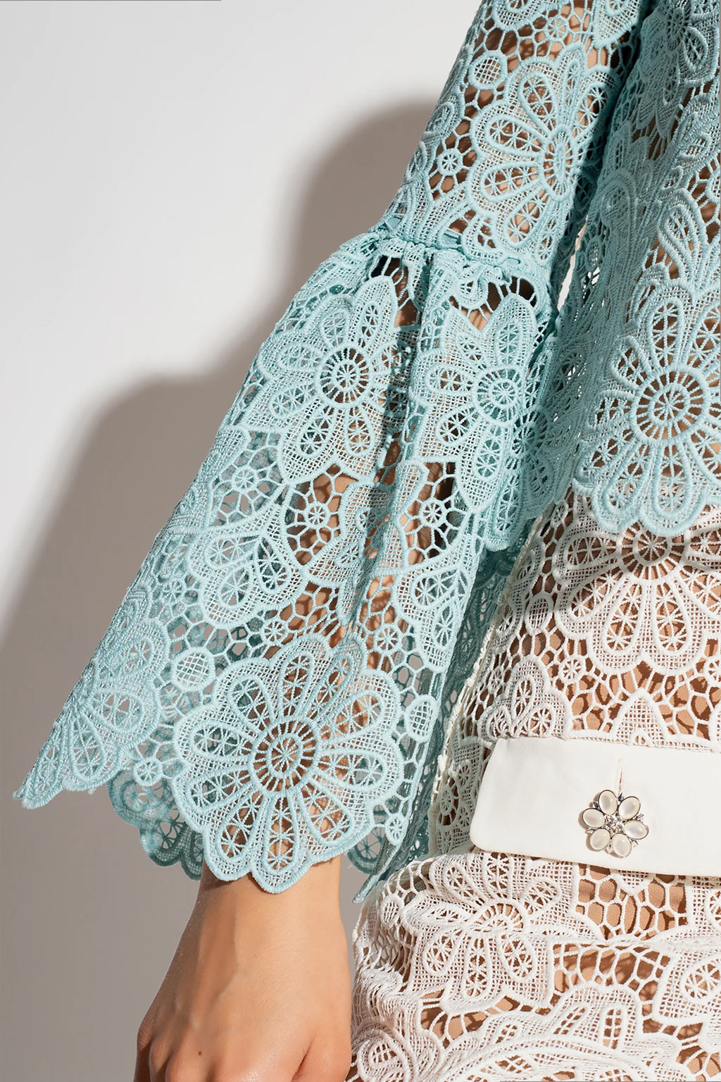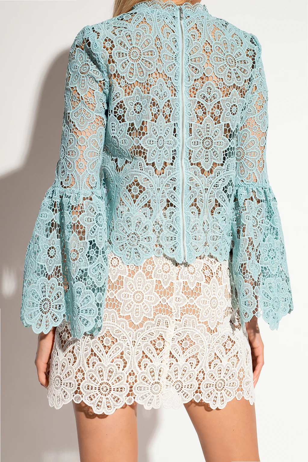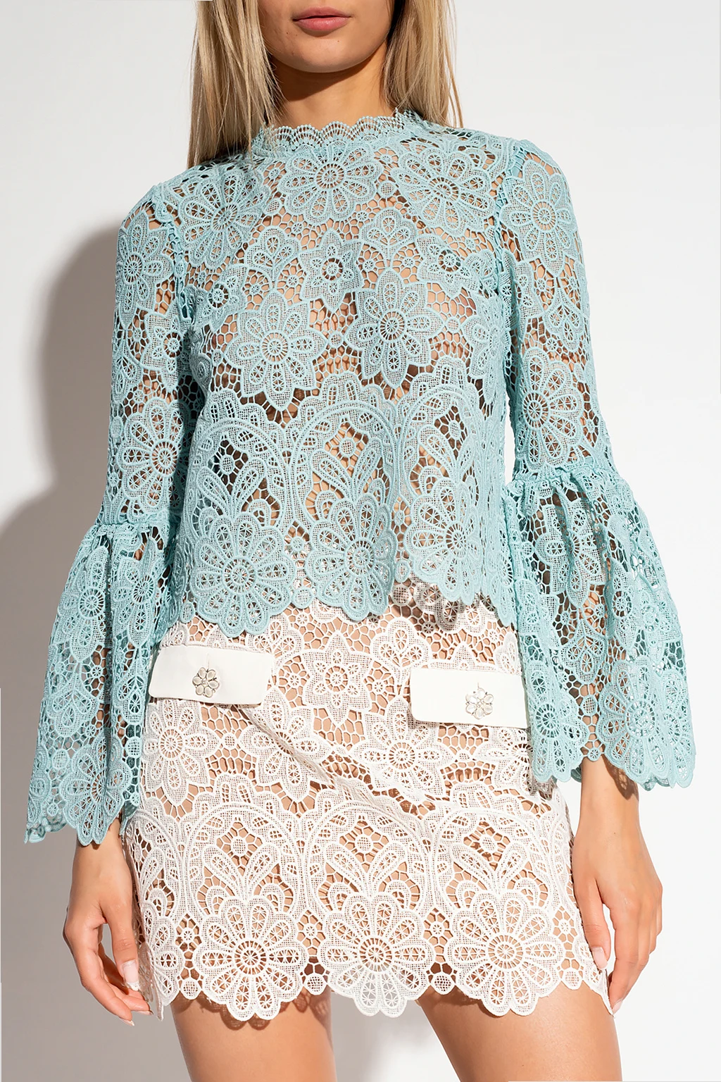 Light blue openwork top from Self-Portrait. Crafted from lace with floral broderie detailing, this style secures with a back zipper and hook & eye closure. With an Edwardian-inspired silhouette, it has a distinctive standing collar and long sleeves with ruffles.