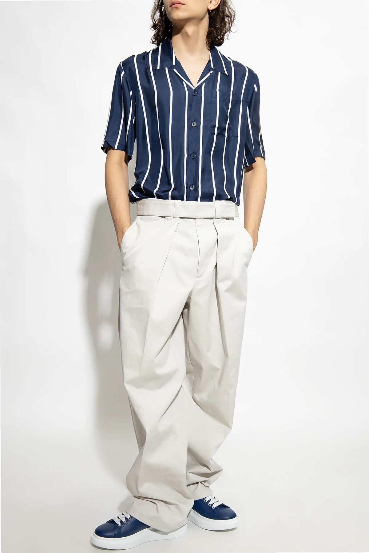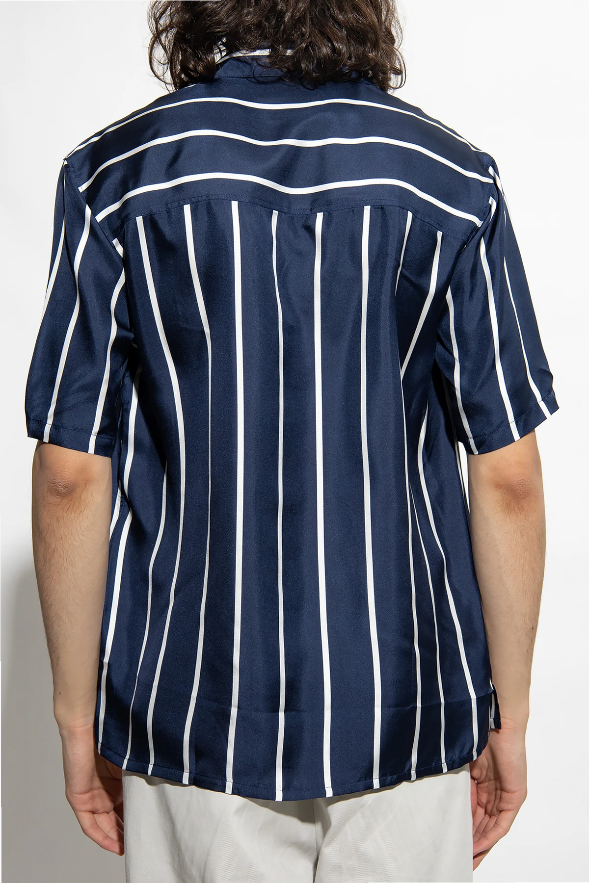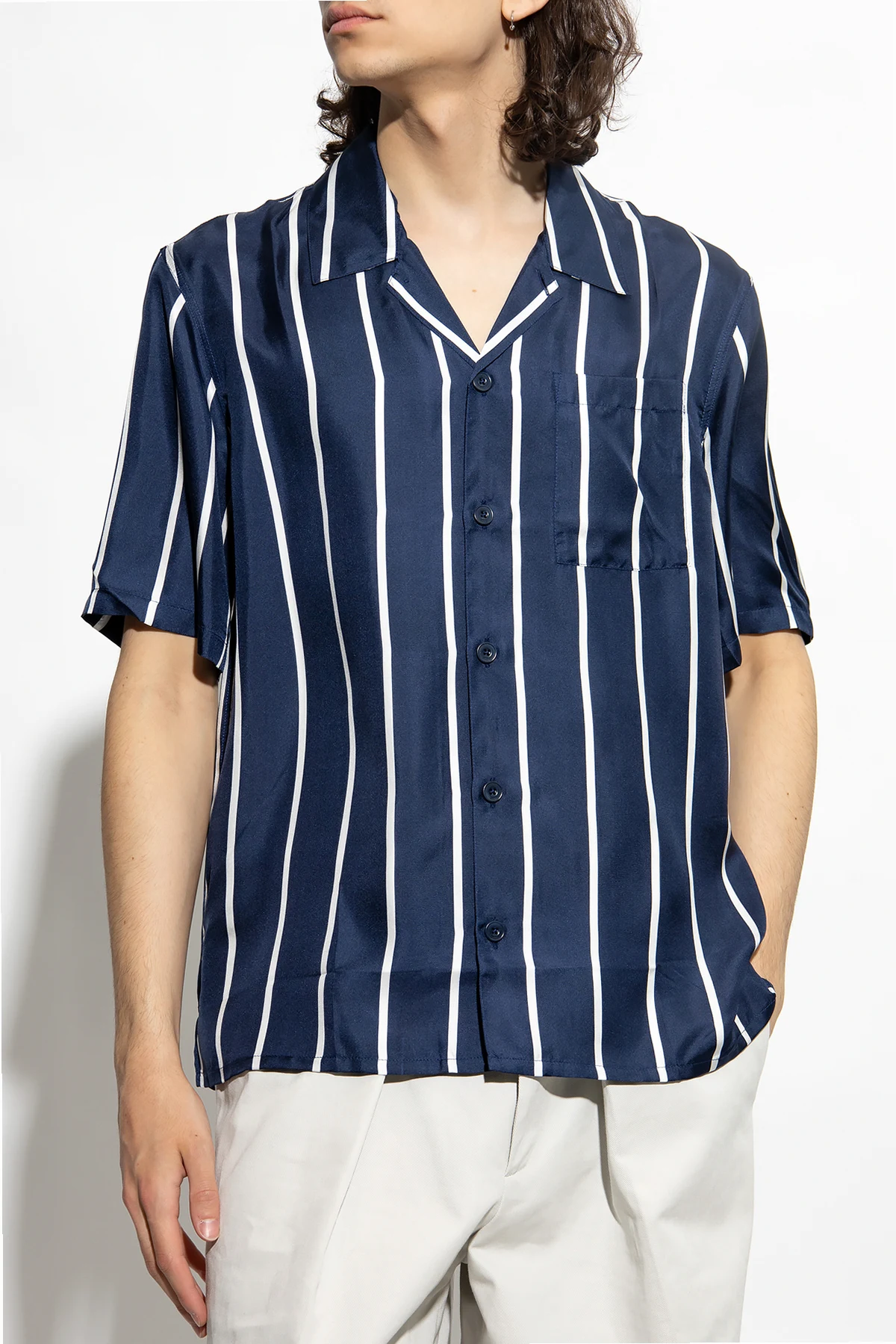 Navy shirt from Ami Alexandre Mattiussi. Made of silk, this short sleeve design features button fastenings, a stripe pattern and slip pocket.
