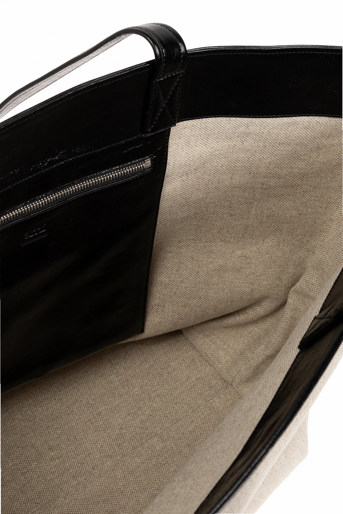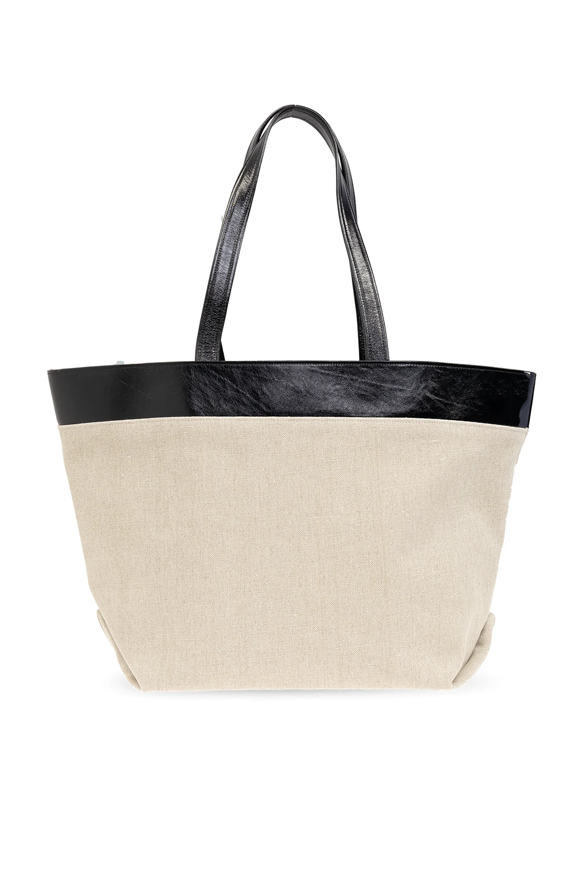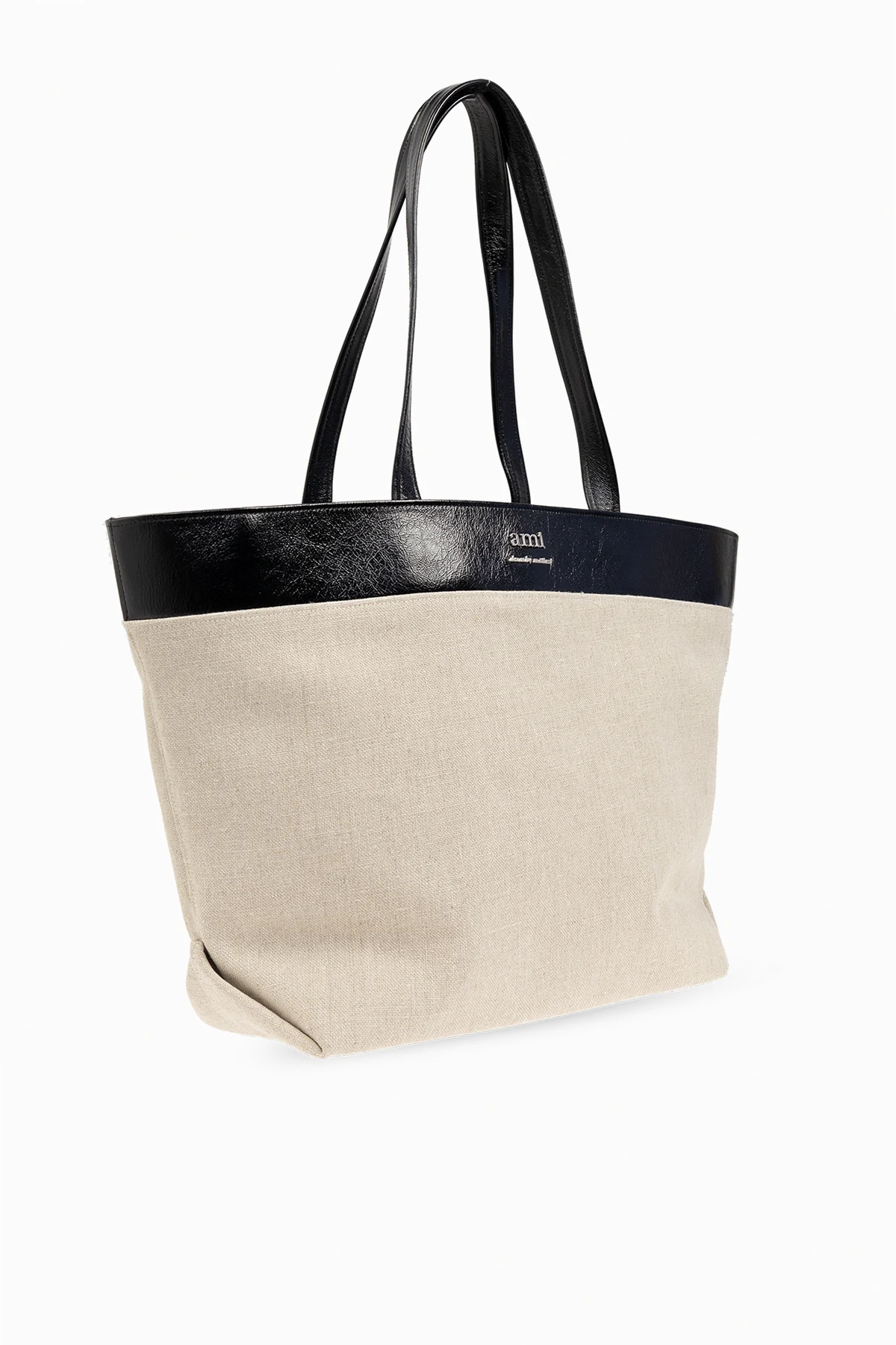 Beige and black shopper bag from Ami Alexandre Mattiussi. Made from a linen and cotton blend with leather trims, this model features a silver-tone logo detail, two half-round handles and one internal compartment with one zip pocket.
