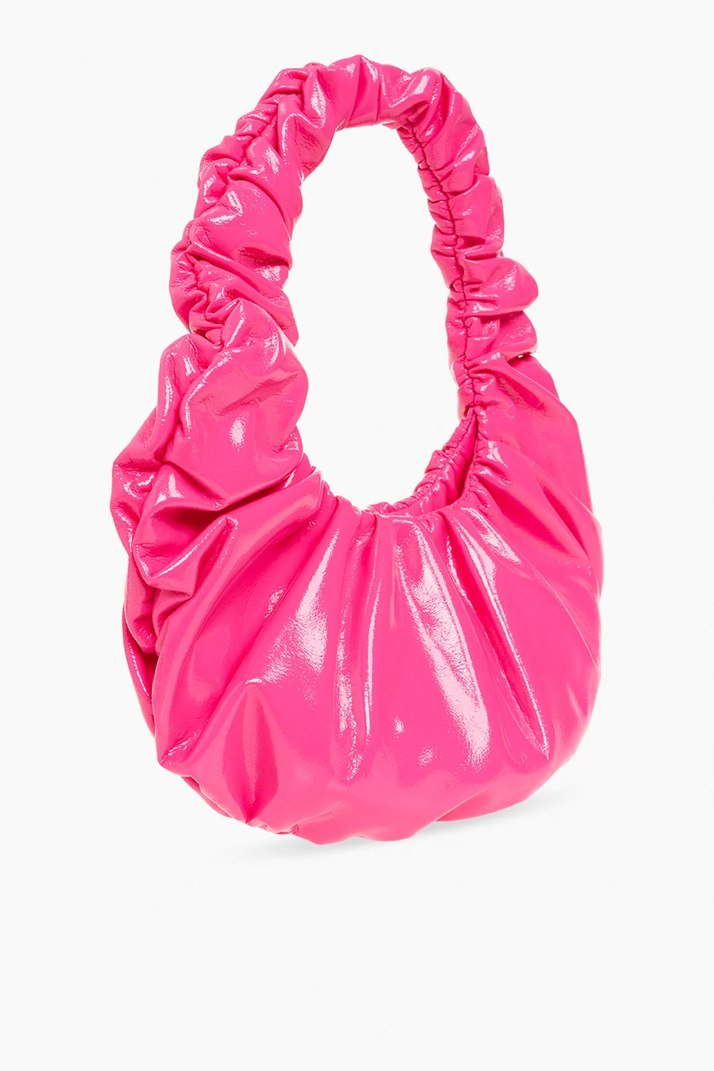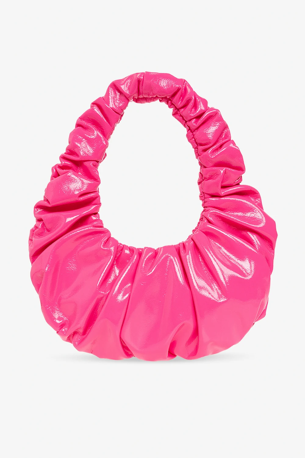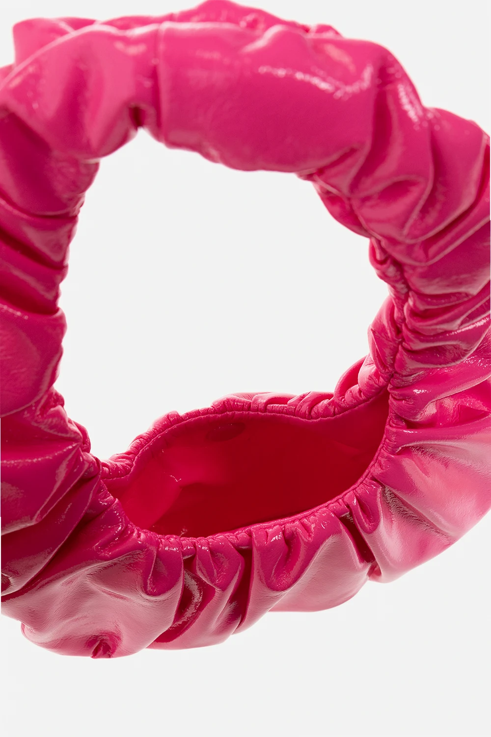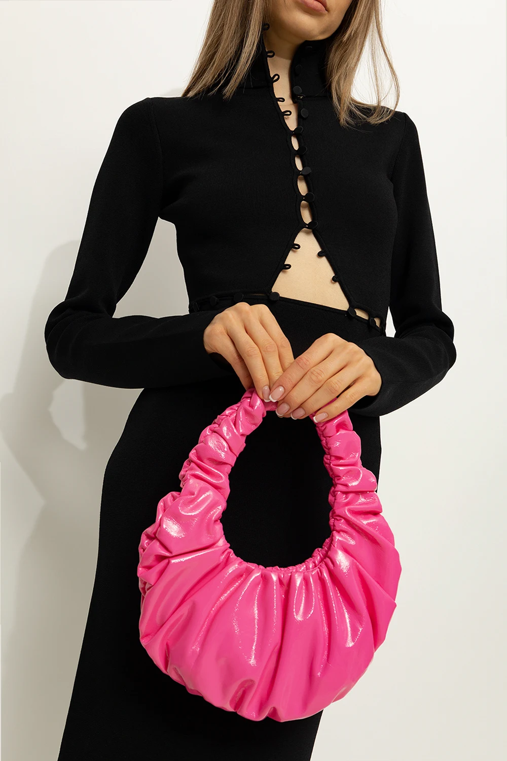 Pink ‘Anja Mini’ glossy handbag from Nanushka. Crafted from glossy vegan leather, this model features a magnetic closure, gathers, short handle and one internal compartment with one card slot.
