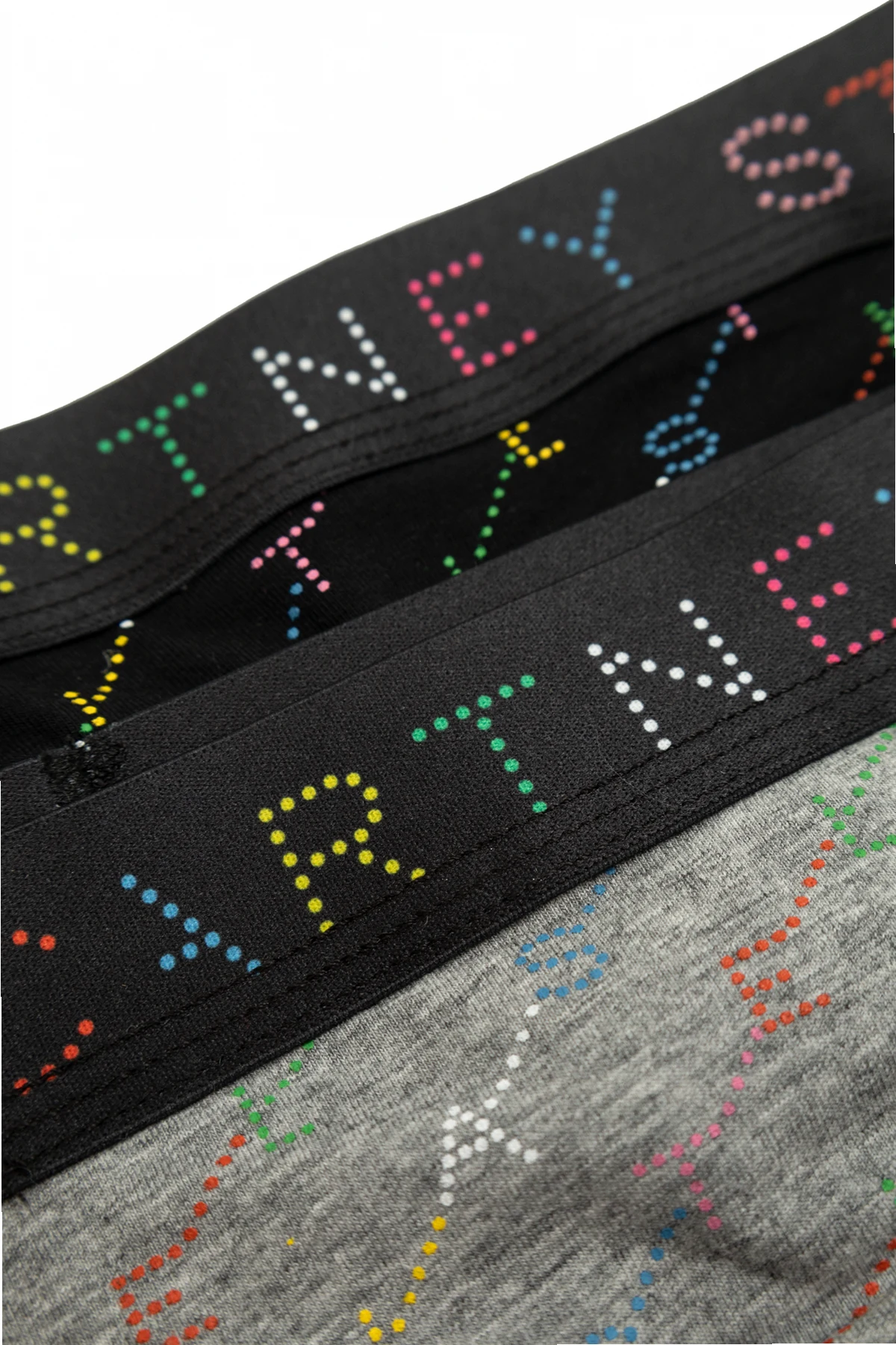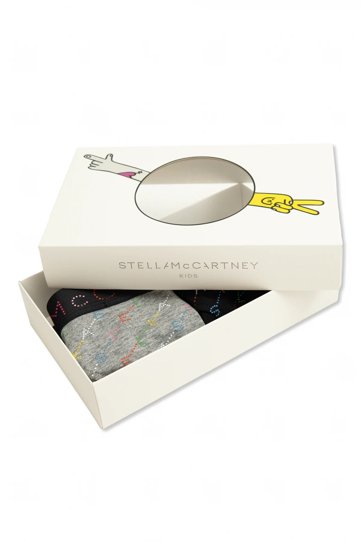 Ein Paar der Unterhosen ist vollständig grau mit buntem Muster, während das andere Paar schwarz mit ähnlichem Muster in anderen Farben ist. Auch die Verpackung dieser außergewöhnlichen Unterhosen verdient Aufmerksamkeit – eine elegante, weiße Box mit Sichtfenster und dem Logo "STELLA McCARTNEY KIDS" unterstreicht den exklusiven Charakter des Produkts.