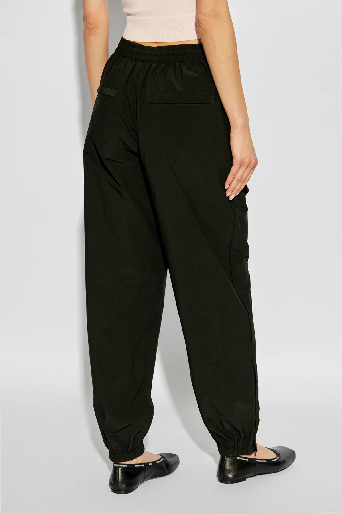 Ihr lockerer Schnitt, kombiniert mit einem elastischen Bund sowie Bündchen an den Knöcheln, garantiert uneingeschränkte Bewegungsfreiheit und eine passgenaue Form. Zusätzlich unterstreicht die Funktionalität dieser Hosen durch praktische, diskrete Reißverschlusstaschen. Ein subtiles, dunkles Designer-Logo, platziert auf Hüfthöhe, verleiht dem Ganzen einen raffinierten Charakter, ohne von dem minimalistischen Design abzulenken.