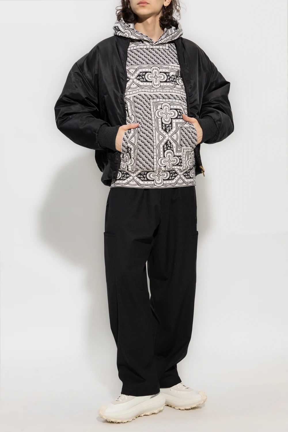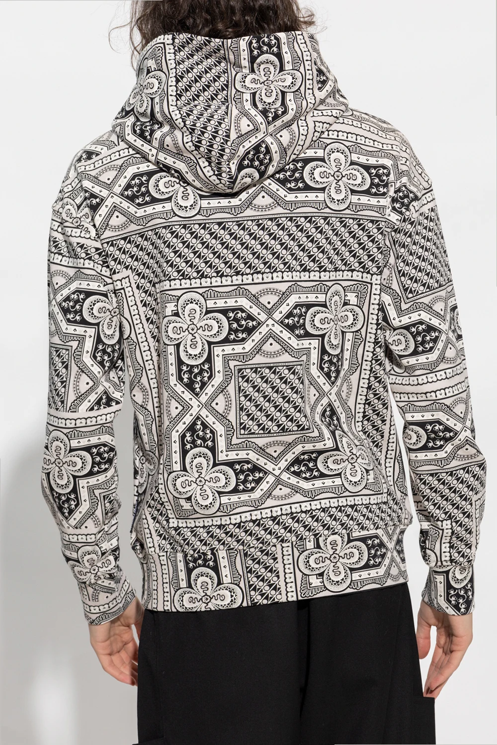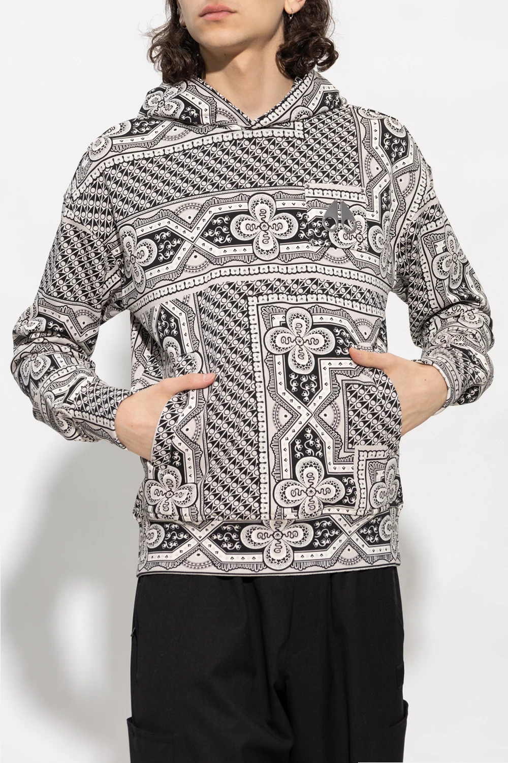 Black and beige hoodie from Moose Knuckles. Crafted from cotton, this design features a printed pattern, metal logo detail, two front pockets and ribbed trims at the hem and cuffs.
