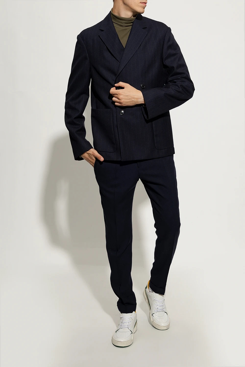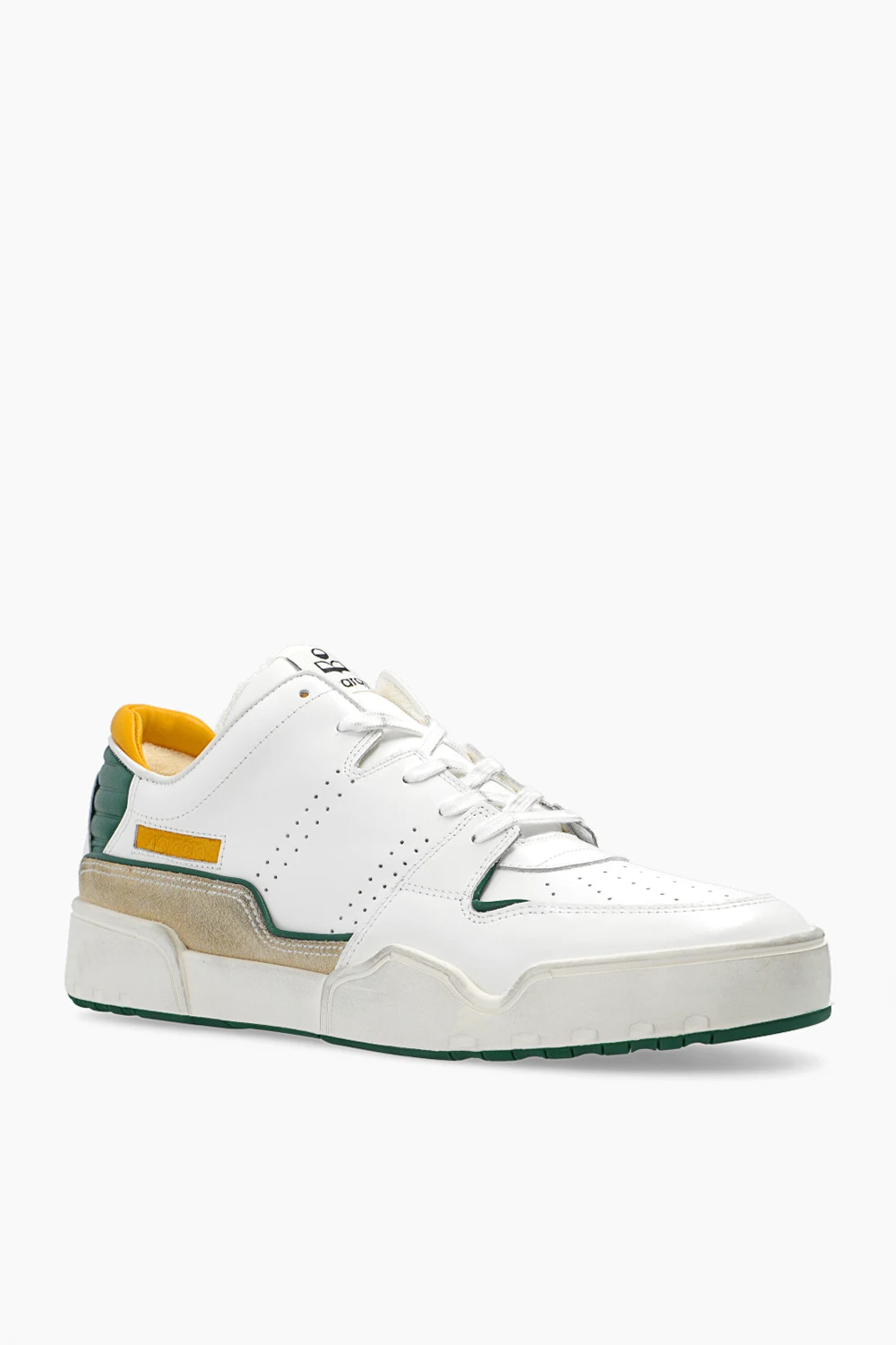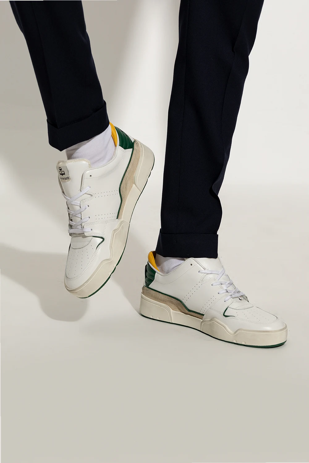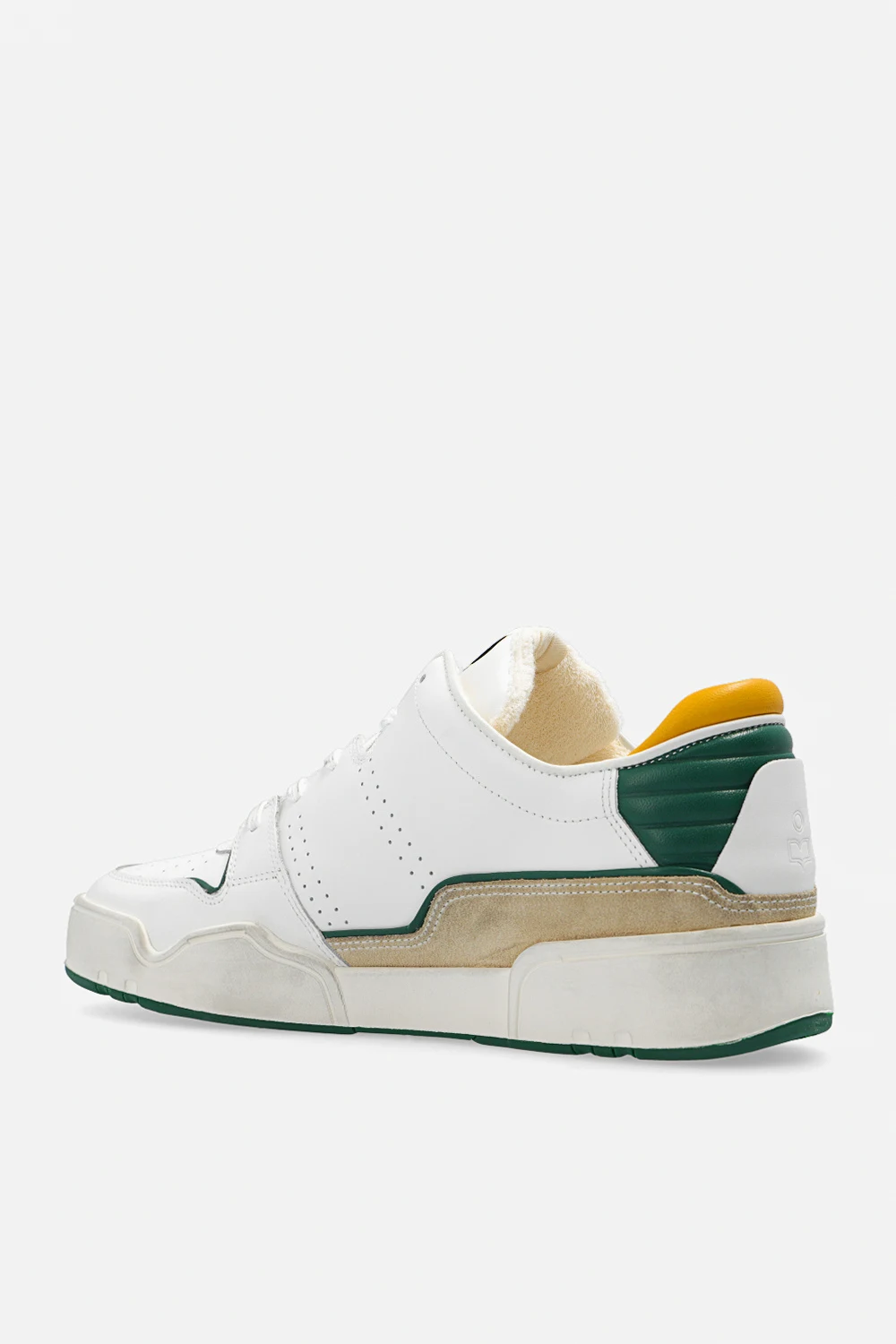 White ‘Emereeh’ sneakers from Isabel Marant. Crafted from leather with beige suede trims, this lace-up pair features logo details, yellow and green elements, perforations and rubber sole in white and green.