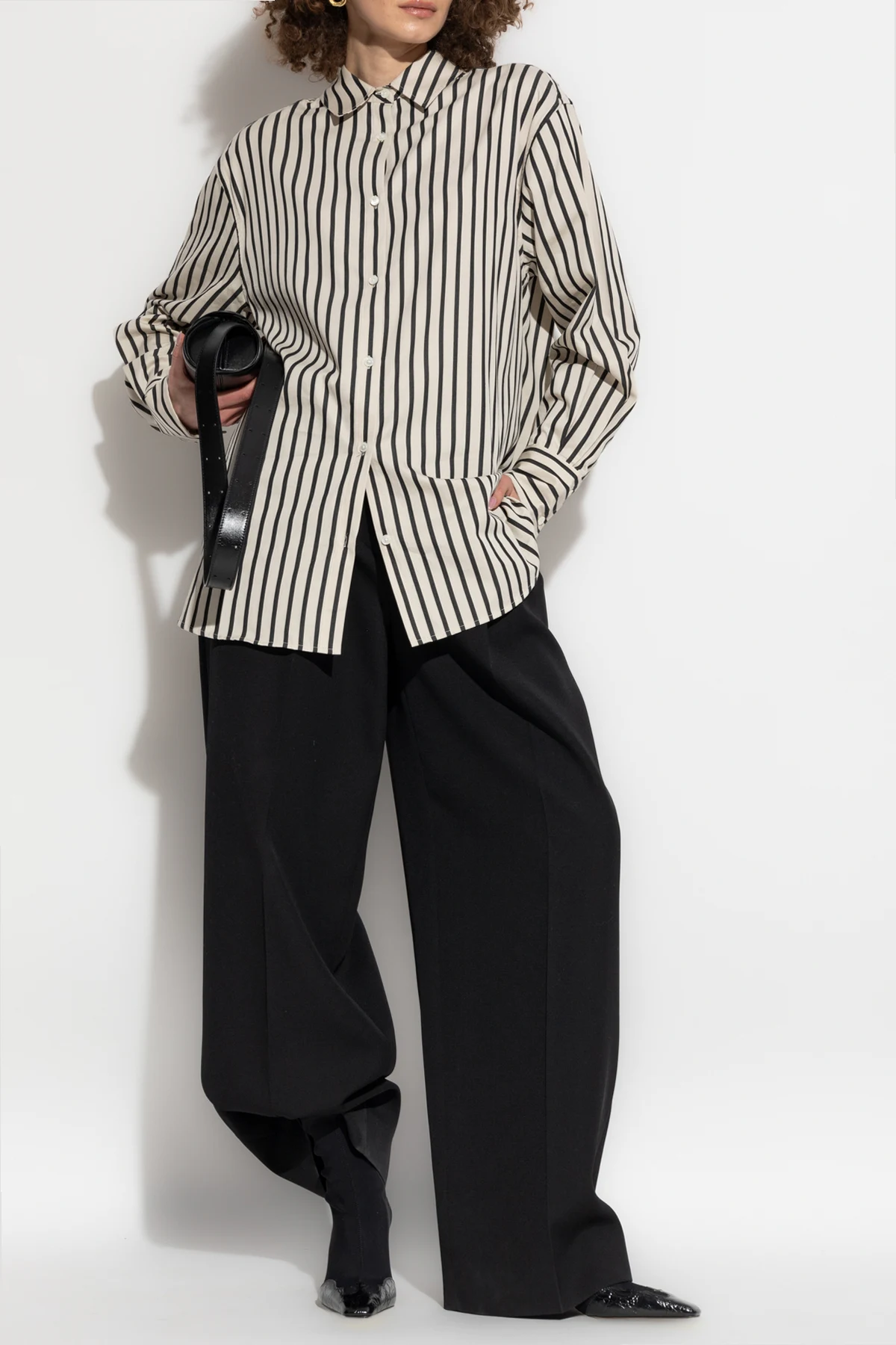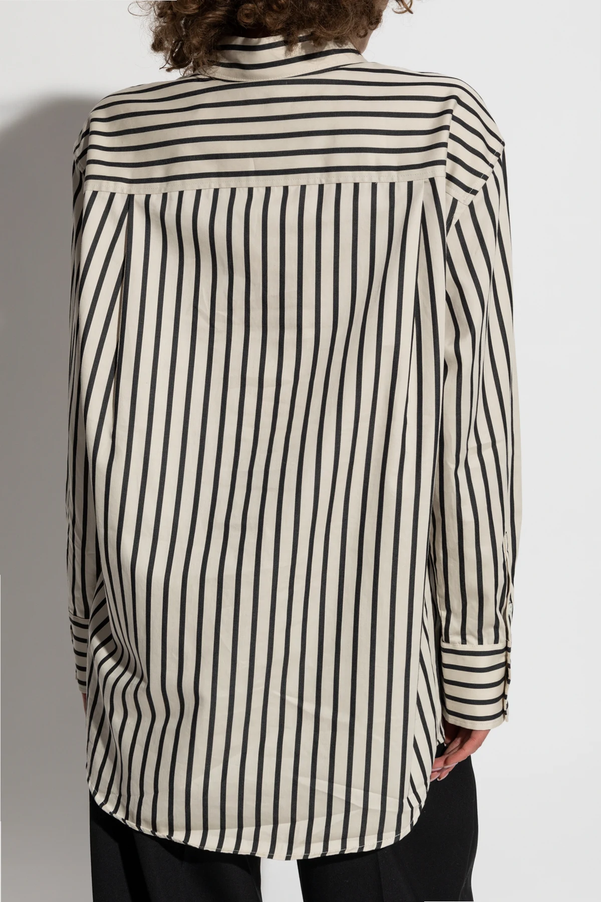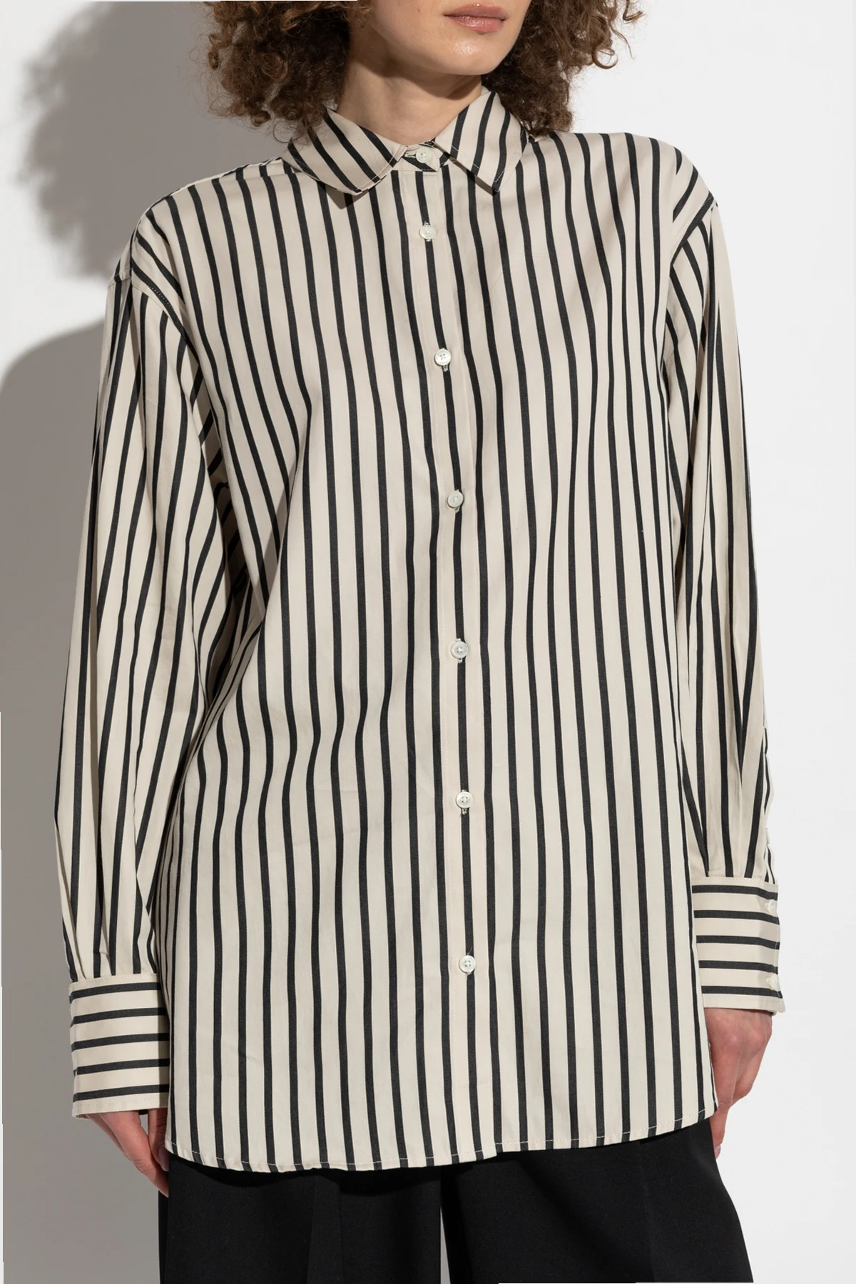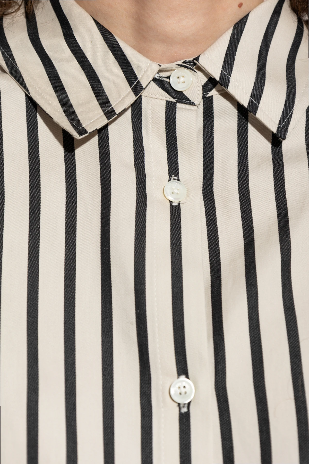 Wir präsentieren das Hemd 'Plaza' aus der exklusiven Kollektion der Marke Anine Bing, die skandinavische Einfachheit mit amerikanischer Energie vereint. Dieses creme-schwarze Hemd mit vertikalen Streifen strahlt klassischen und eleganten Stil aus, ideal für formelle Outfits.