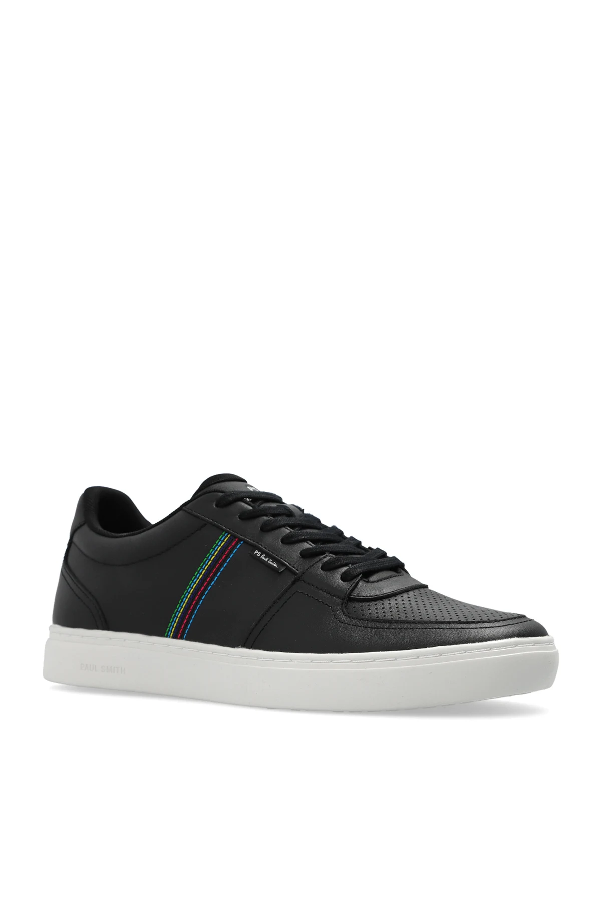 Black ‘Marga Te’ sneakers from PS Paul Smith. Made of leather, this lace-up model sits on a white rubber sole and showcases the brand's logo, decorative perforations and colourful stitching details.