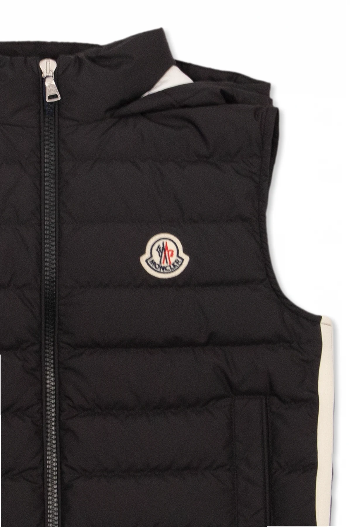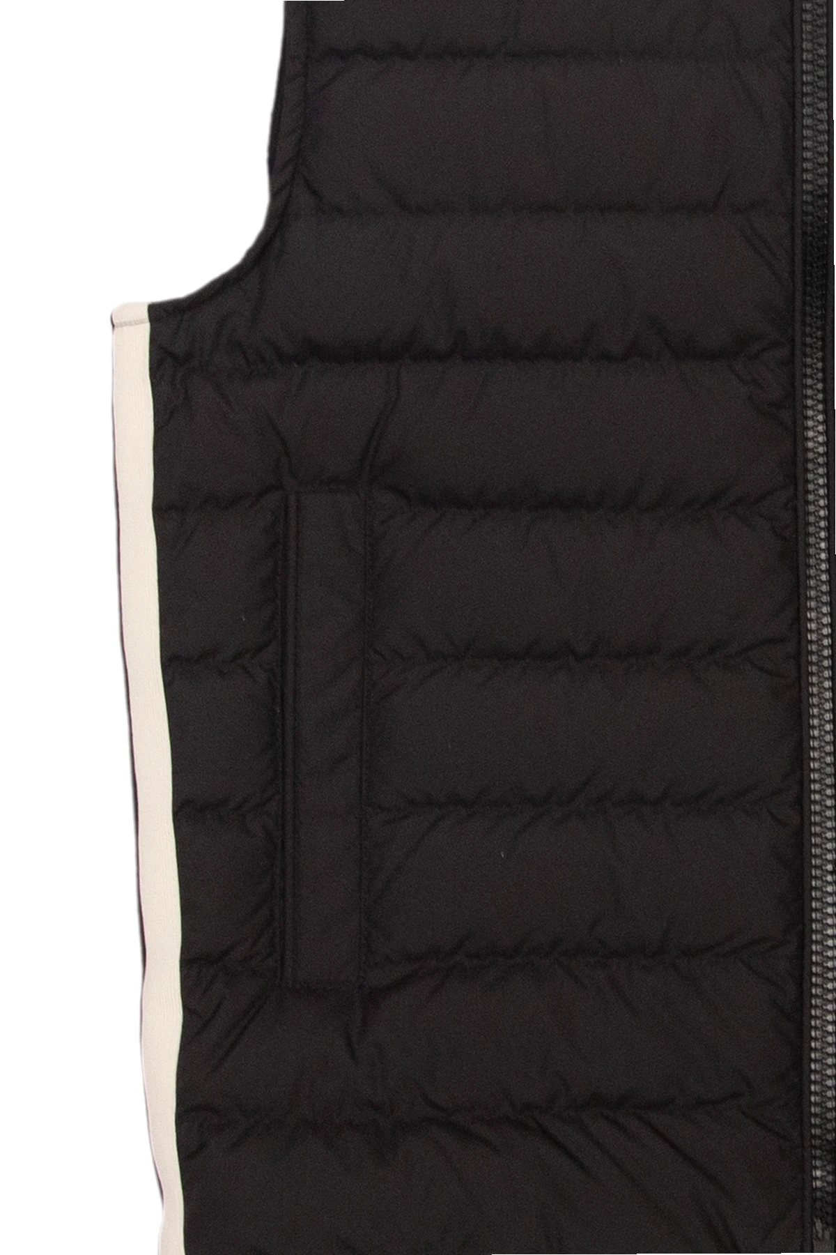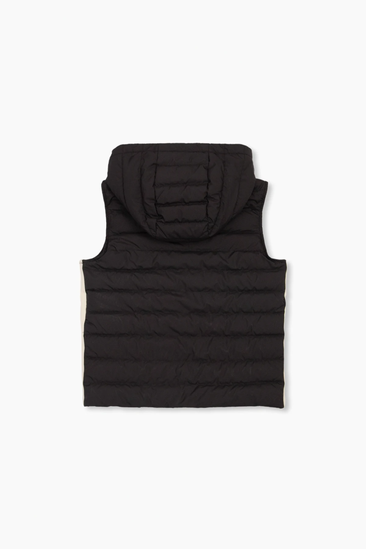 Black and white ‘Kamaria’ quilted hooded down vest from Moncler Enfant. Fastened with a zip, this design features two snap-fastened pockets, a cream logo patch in navy and red as well as side stripes in cream and black.