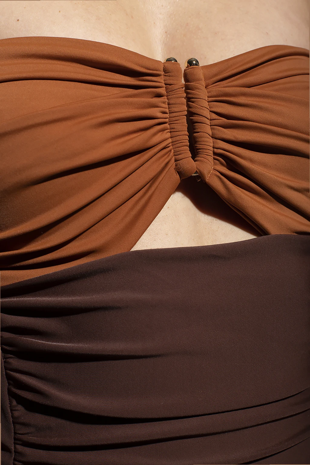 Brown one-piece swimsuit from Self Portrait. Enriched by ruched detailing, this style features adjustable shoulder straps and a drawstring closure on the back.