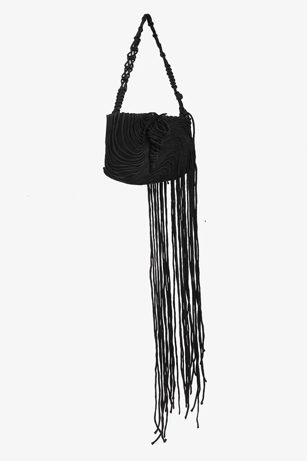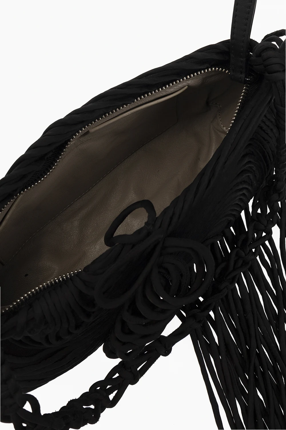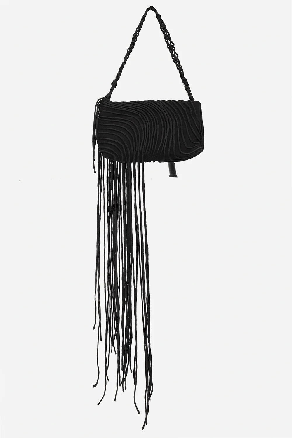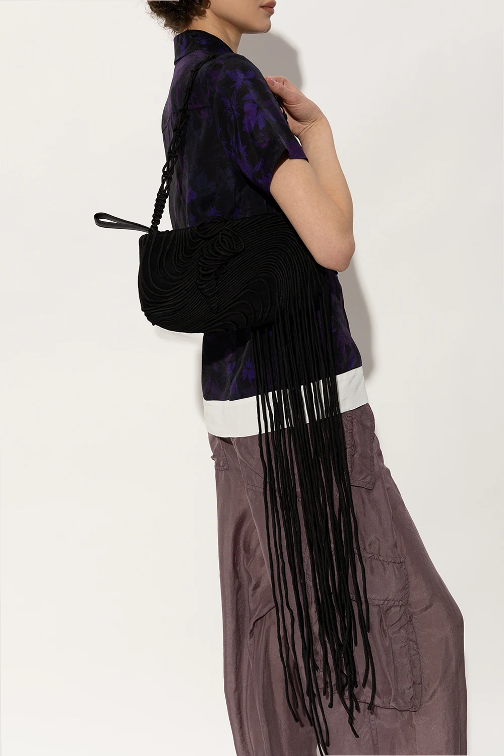 Black shoulder bag from Dries Van Noten. Crafted from silk trimmed with leather, this model fastens with a zip with a wrist strap and is decorated with a wave pattern and fringes. It is complete with a decorative woven shoulder strap, silver-tone metal hardware and one internal compartment with one slip pocket.