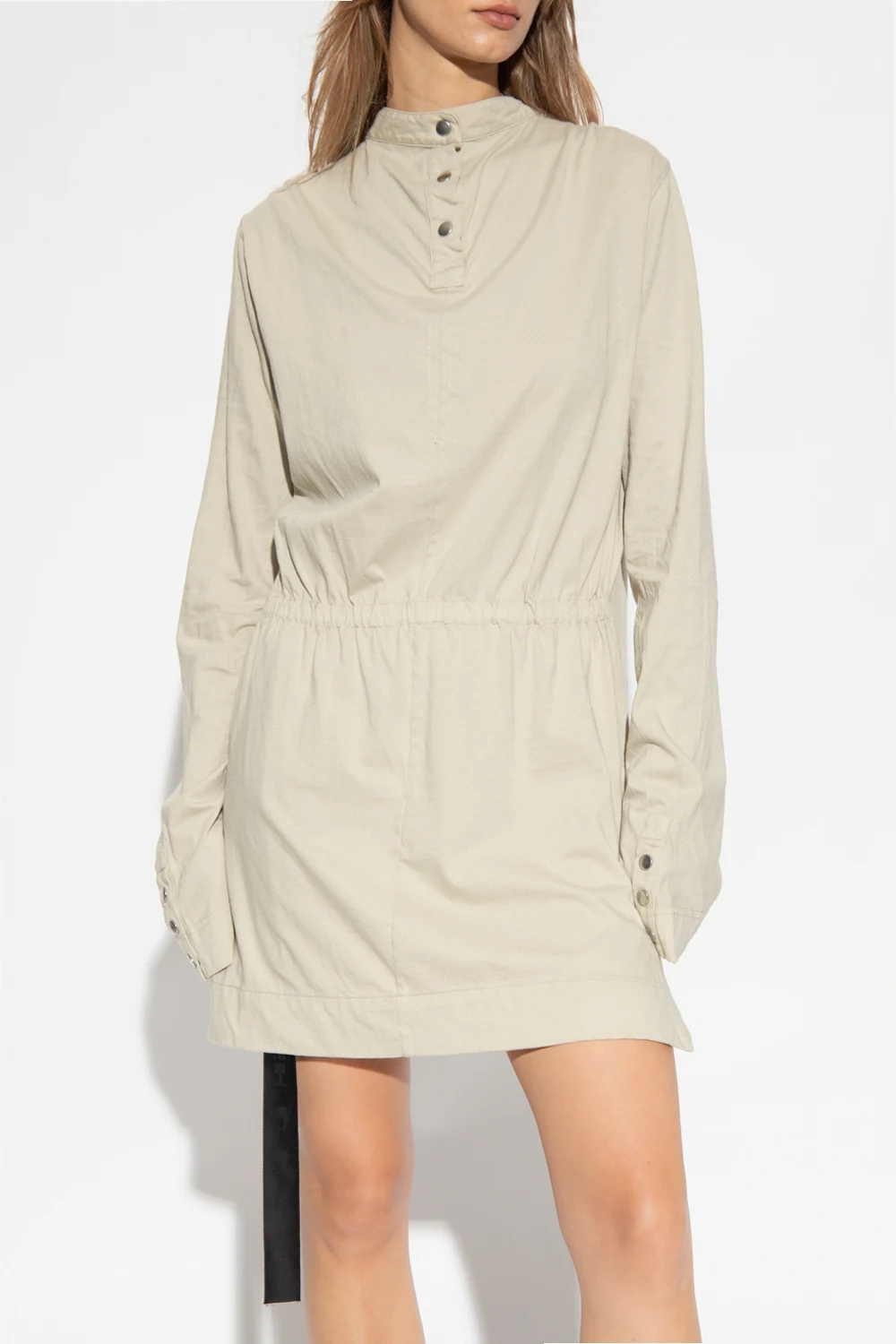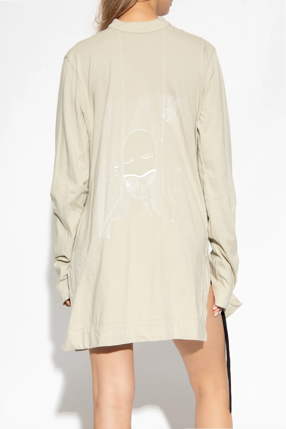 Light grey top with a high neck from Rick Owens DRKSHDW. Made of cotton. Fastened with snaps at the back, this design features a white print, side vents and long sleeves with snap-fastened cuffs.