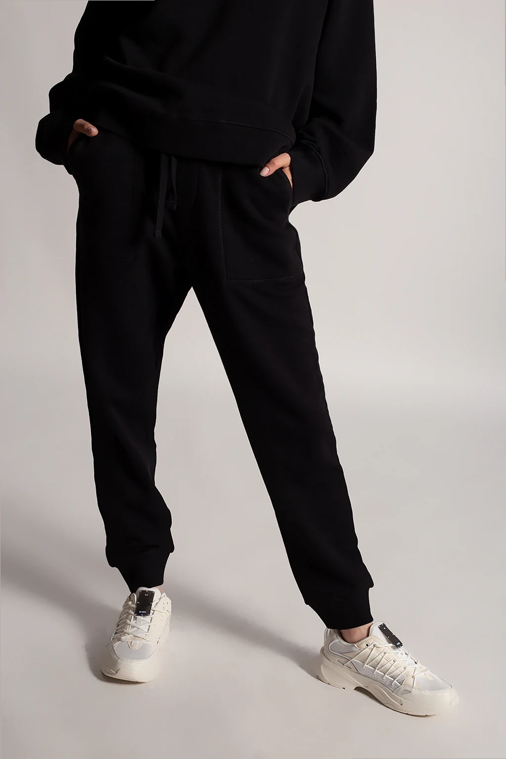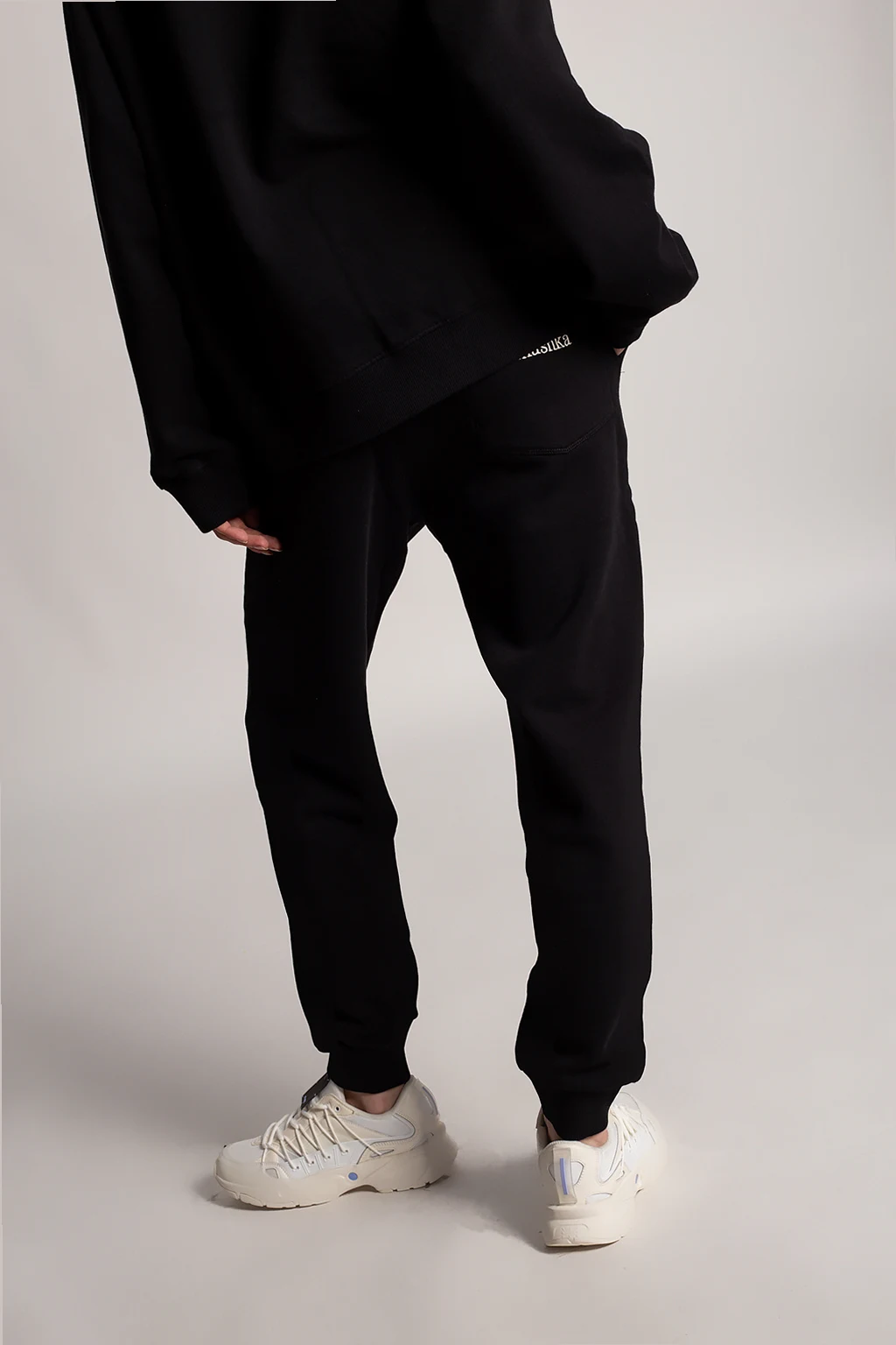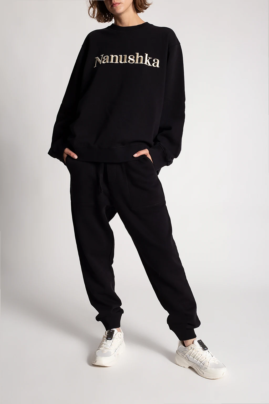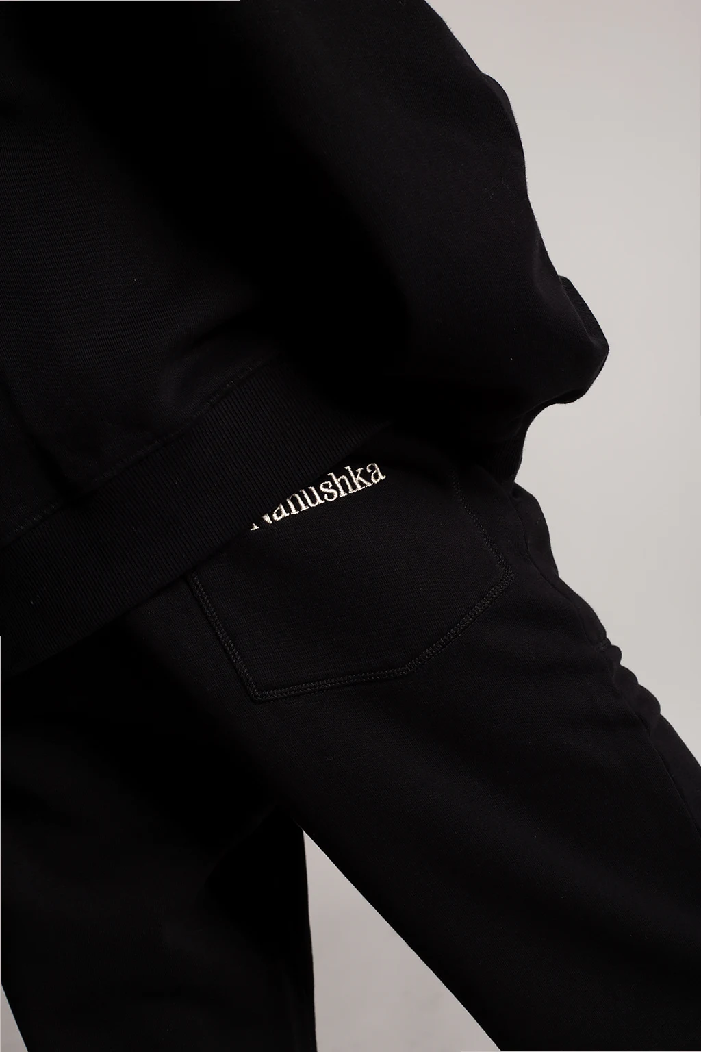 Black sweatpants from Nanushka. Crafted from organic cotton, this pair falls down with tapered legs and features a drawstring waist, two side seam pockets and one back slip pocket accompanied by white logo embroidery.
