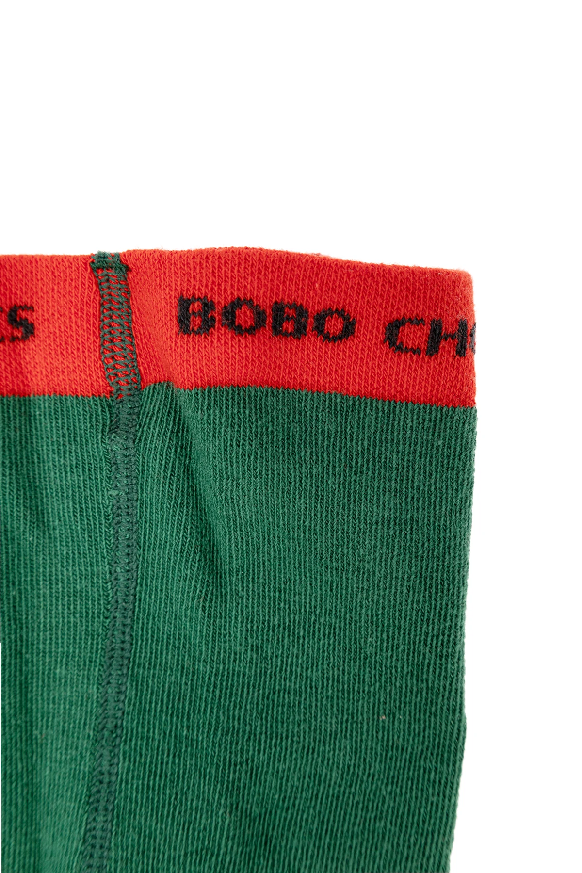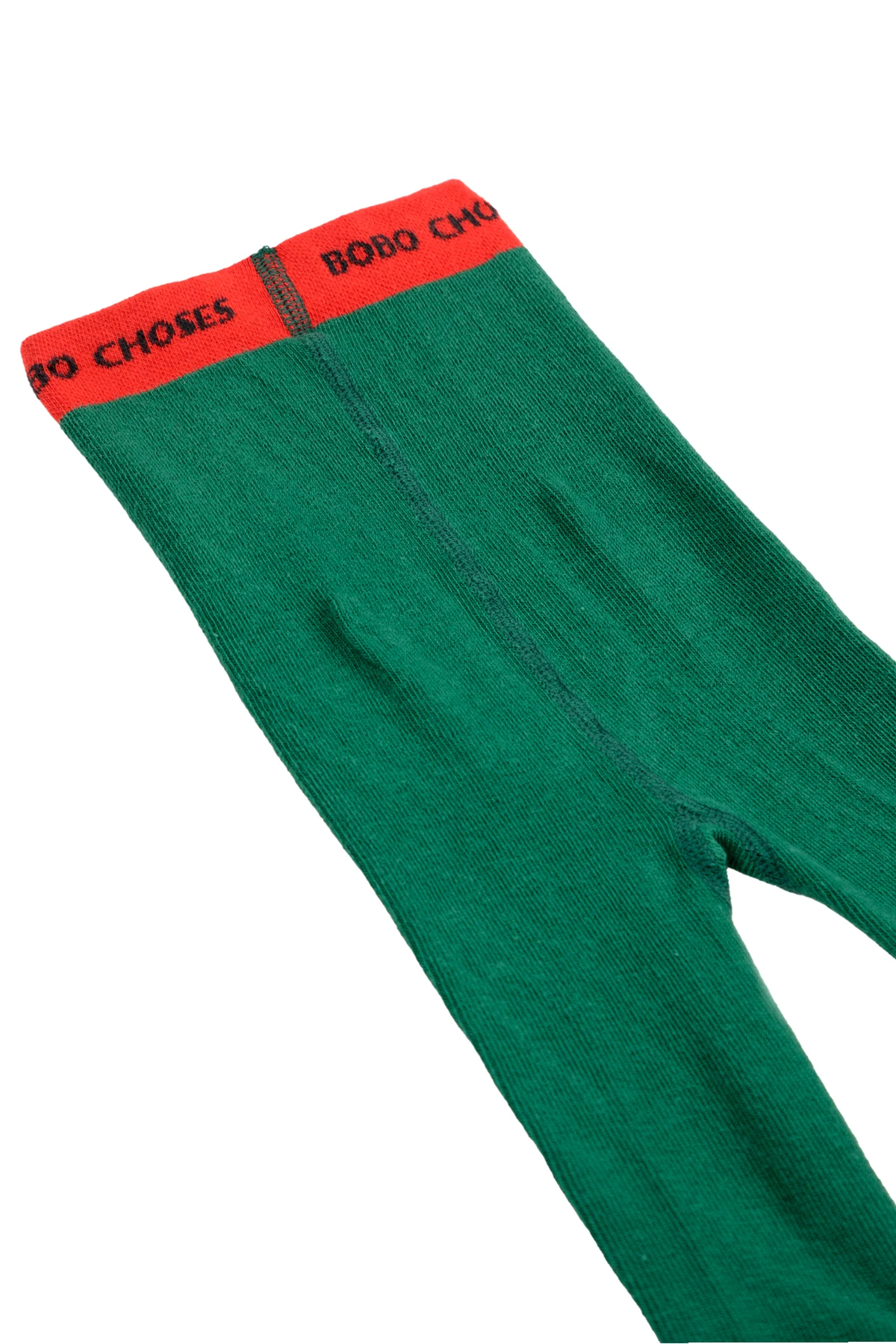 Die dominierende Farbe ist Grün, mit kontrastierenden roten Elementen an den Zehenenden, Fersen und einem breiten, elastischen Bund. Auf dem grünen Teil ist das weiße Logo "BOBO" sichtbar, und auf dem roten Bund wiederholt sich der Schriftzug "BOBO CHOSES" in Schwarz, was den Strumpfhosen einen einzigartigen Charakter verleiht.