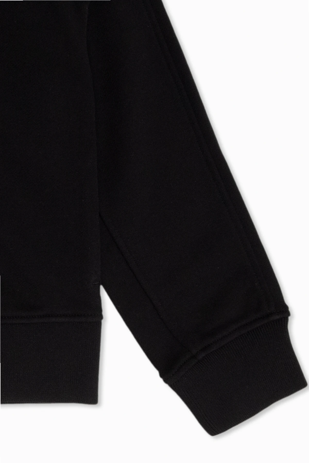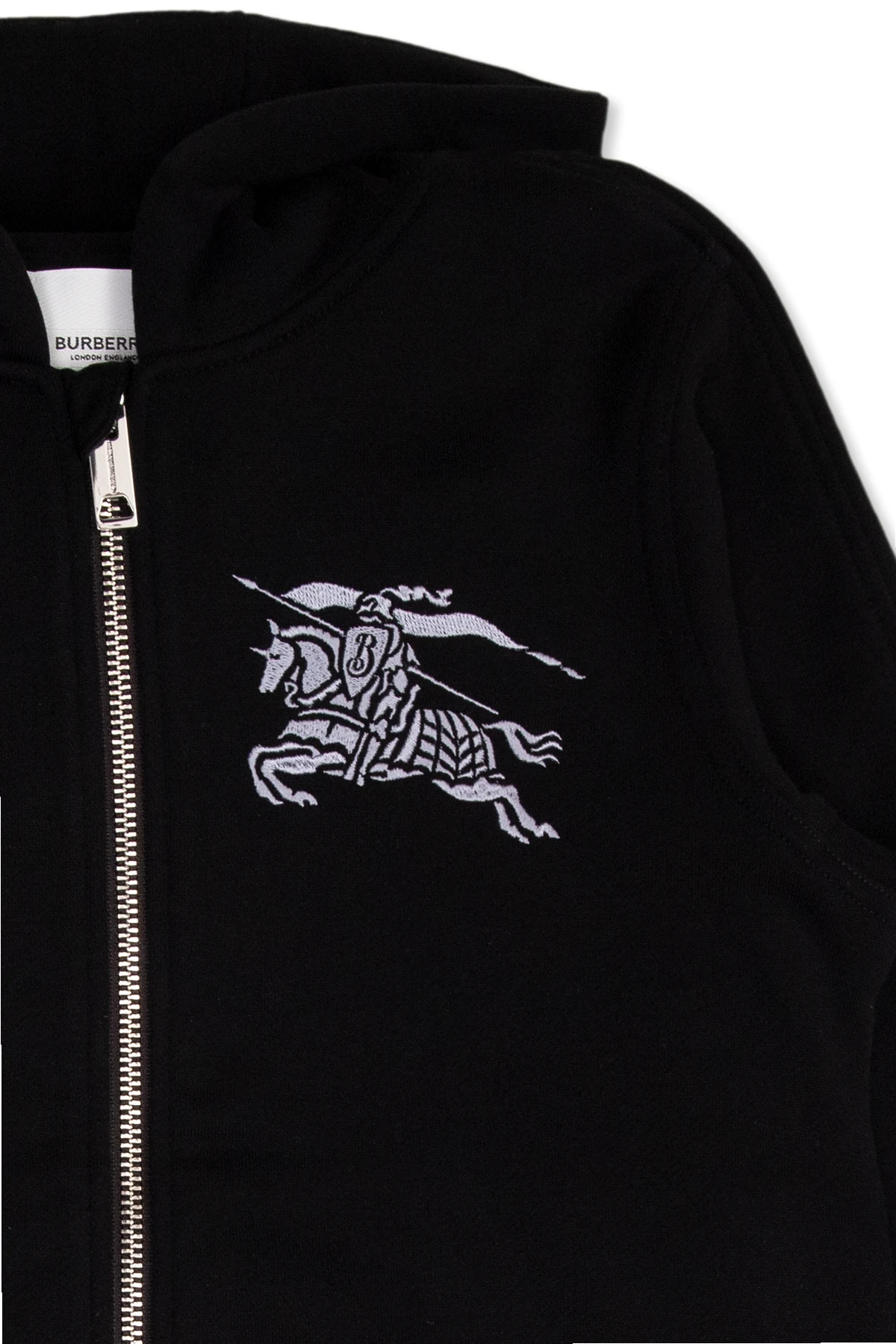 Black ‘Devan’ hoodie from Burberry. Made from organic cotton, this style fastens with a zip and features grey logo embroidery on the front, two slip pockets, long sleeves and ribbing on the edges.