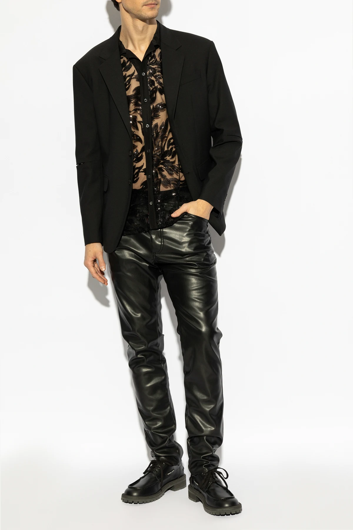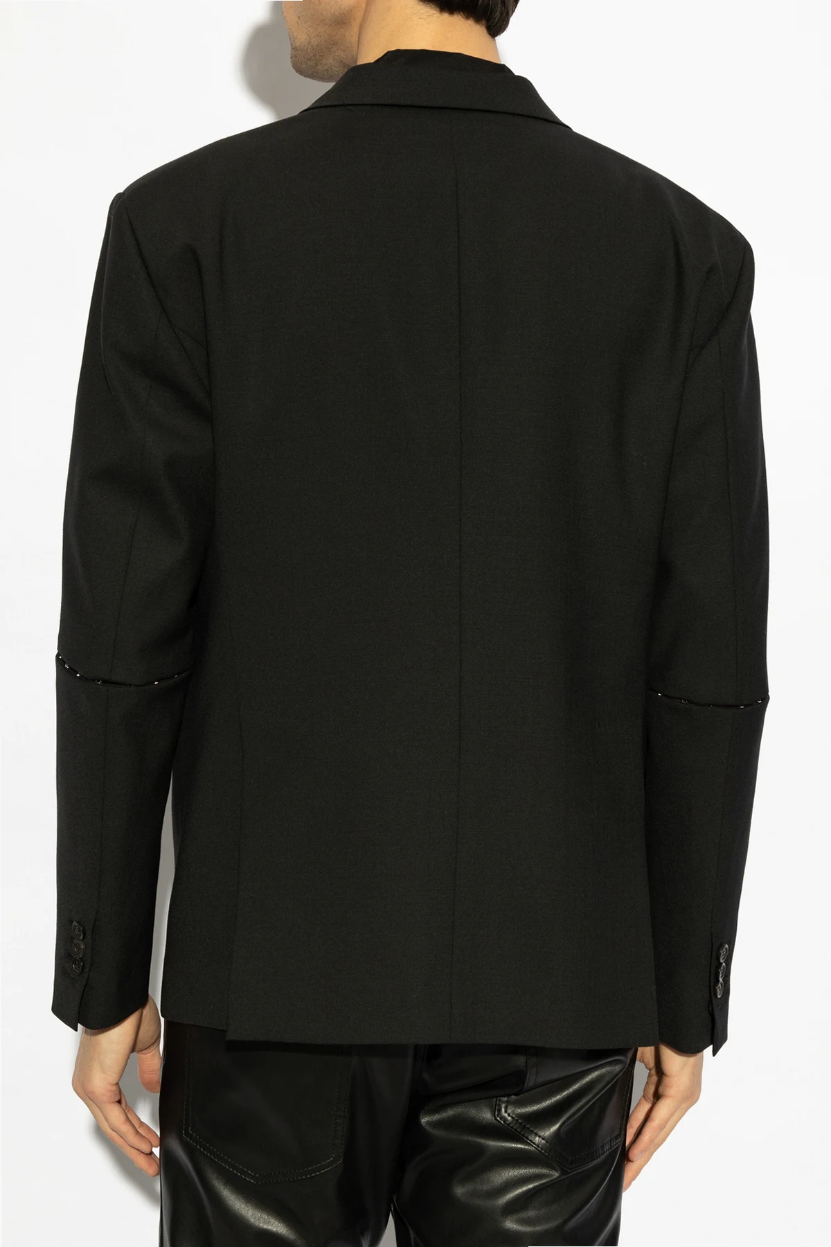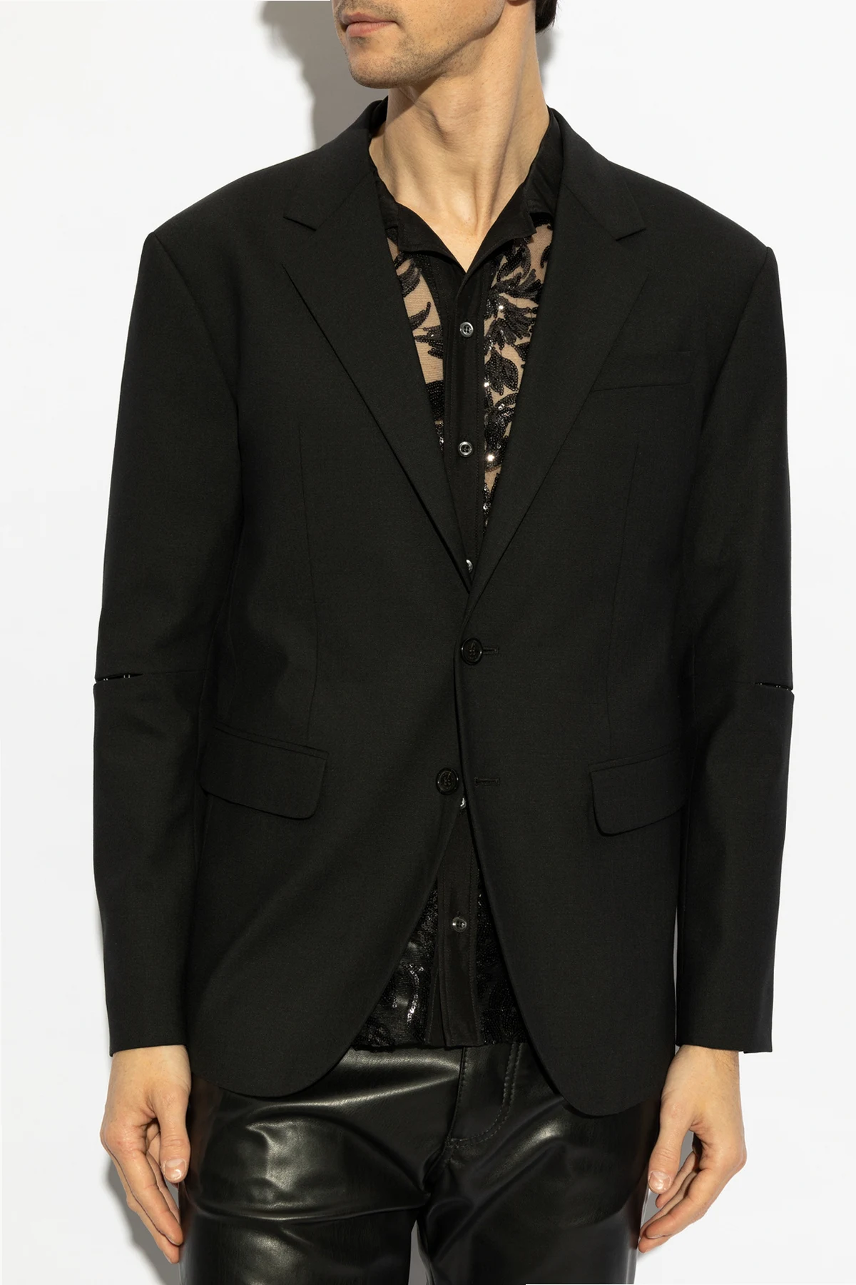 Gefertigt aus hochwertigem Stoff, der Polyester, Wolle und Elastan vereint, beeindruckt das Sakko mit seiner glatten, schwarzen Oberfläche . Das zweireihige Knopfverschluss und die dekorativen Nähte an den Ärmeln verleihen eine moderne Finesse. Klassische Spitzrevers und ein einzelner Rückenschlitz sorgen für Komfort und Bewegungsfreiheit.