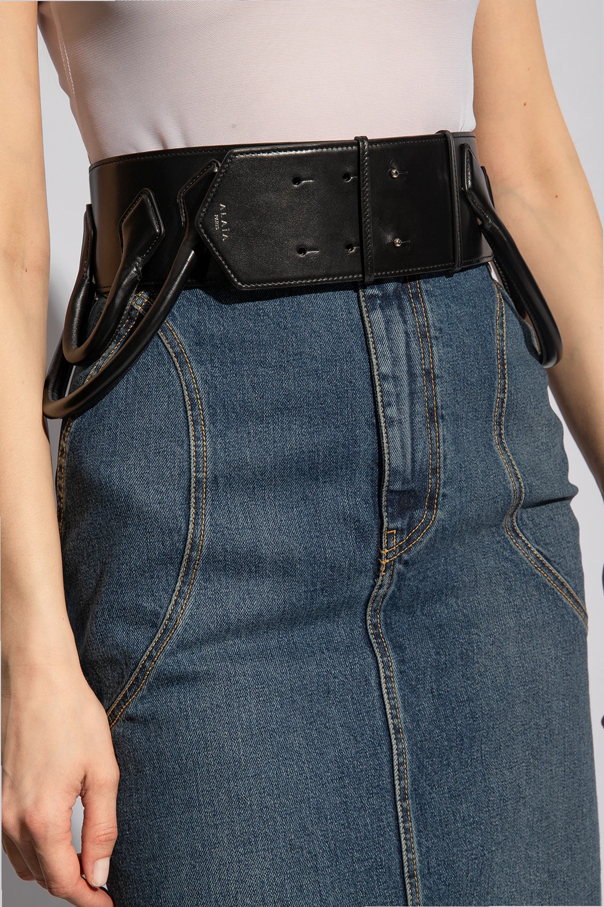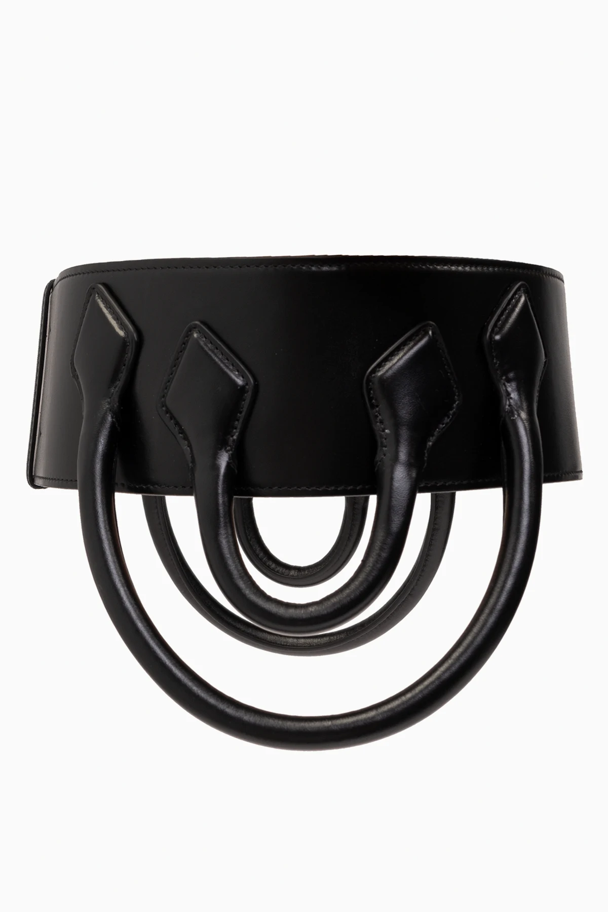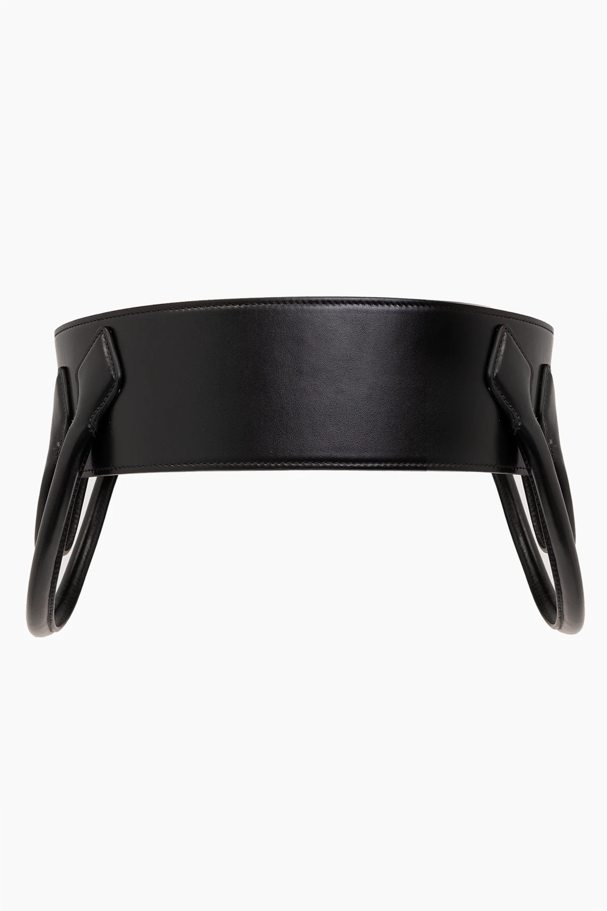Black wide waist belt from Alaia. Made from calf leather, this item showcases a silver-tone logo on the front and decorative double handles on the sides.