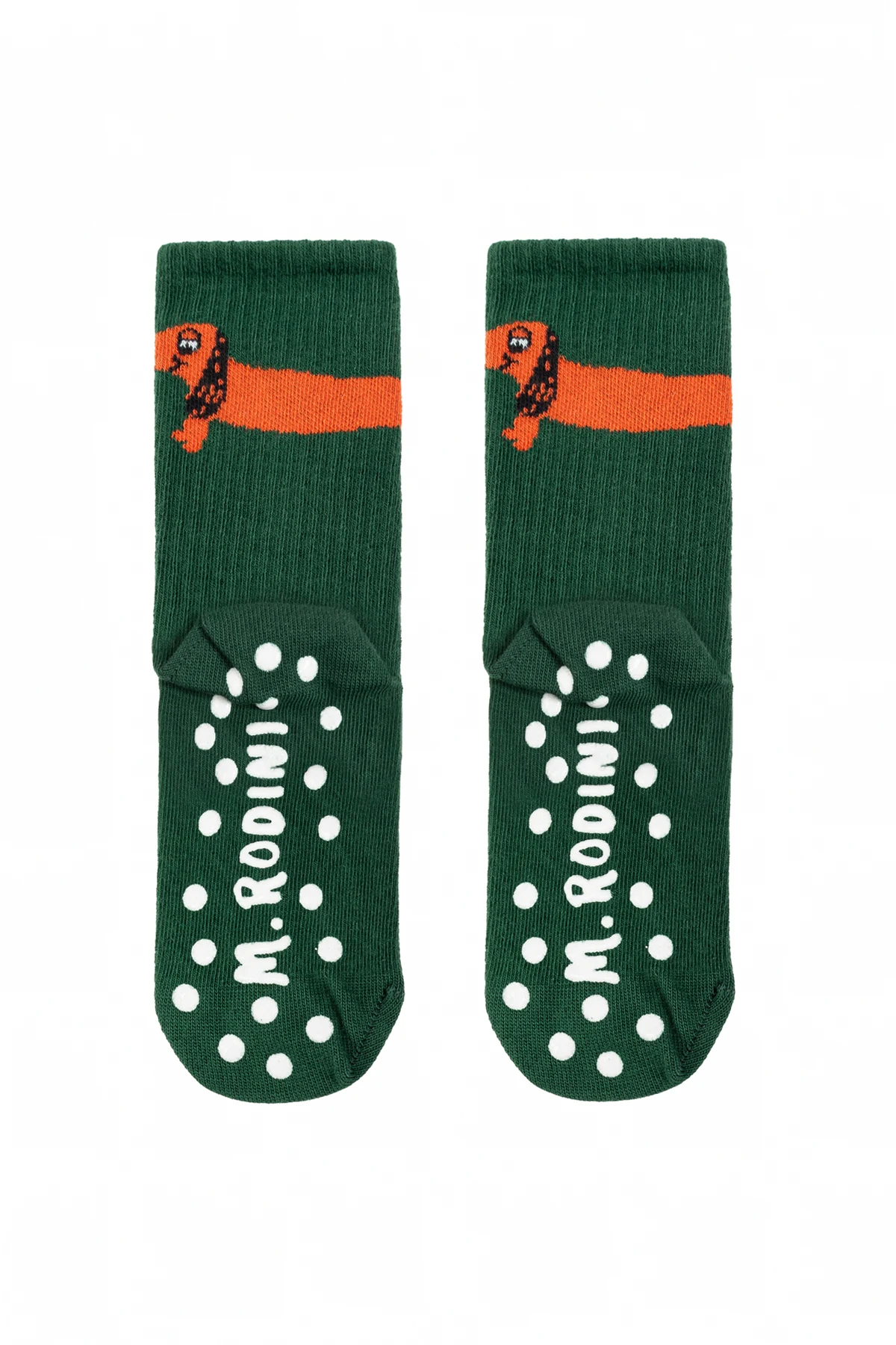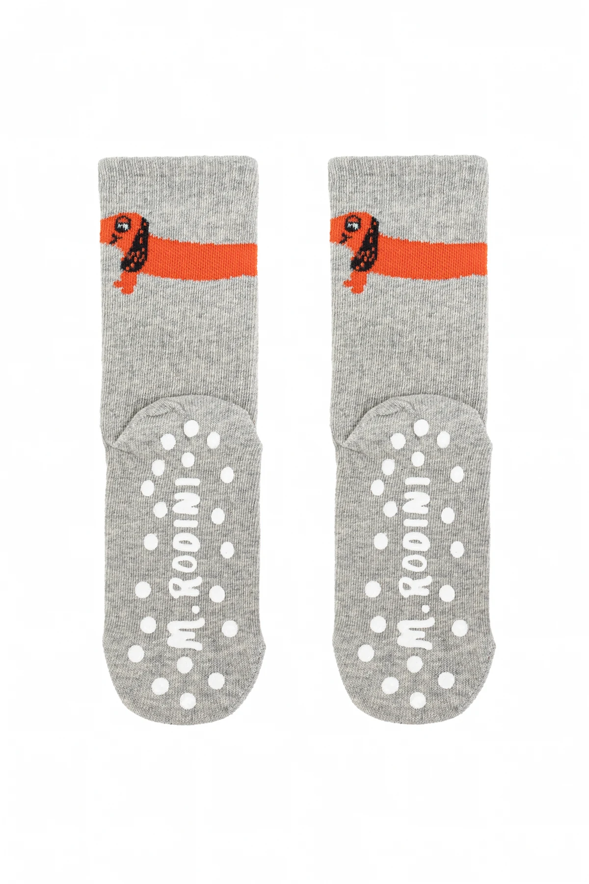 Einzigartiger Schriftzug "MR RODINI" auf der Sohle der grauen Socken.