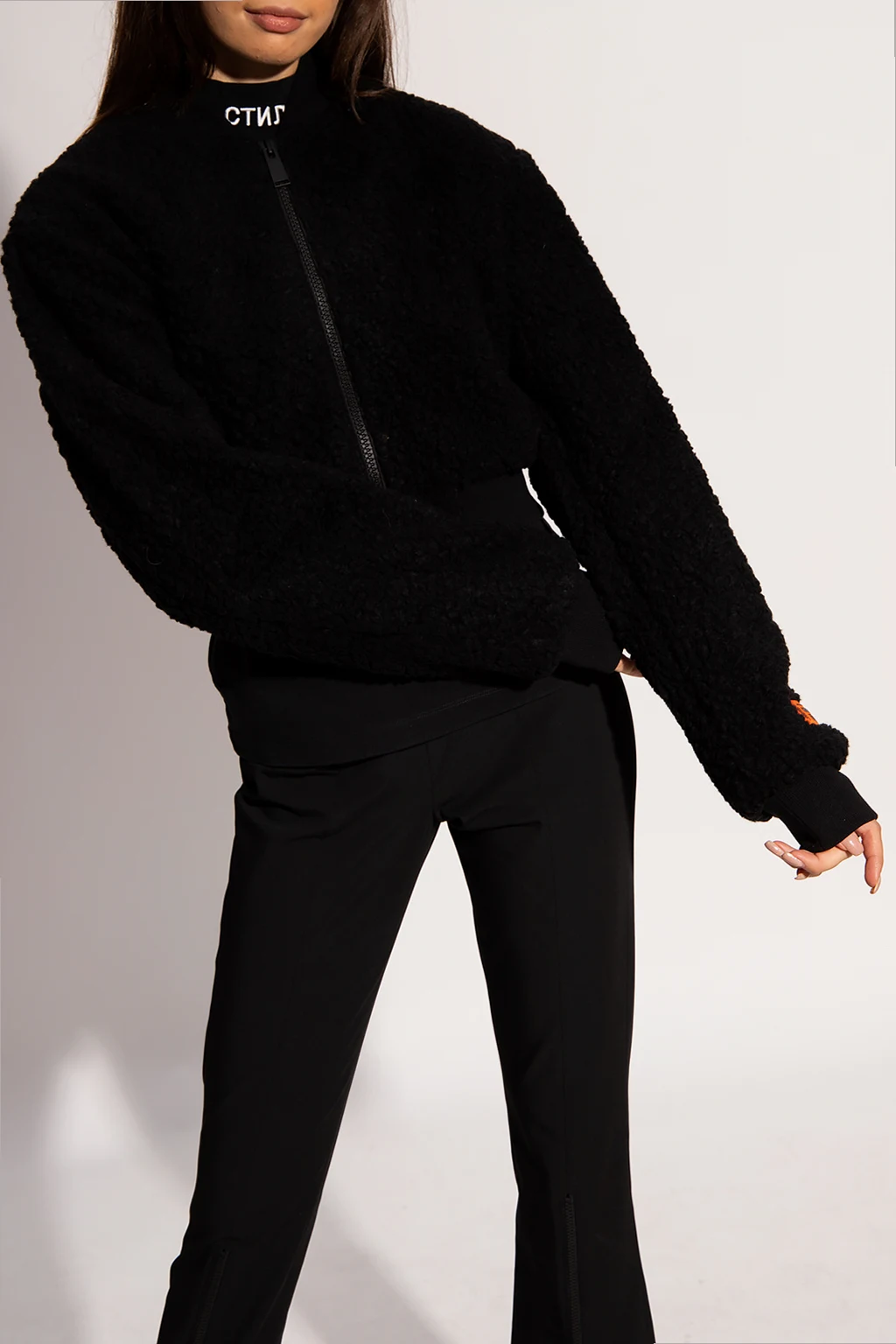 Black bomber jacket from Heron Preston. Emblazoned with a logo patch, this style features a zip fastening and rib detailing on the collar, bottom hem and cuffs.