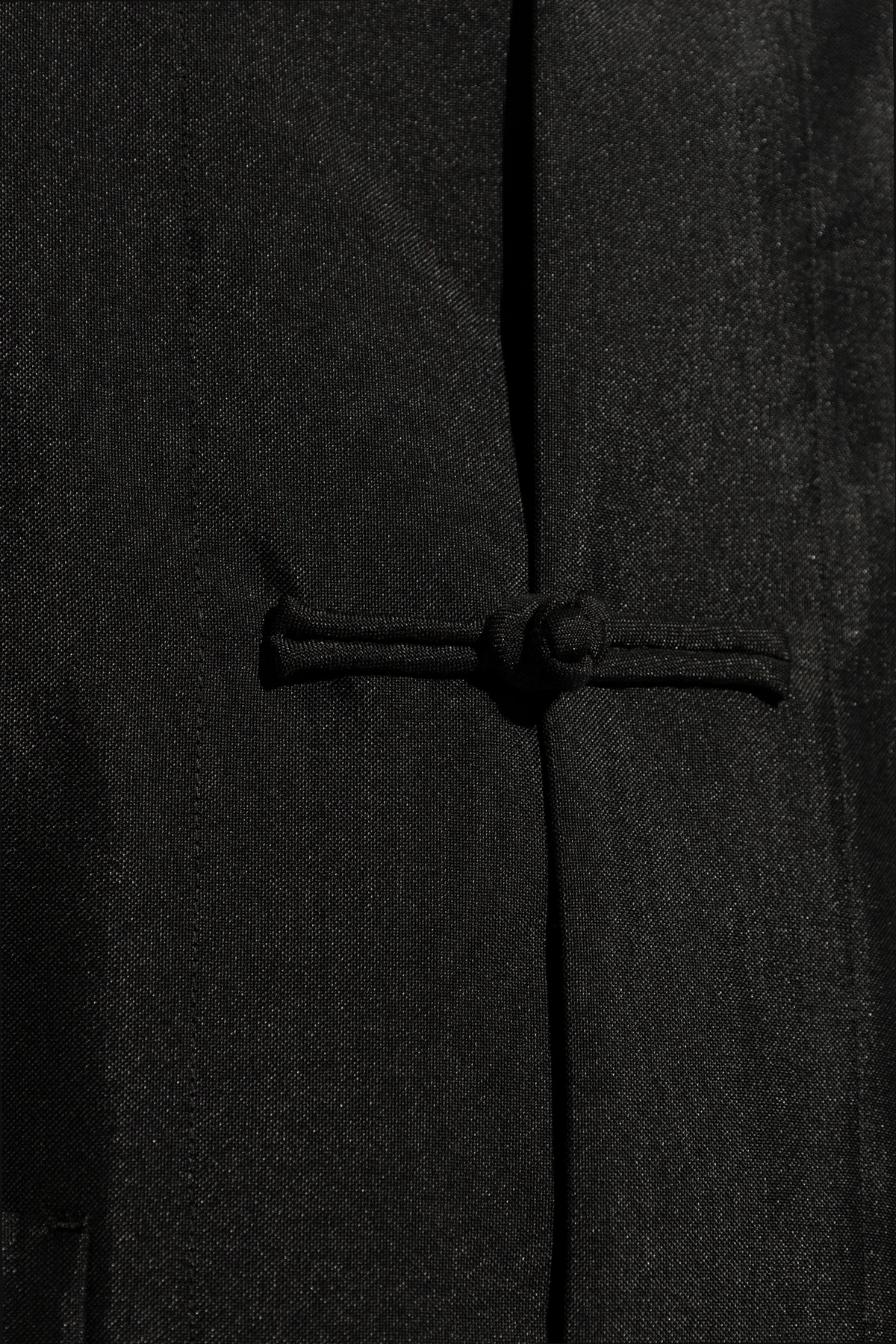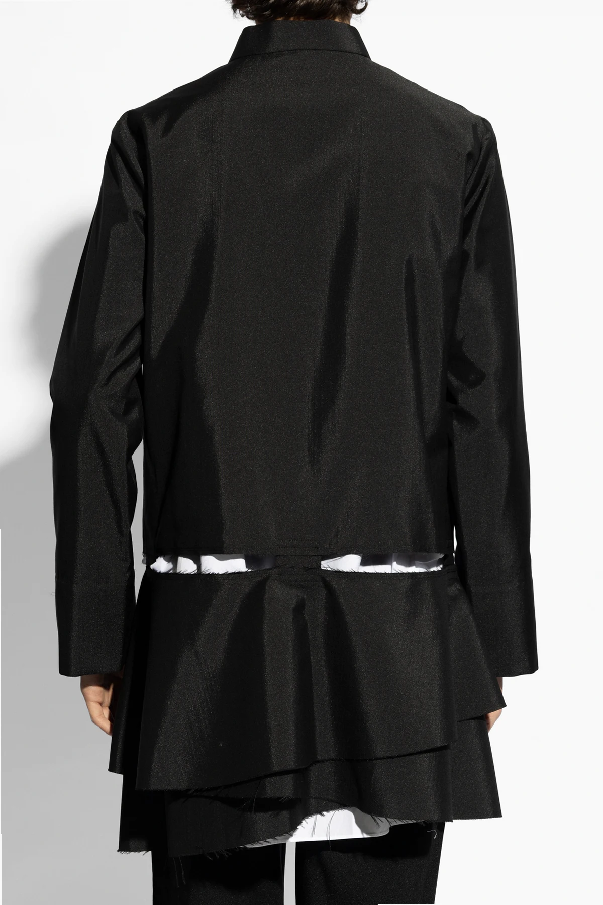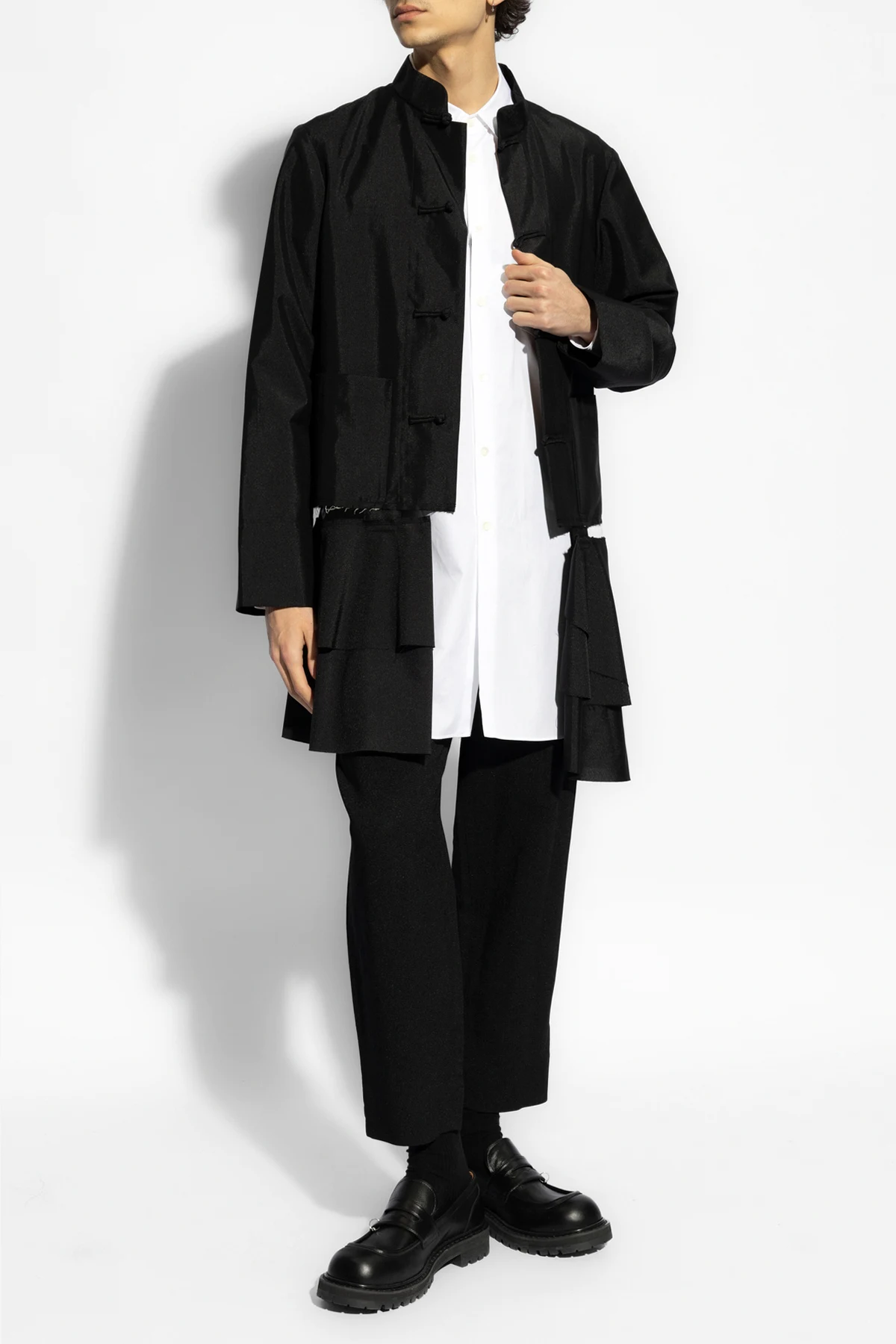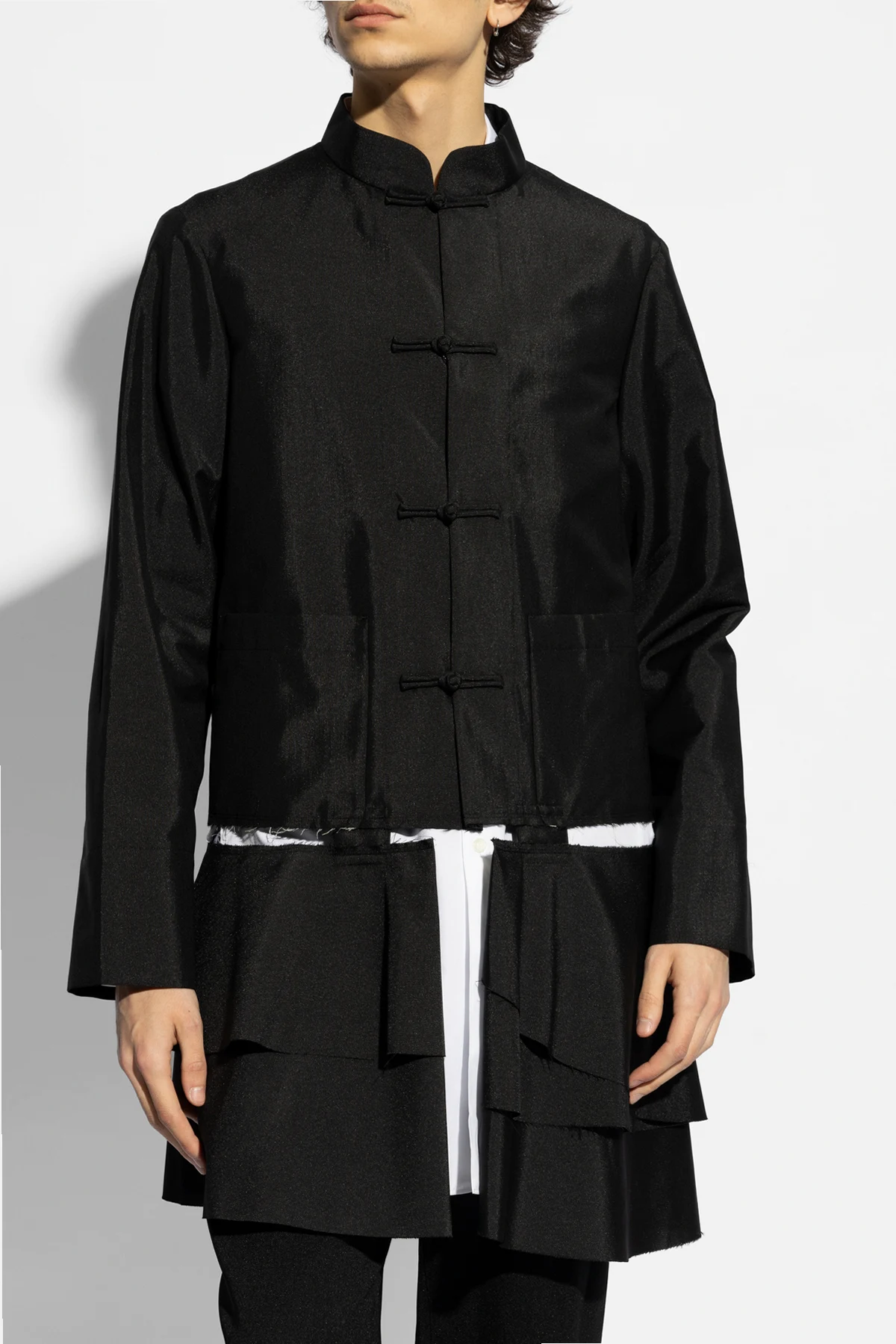 Black blazer with a standing collar from Comme des Garcons. Crafted with a vintage effect, this style features a decorative opening, two frontal pockets and ornamental button closures.