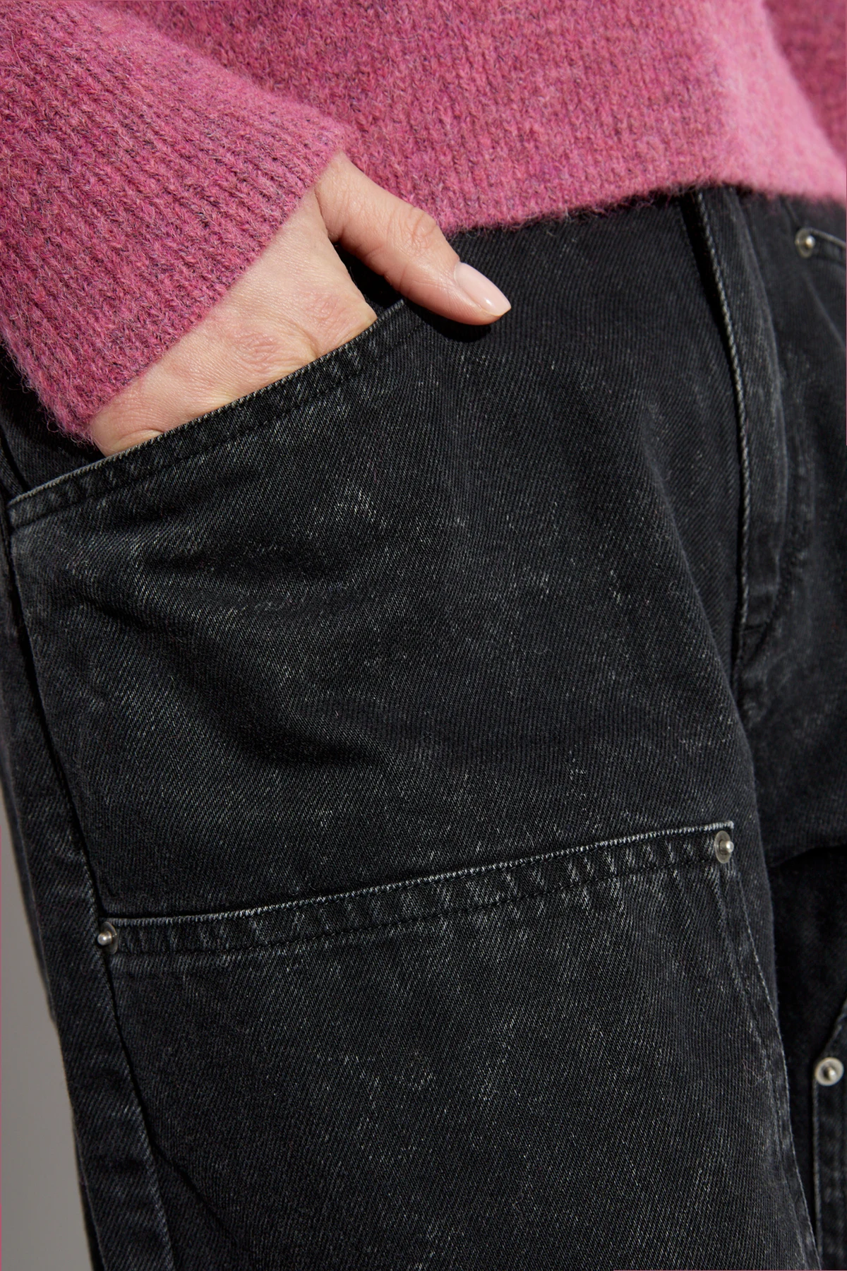Charakteristische Nähte und Metallnieten an den Taschen verleihen einen einzigartigen Charakter, während zahlreiche Taschen, darunter seitliche und hintere, Funktionalität bieten. Die elegante schwarze Farbe macht die Jeans zu einem universellen Kleiderschrankstück, das zu vielen Outfits passt.