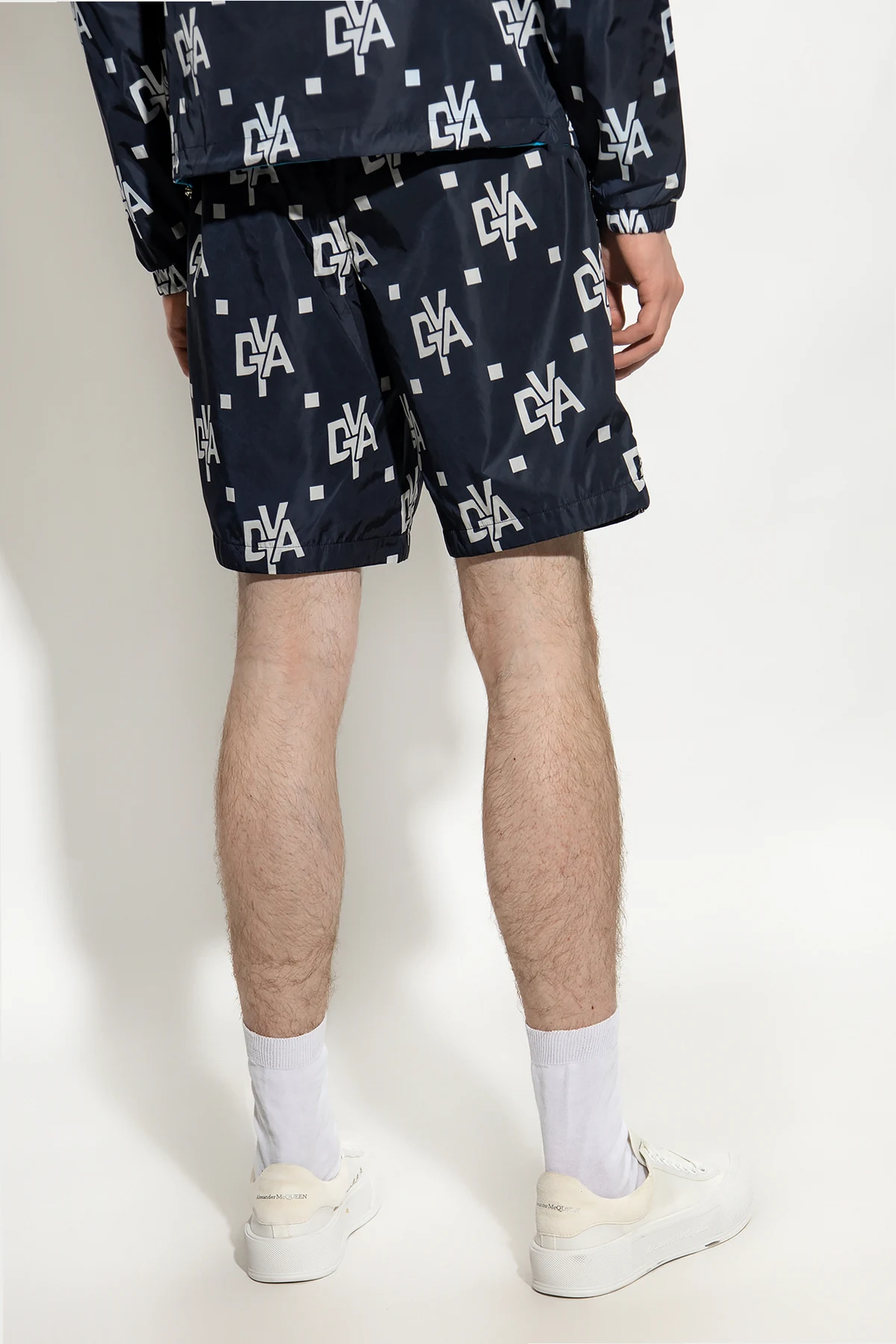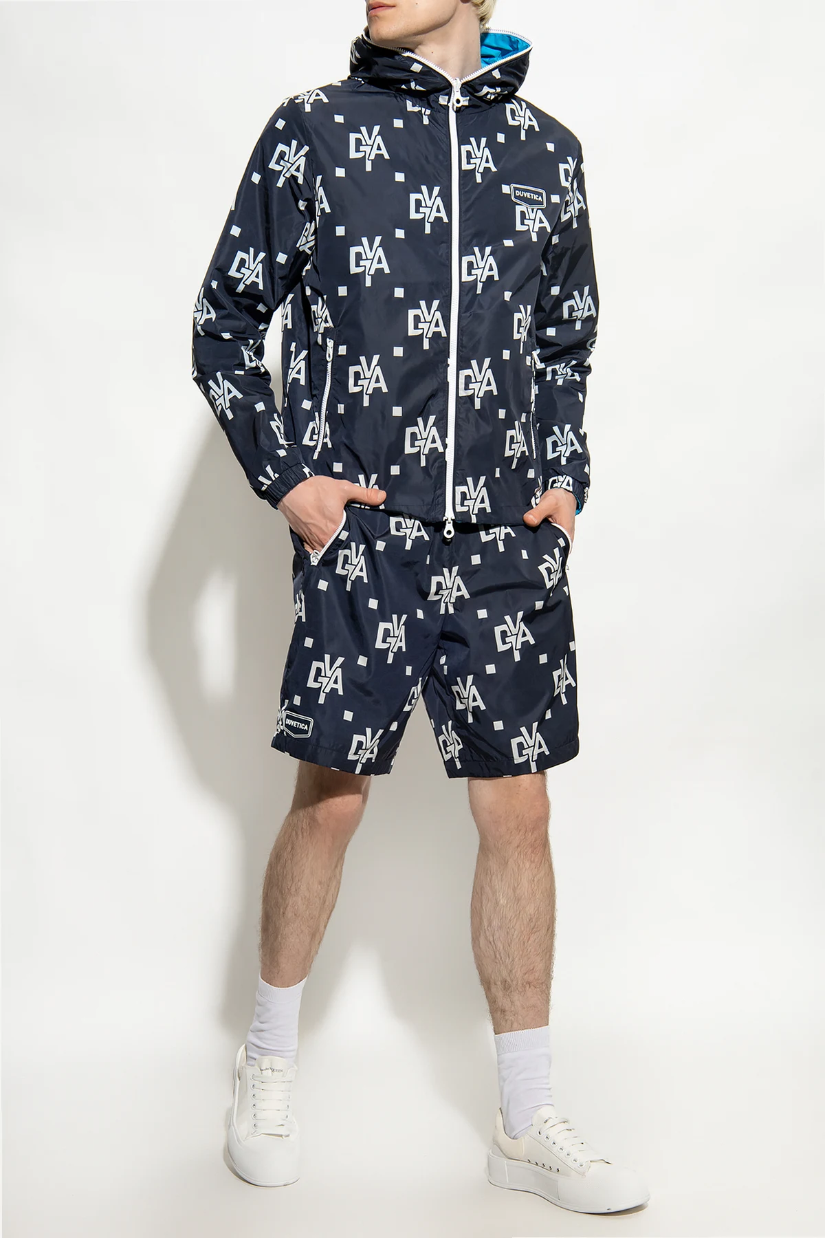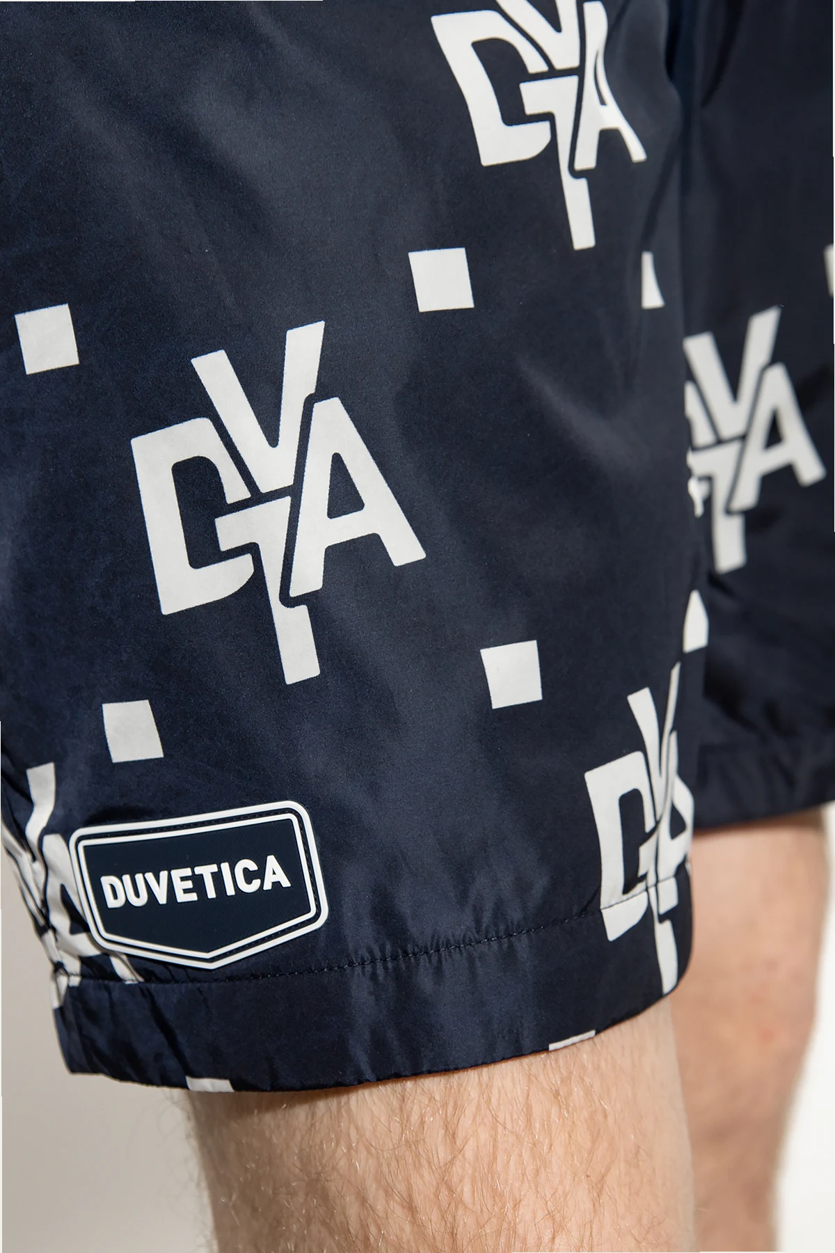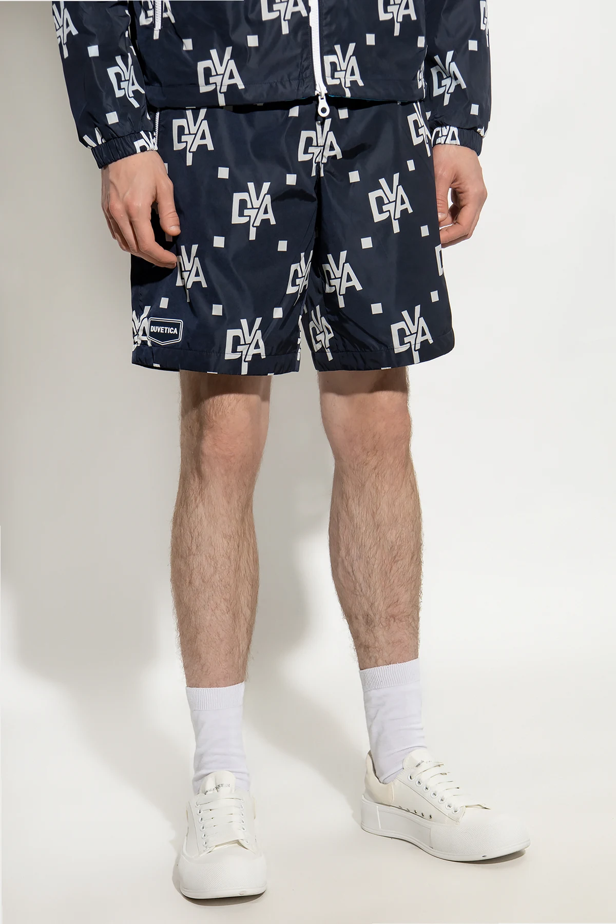 Navy blue ‘Panzani’ shorts from Duvetica. Crafted from fabric which was printed with a white monogram, this pair features a drawstring waistband, logo detailing, two zip pockets accompanied with a rubber patch on the front and one slip pocket at the back.