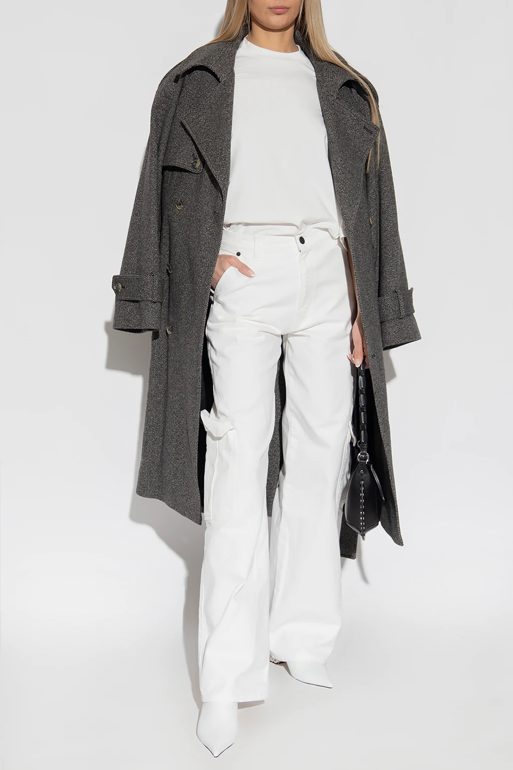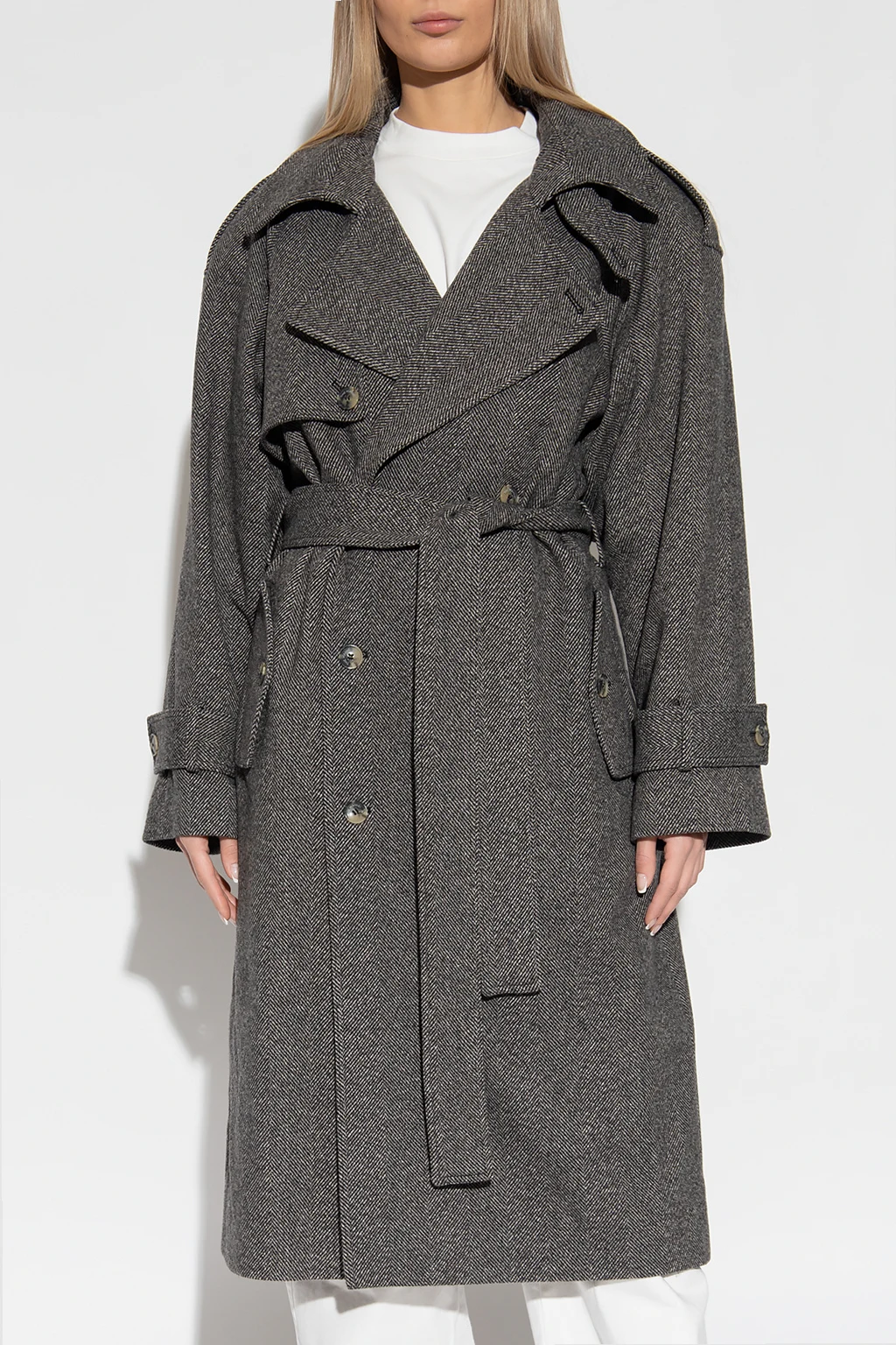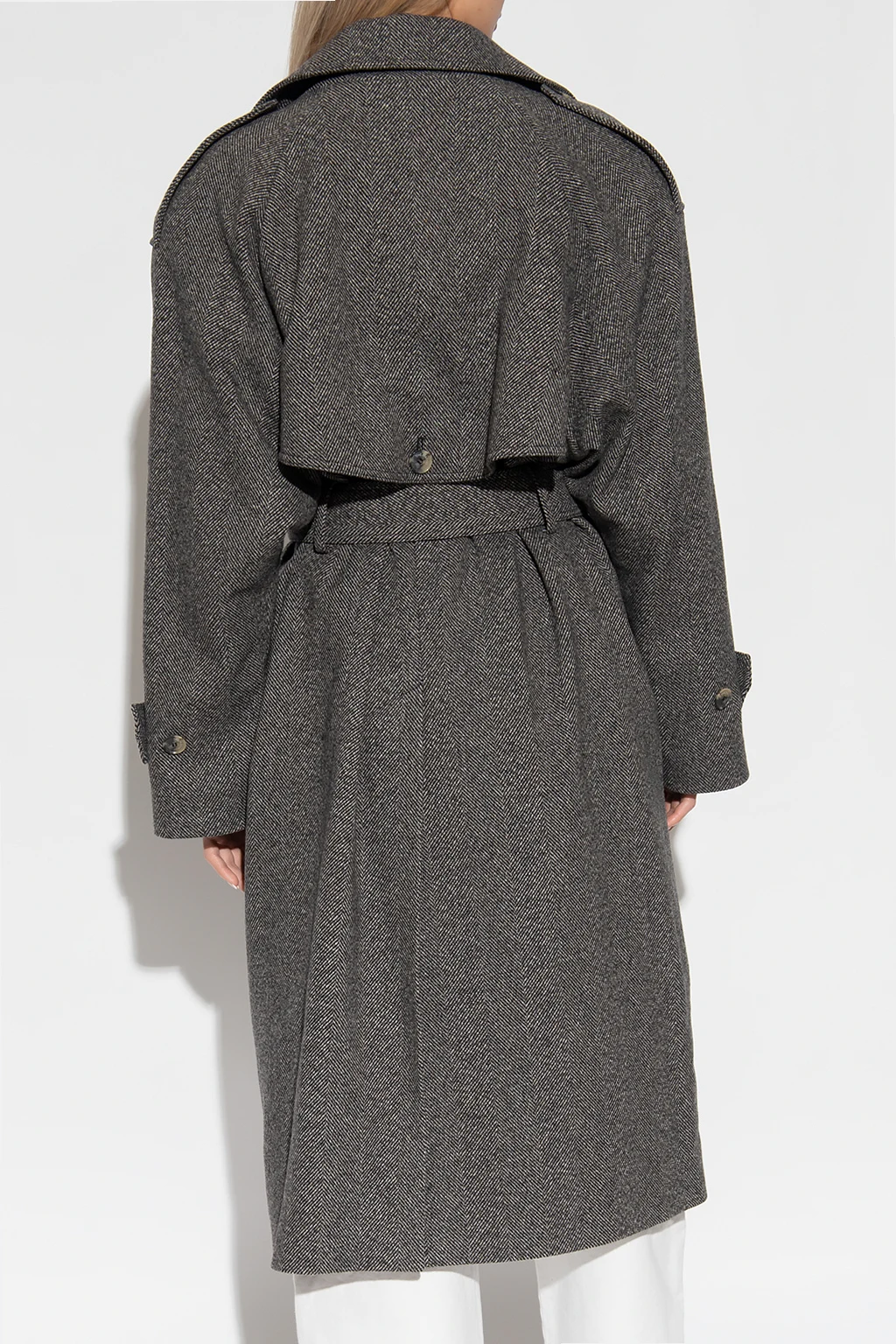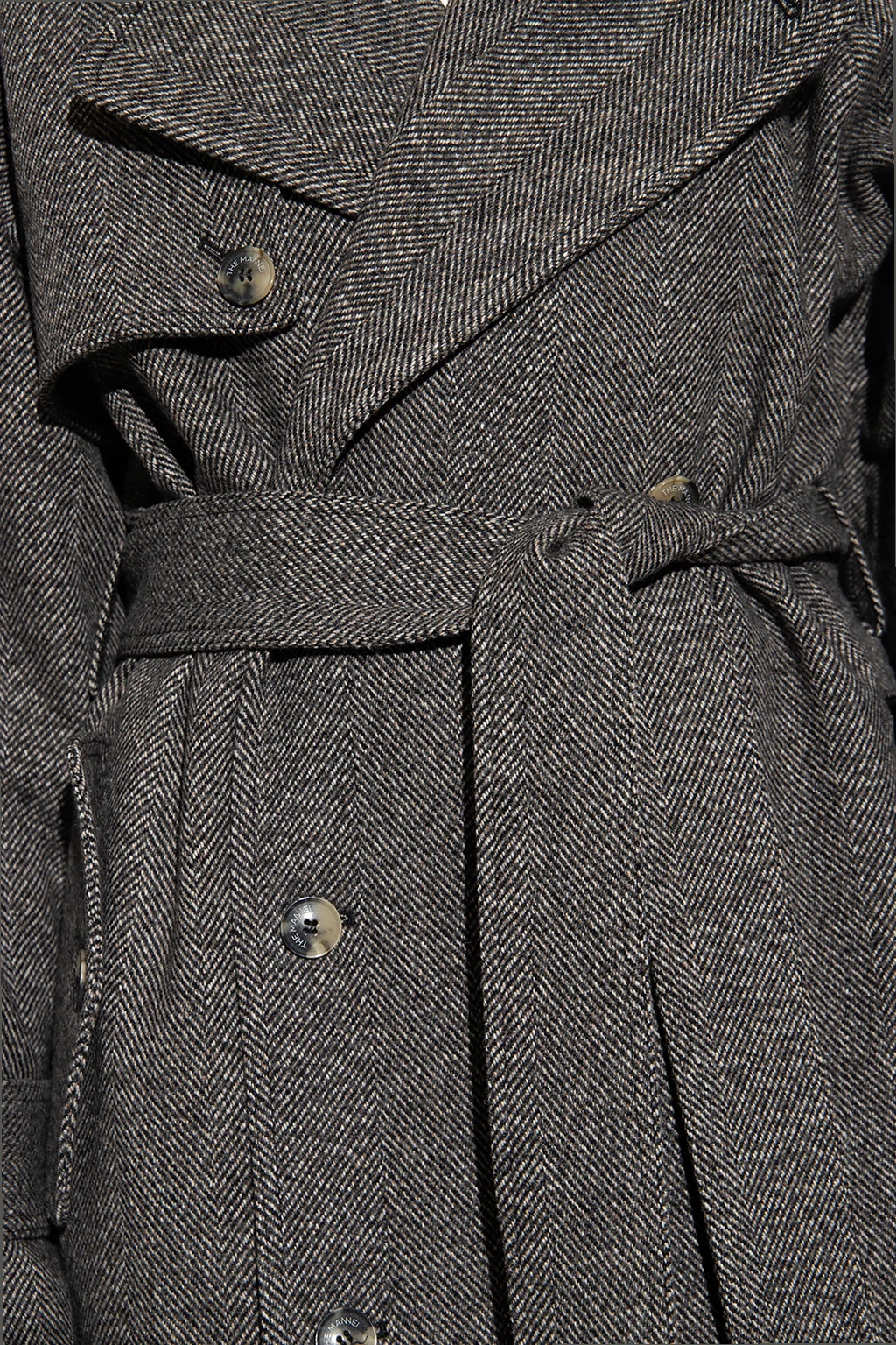 Dark grey ‘Soria’ double-breasted coat from The Mannei. Crafted from a virgin wool blend enriched by a herringbone pattern, this garment features buttons, a collar, epaulettes, storm flap, two buttoned flap pockets, single rear vent and long, loose-fitting sleeves with buttoned cuffs.