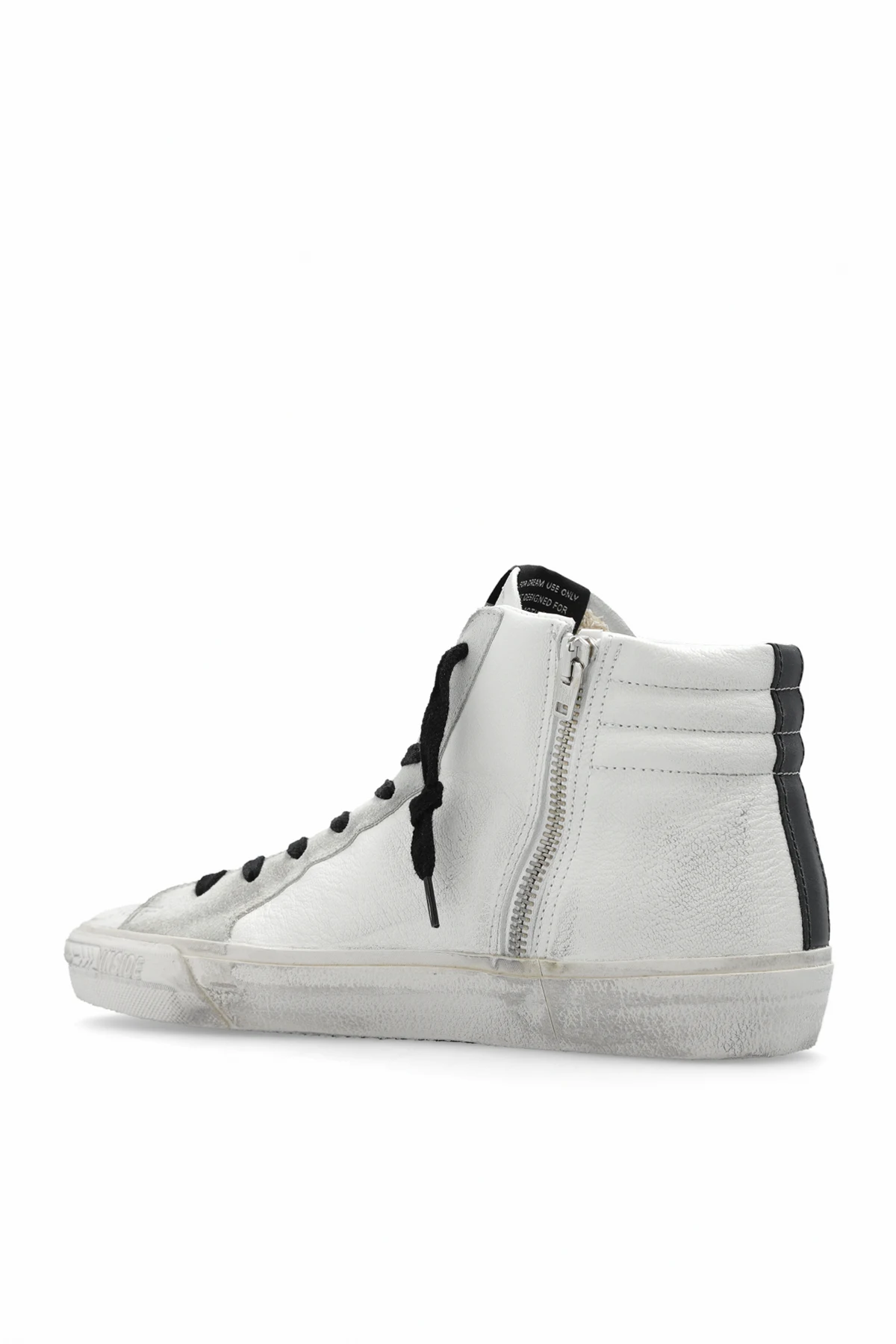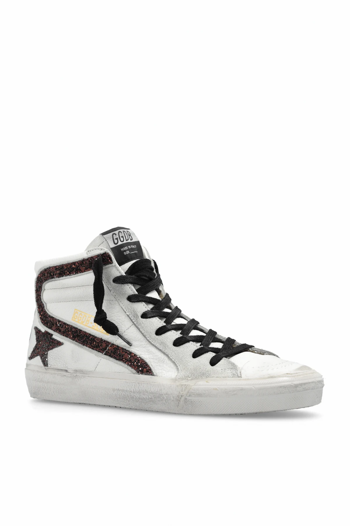White ‘Slide Classica Con Puntale A Vista’ high-top sneakers from Golden Goose. Made of leather, this lace-up model sits on a black rubber sole and showcases an embossed logo, a side zip, a signature brown star spruced up with glitter, distressed and dirty effects and a black insert on the back.