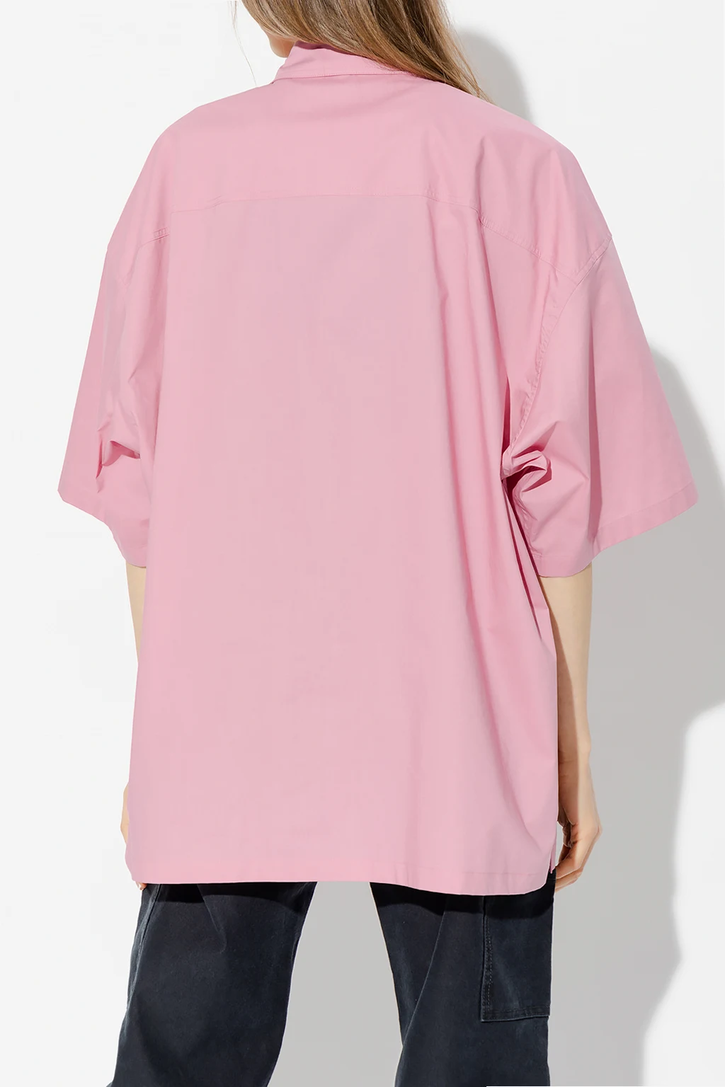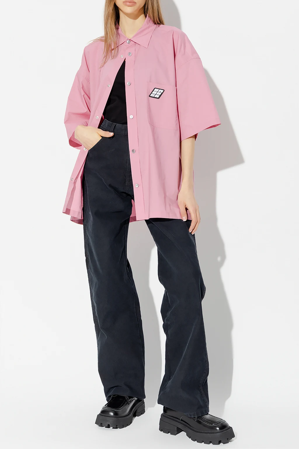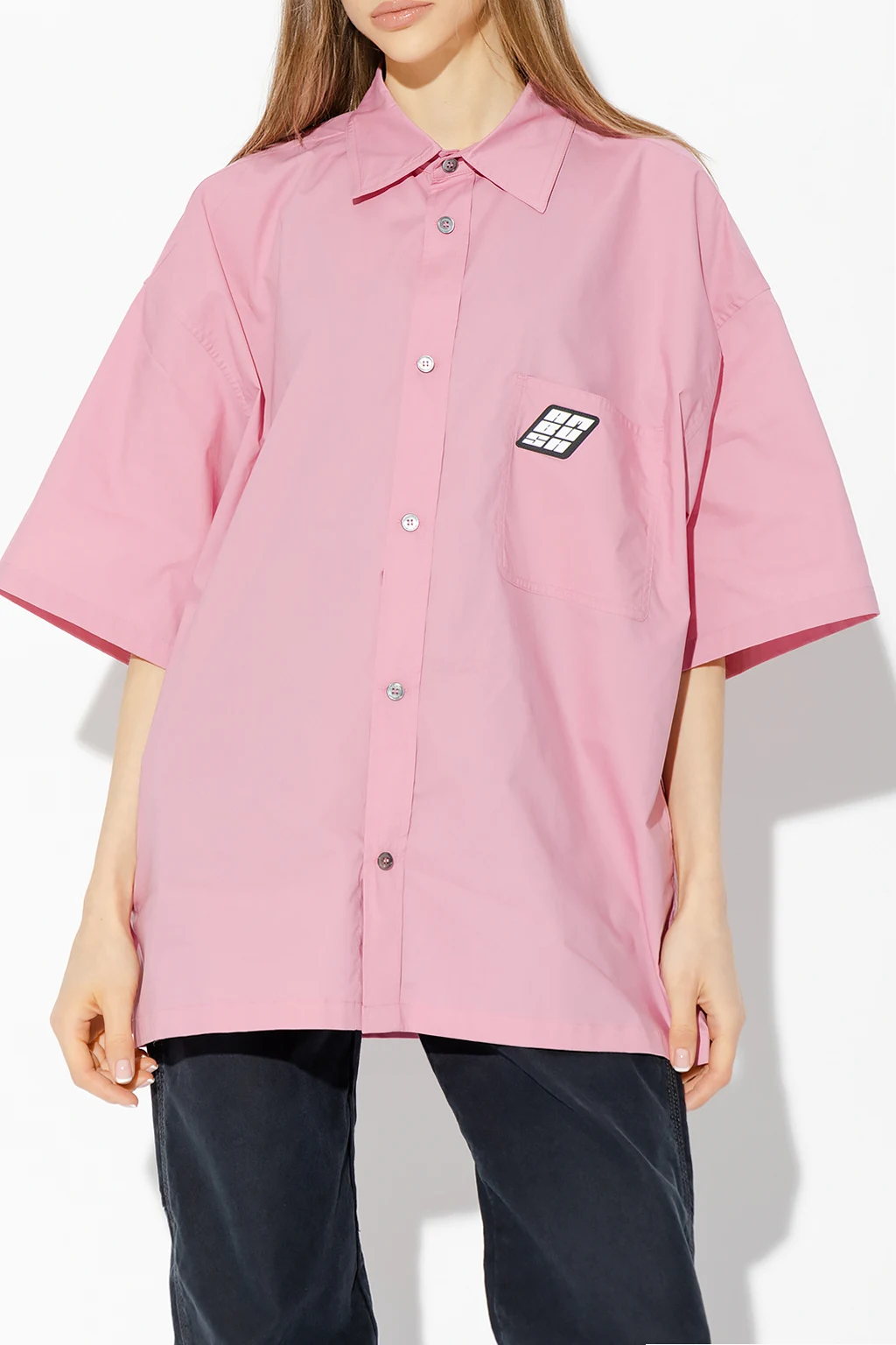 Pink shirt from Ambush. Crafted from cotton with an oversize fit, this style features button fastenings, short sleeves and a slip chest pocket accompanied by a black and white logo patch.
