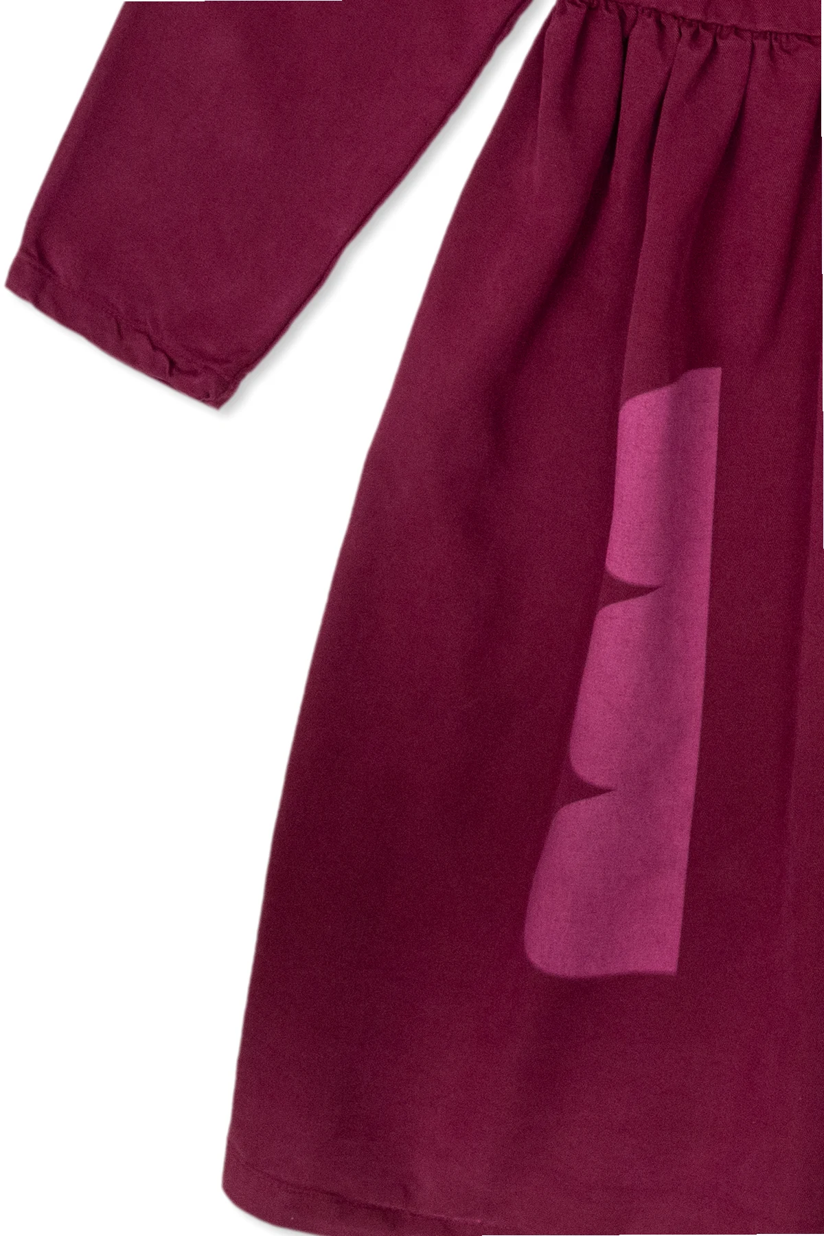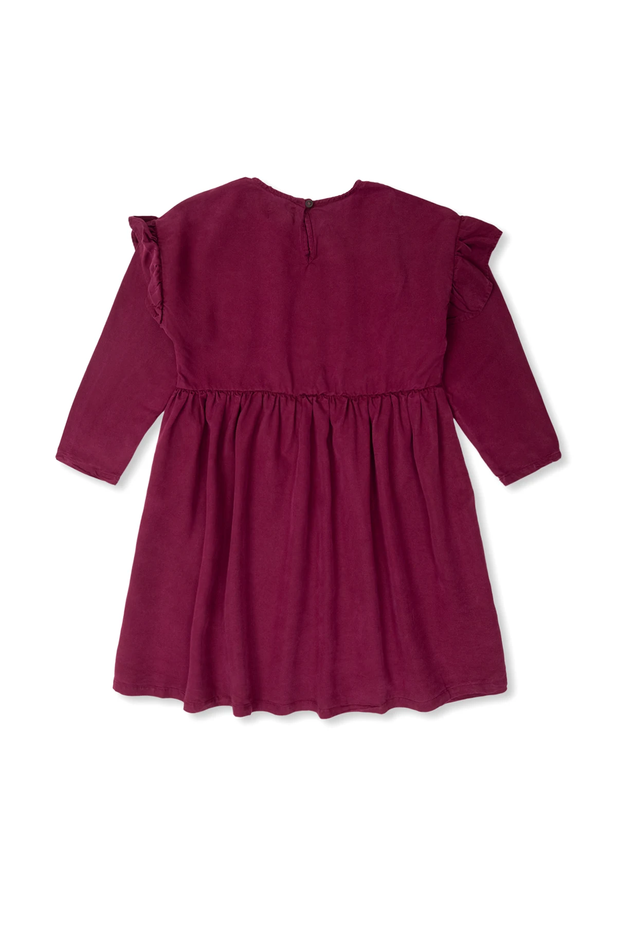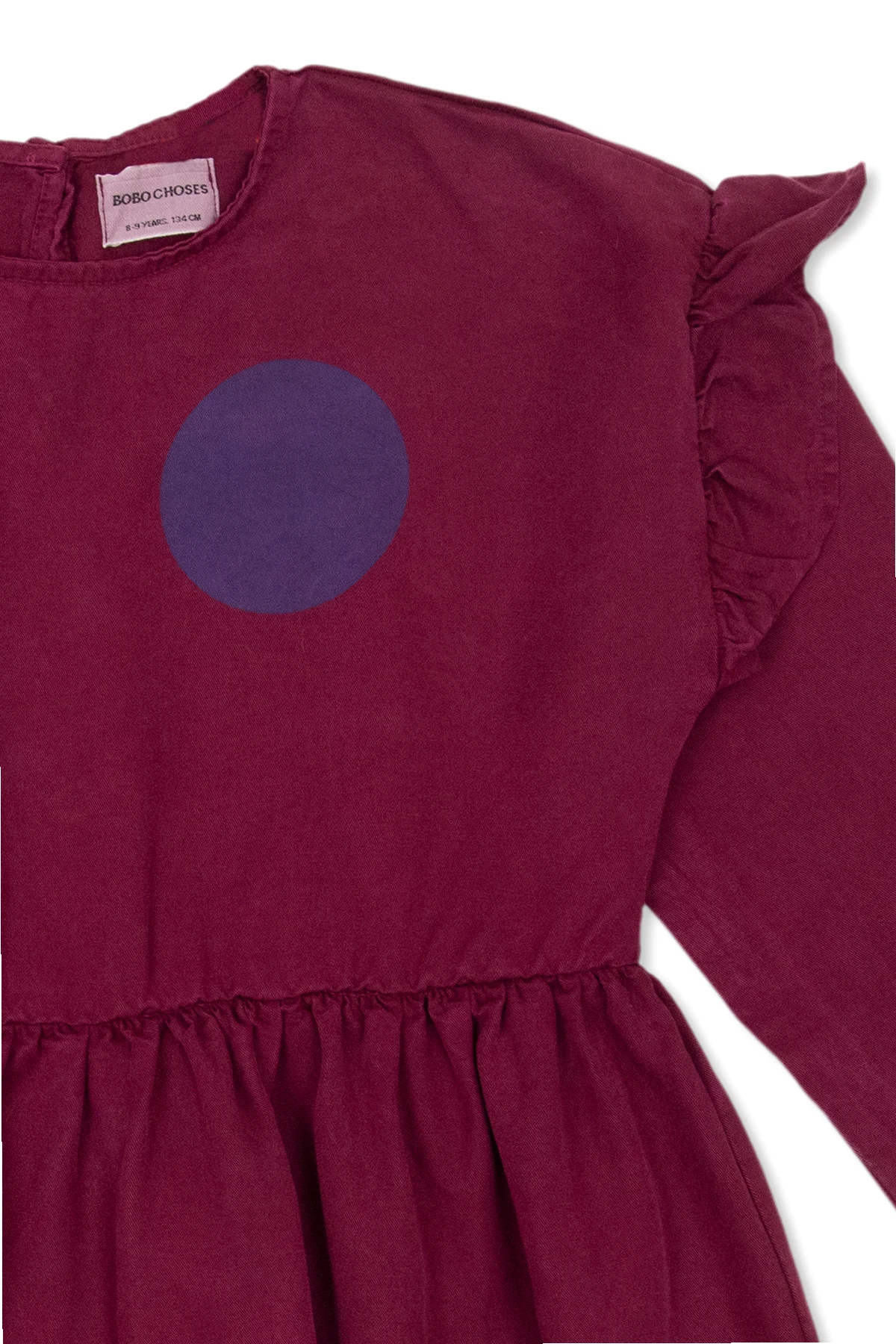 Purple dress from Bobo Choses. Printed with geometrical motifs, this style fastens with a back button and features a round neck, long sleeves and ruffle detailing on the shoulders.