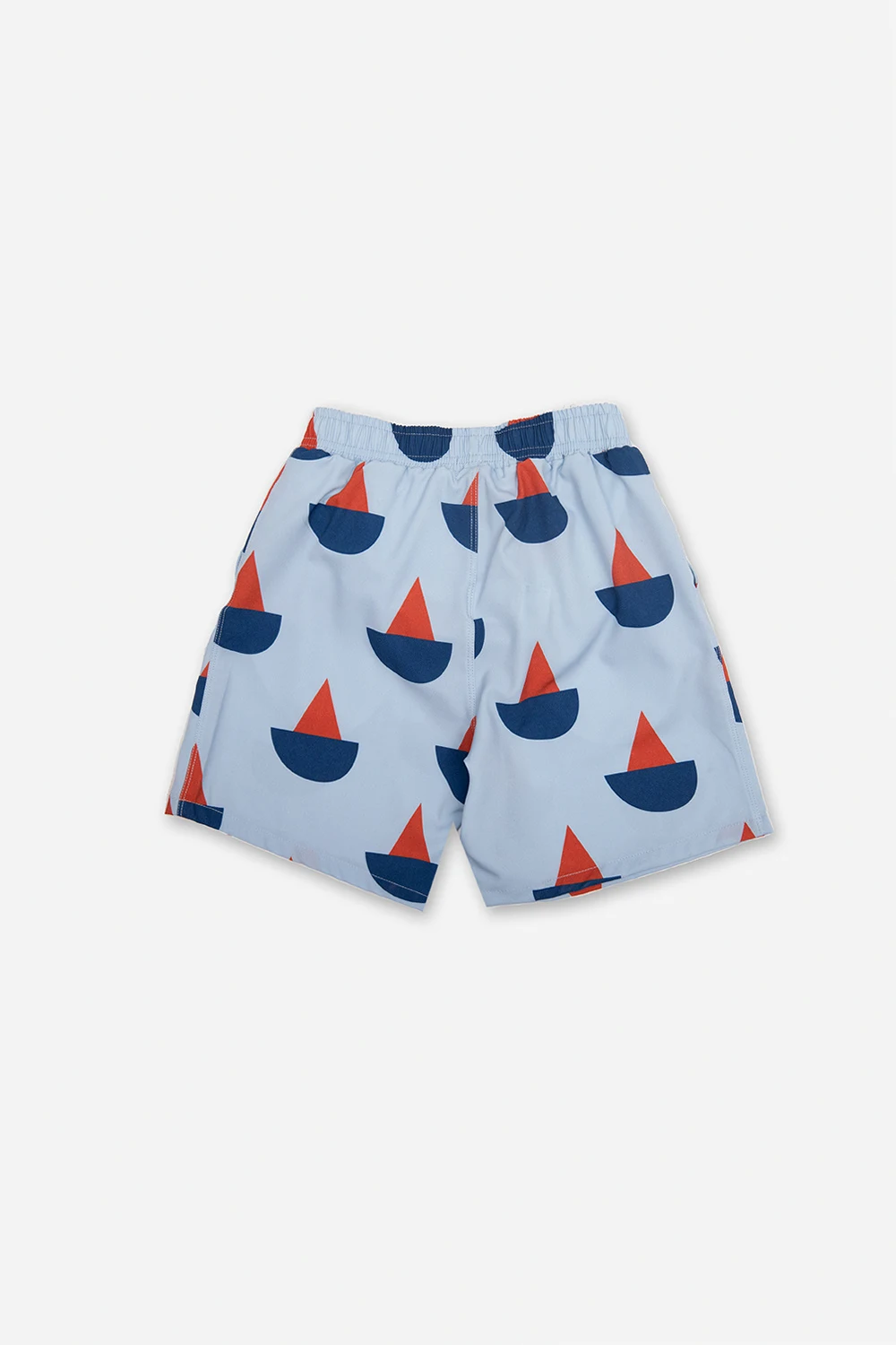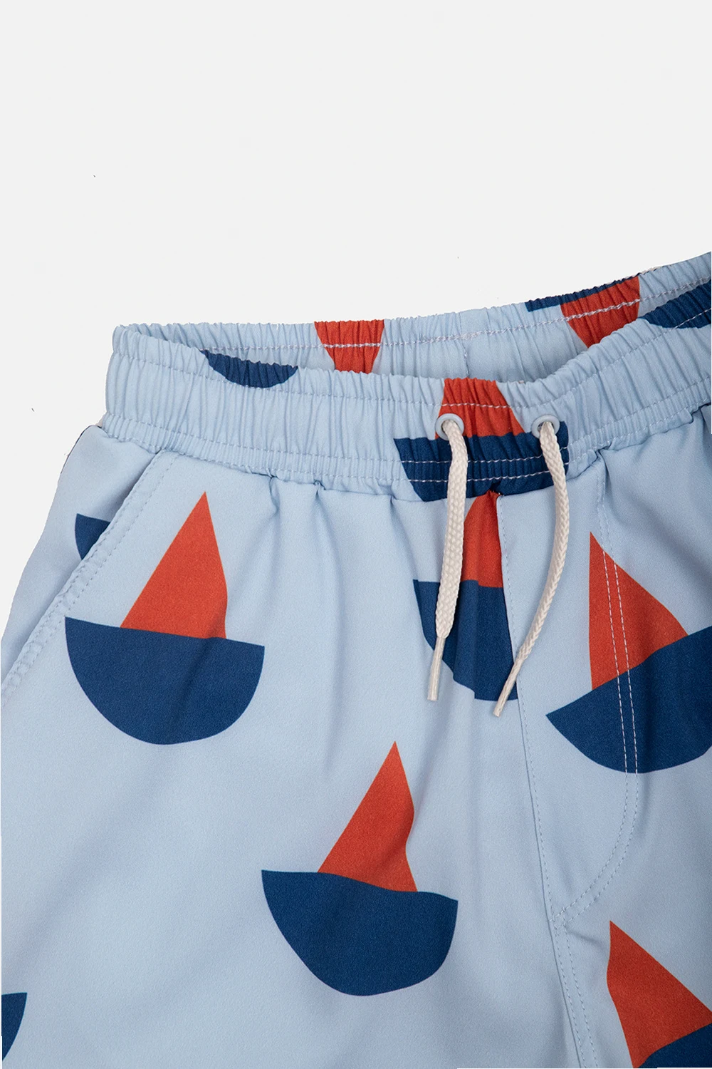 Light blue swimming shorts from Bobo Choses. Embellished with a navy blue and red boat print, this pair features a yellow logo, a drawstring waistband and two frontal pockets.