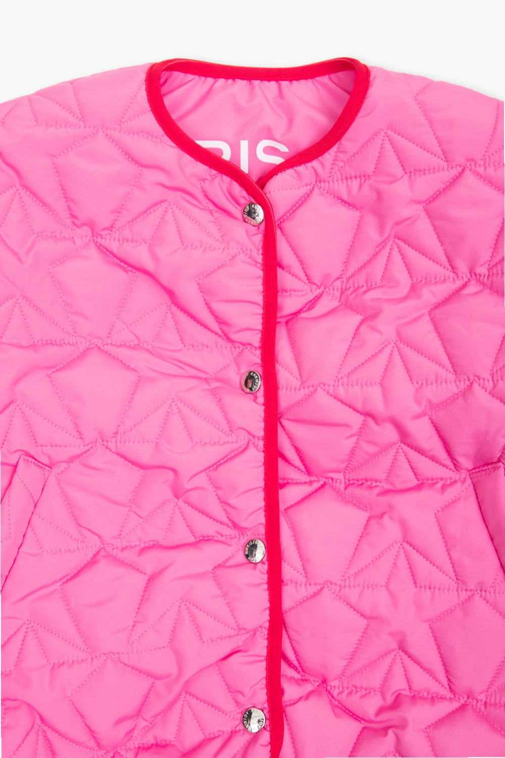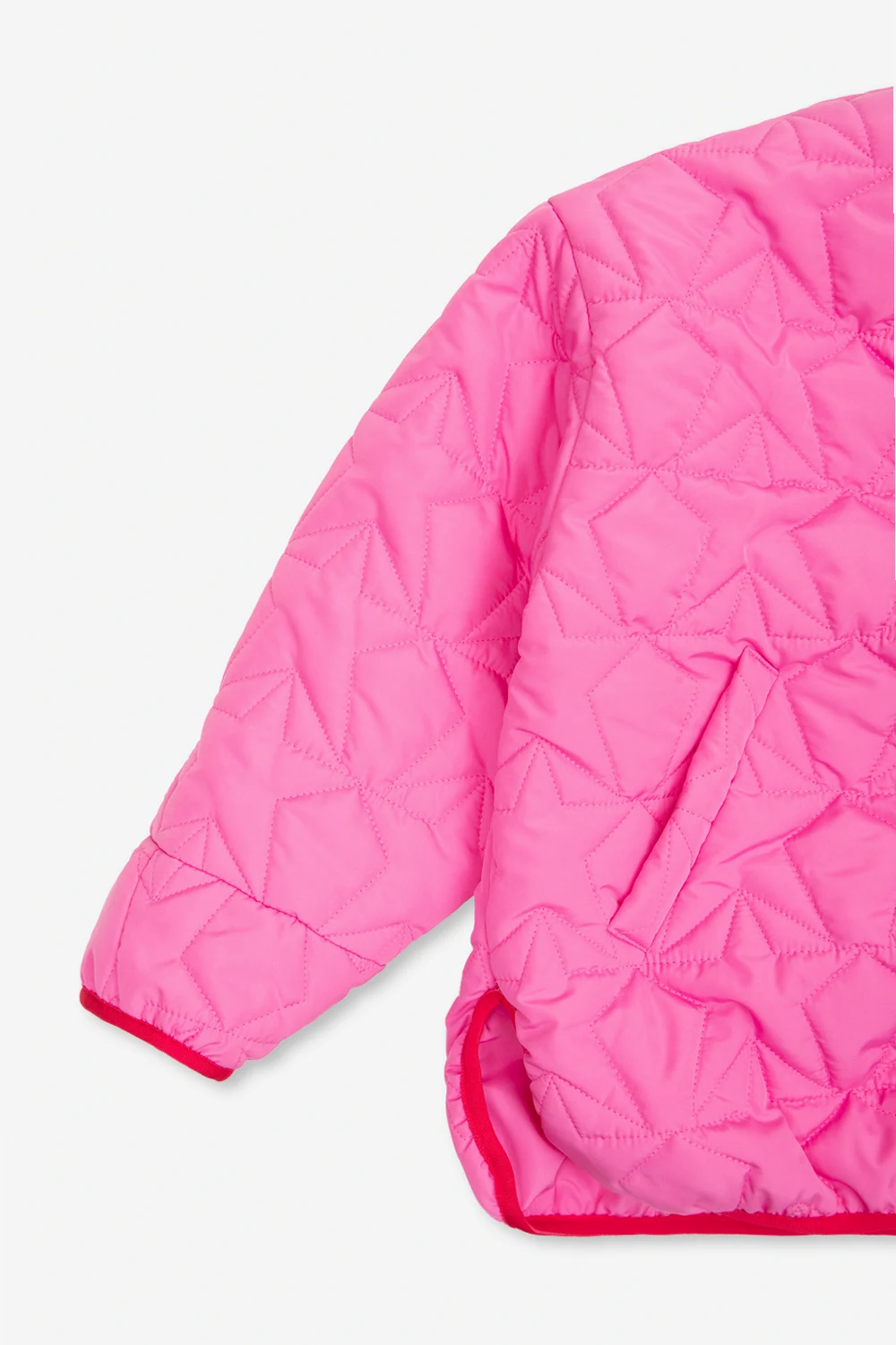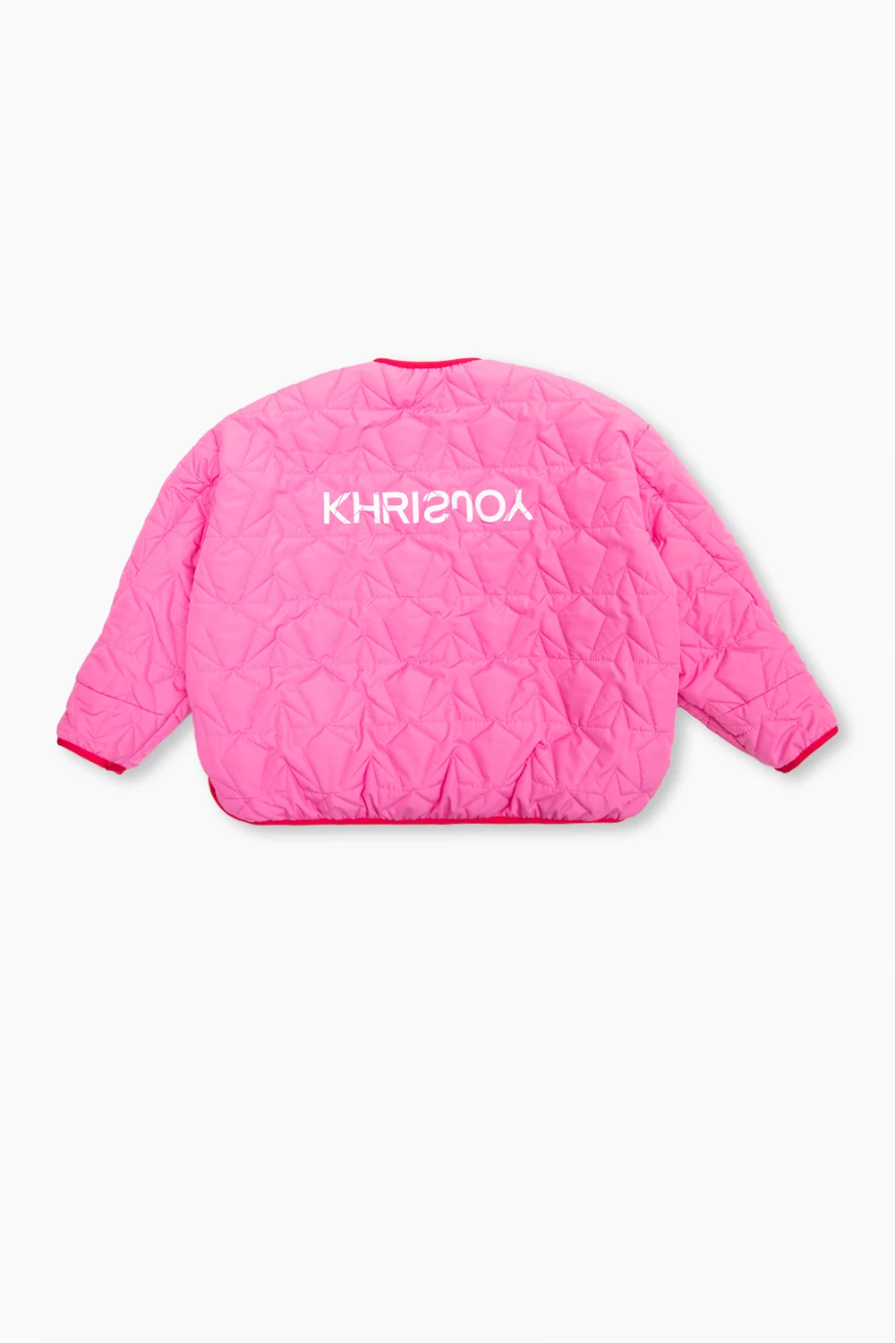 Pink jacket from Khrisjoy Kids. Embellished with star-shaped quilting, this style fastens with snaps and features a printed white logo at the back, two slip pockets, long sleeves and red trimmings.