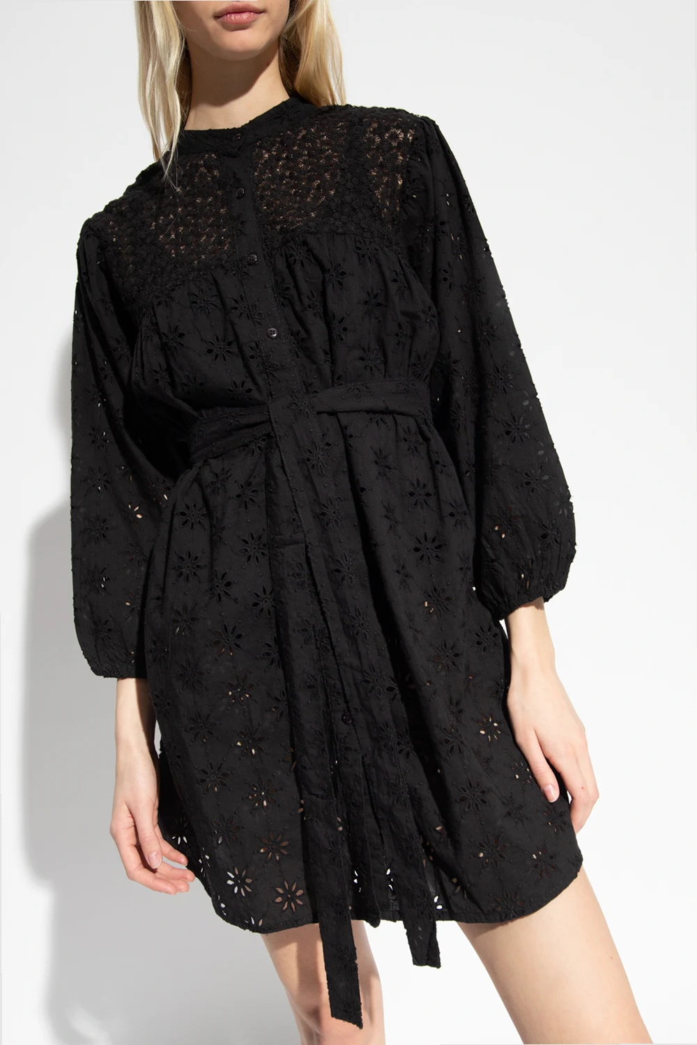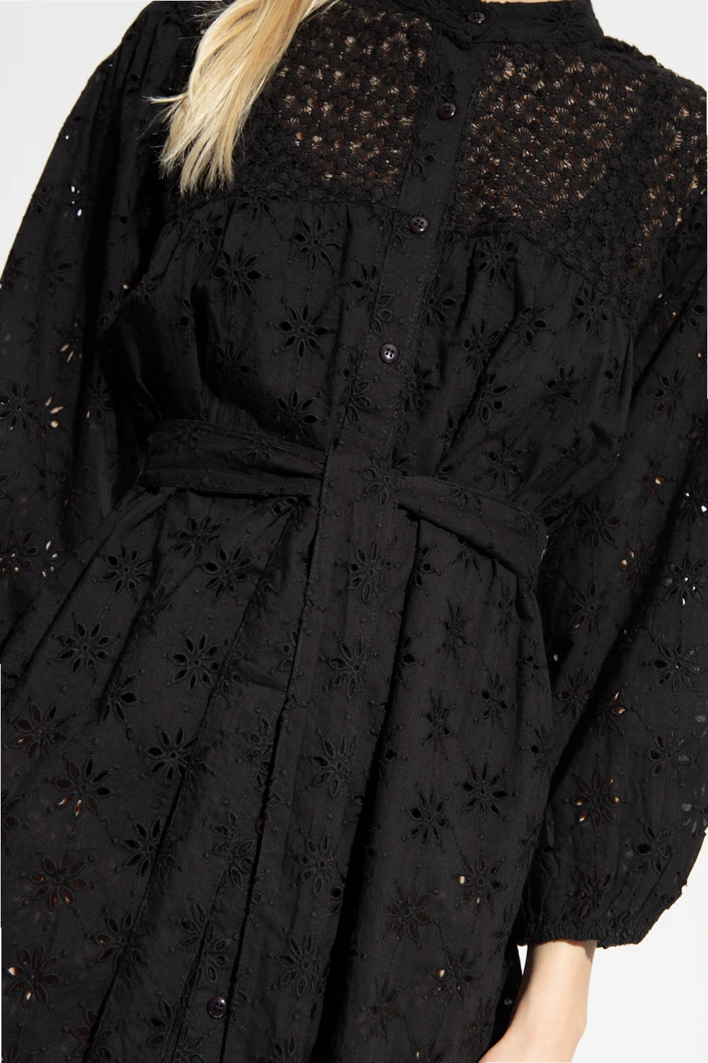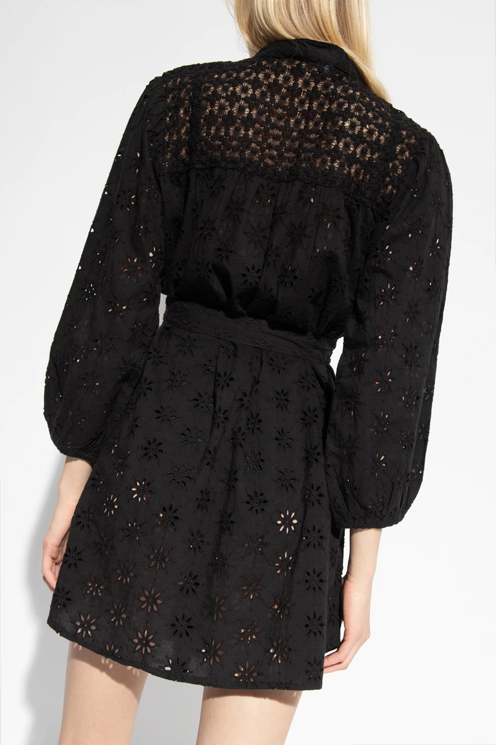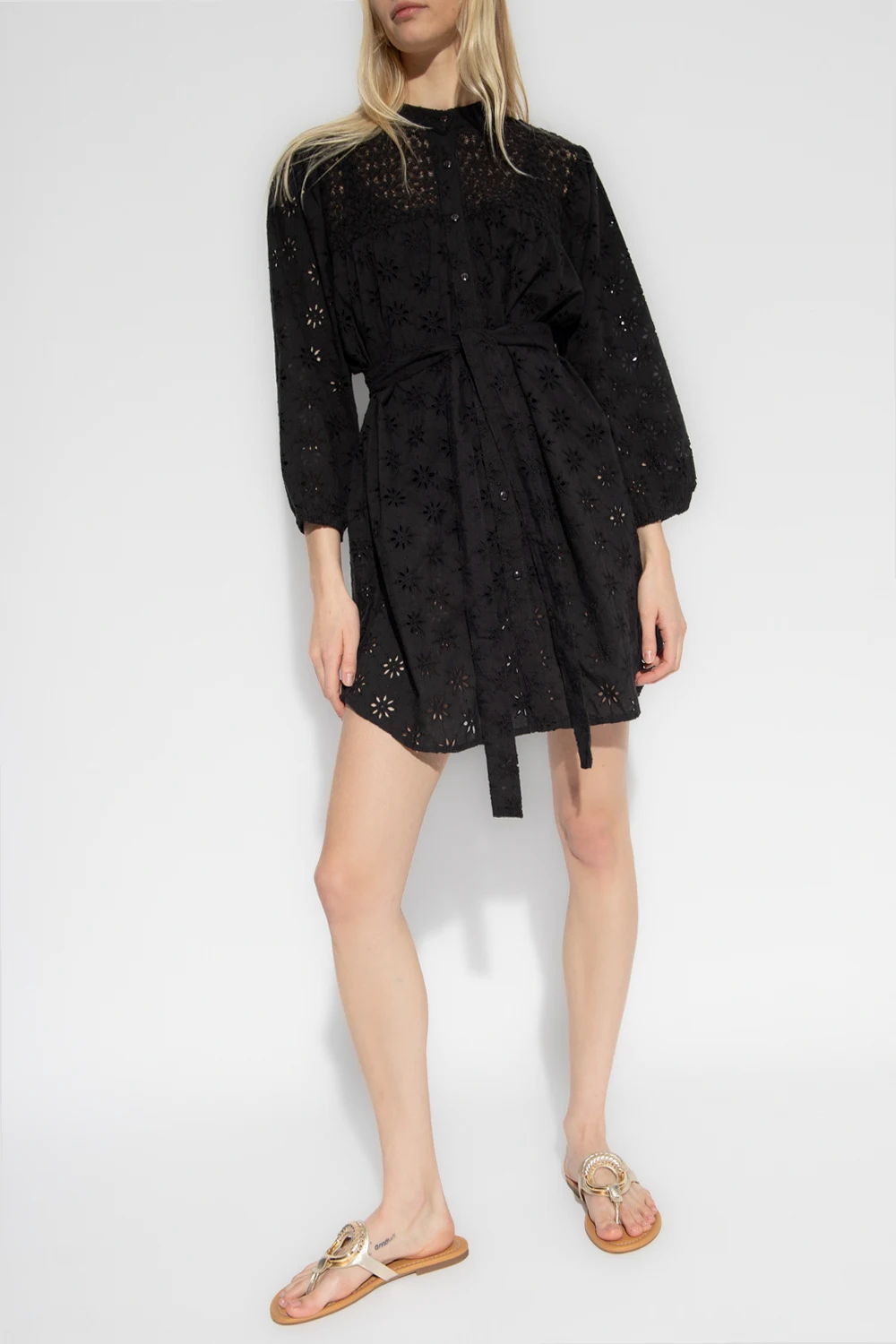 Black ‘Barrie’ openwork dress from Melissa Odabash. Crafted from cotton, this design features buttons, waist tie, openwork floral cut-outs and puff sleeves with elasticated cuffs.