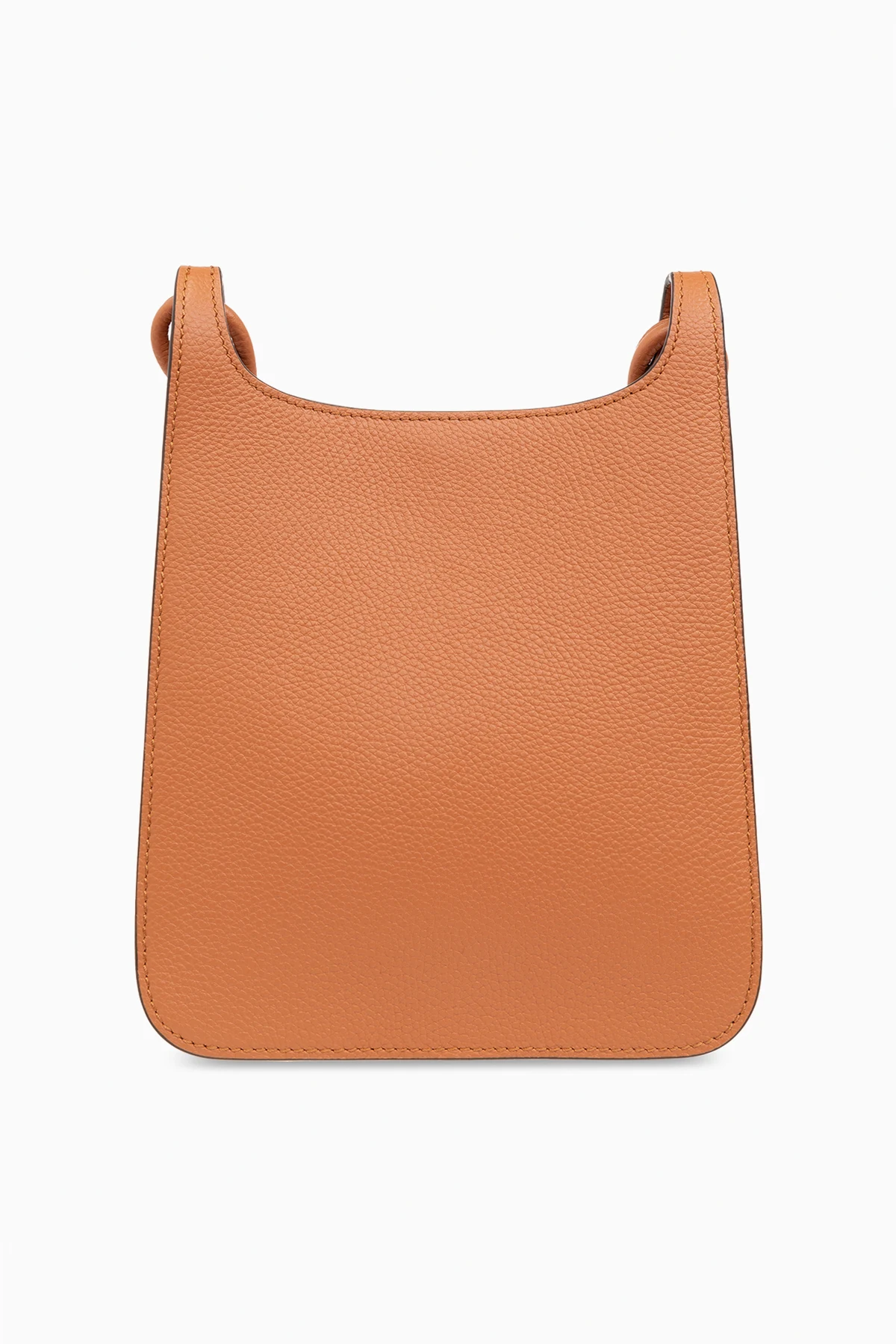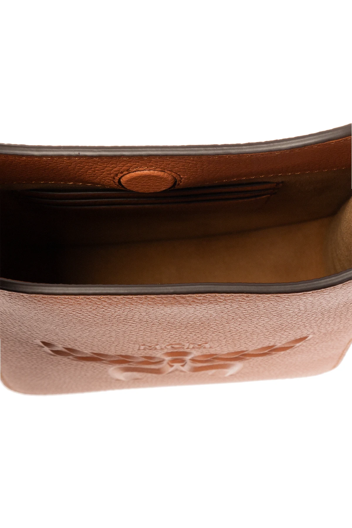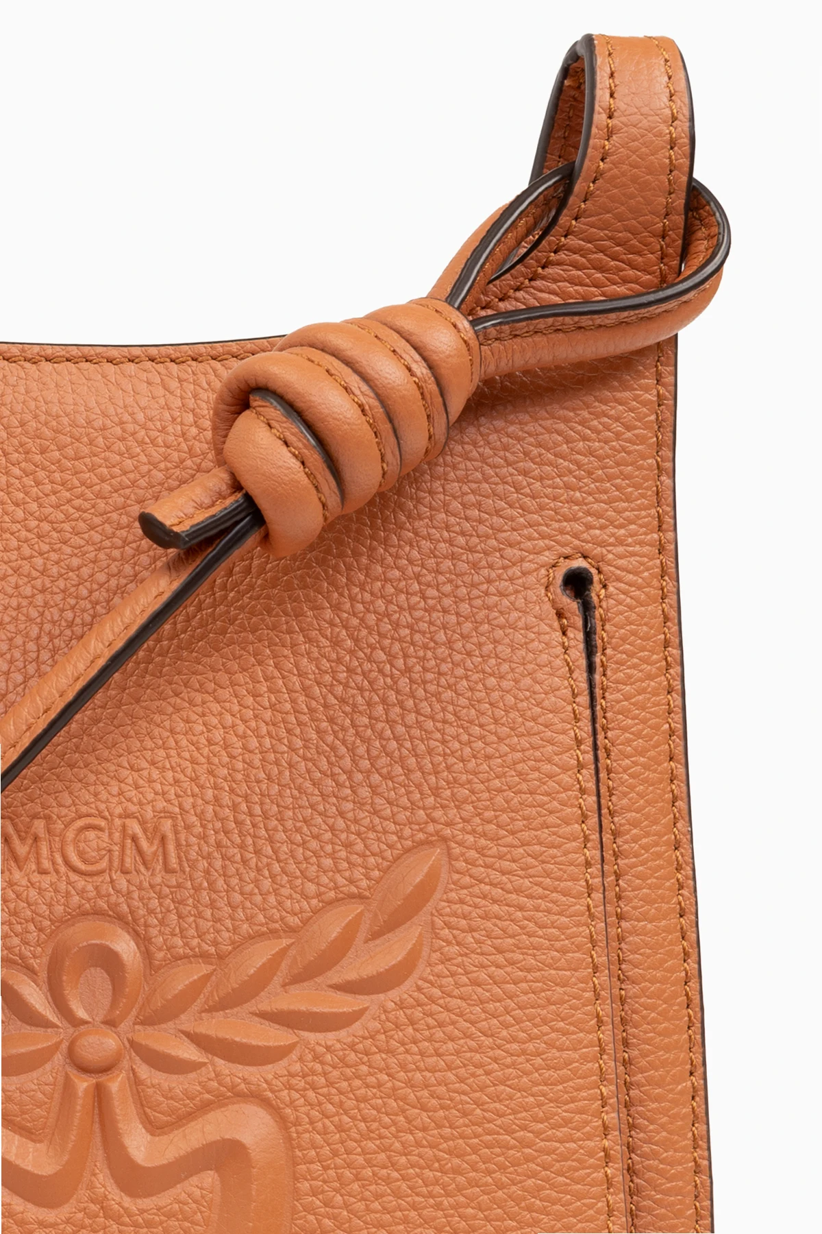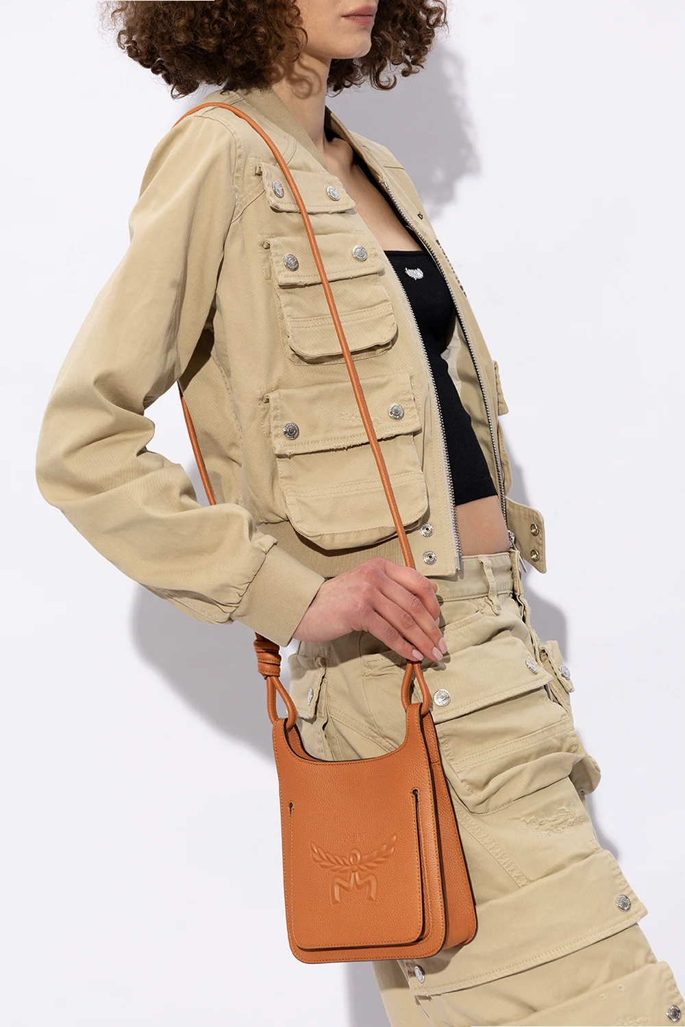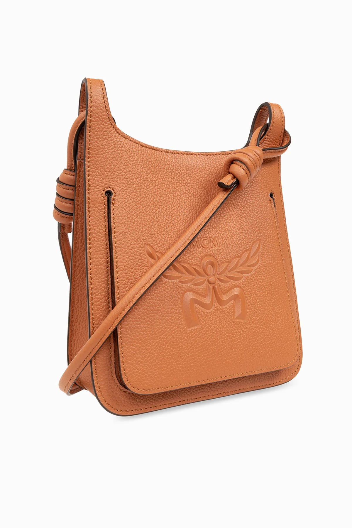 Braune Schultertasche, Modell 'Himmel Mini' MCM. Hergestellt aus Leder. Magnetverschluss. Vorne mit Logo verziert. Langer Riemen mit dekorativem Knoten. Innen ein Fach, eine Einschubtasche und drei Kartenfächer.