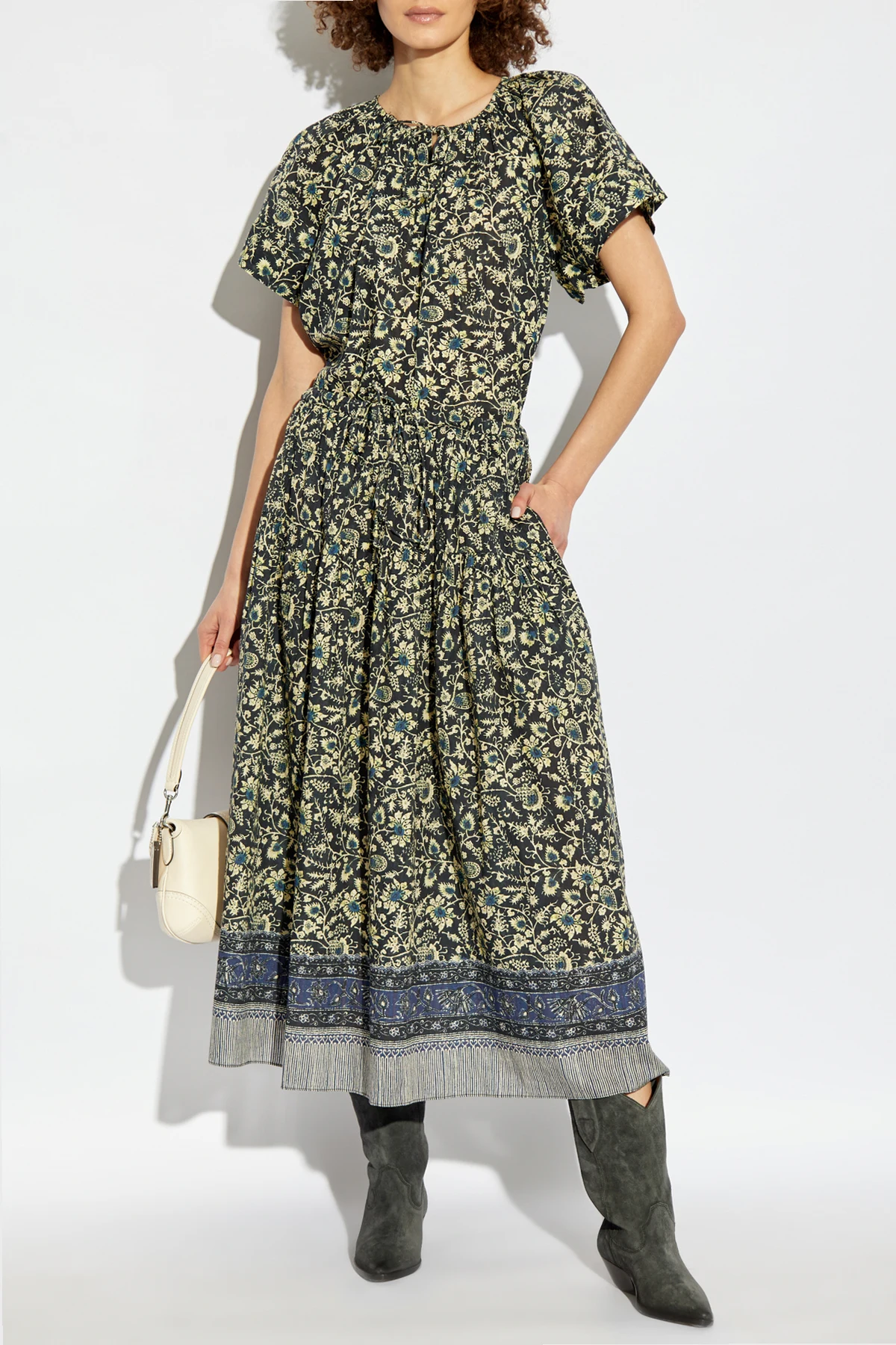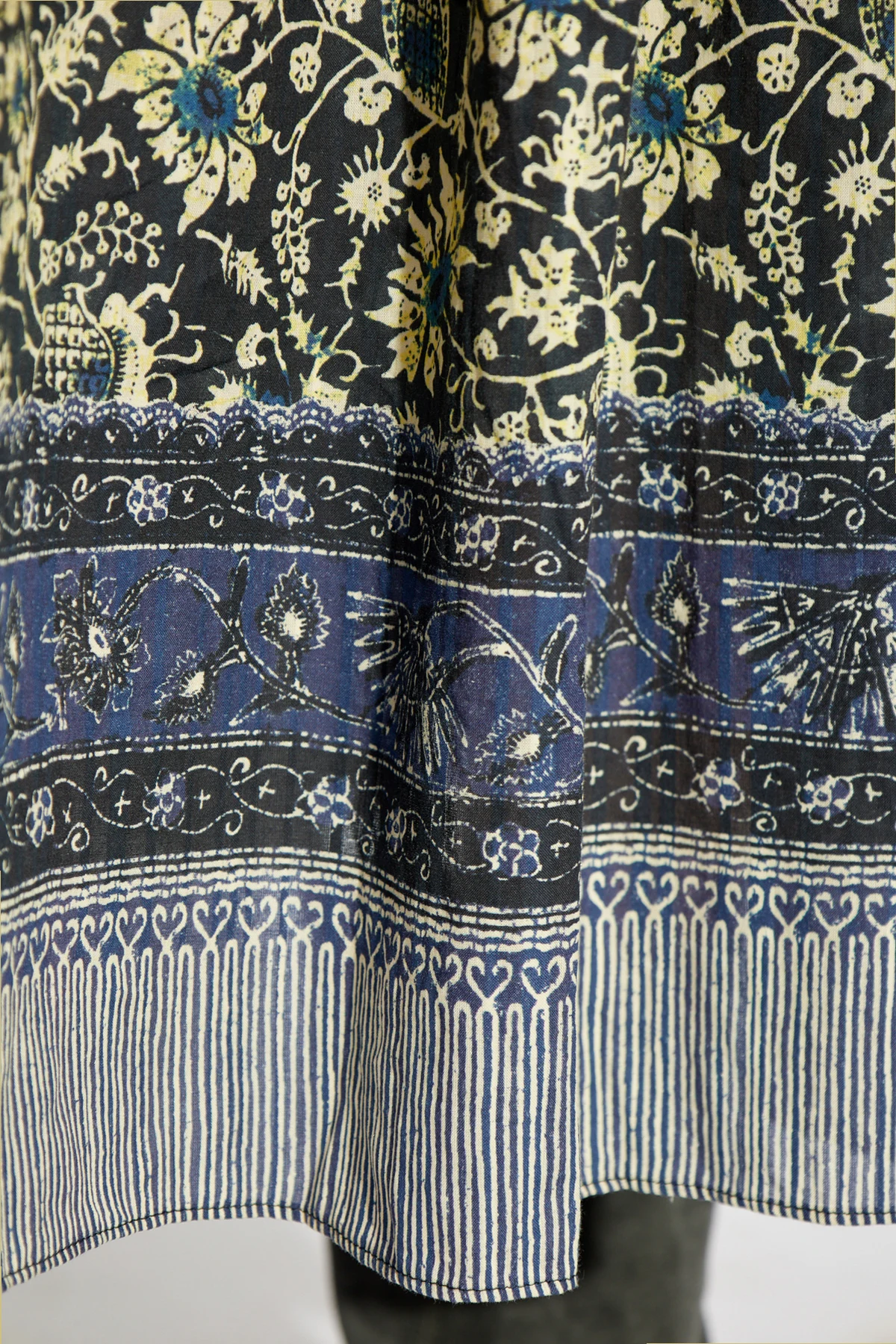 Der untere Teil des Rocks zieht durch einen breiten Streifen mit einem Muster in Blau- und Weißtönen die Aufmerksamkeit auf sich, der einen Kontrast zum restlichen Material bildet. In der Taille zusätzlich mit Kordeln gerafft, ermöglicht er eine perfekte Anpassung an die Silhouette.