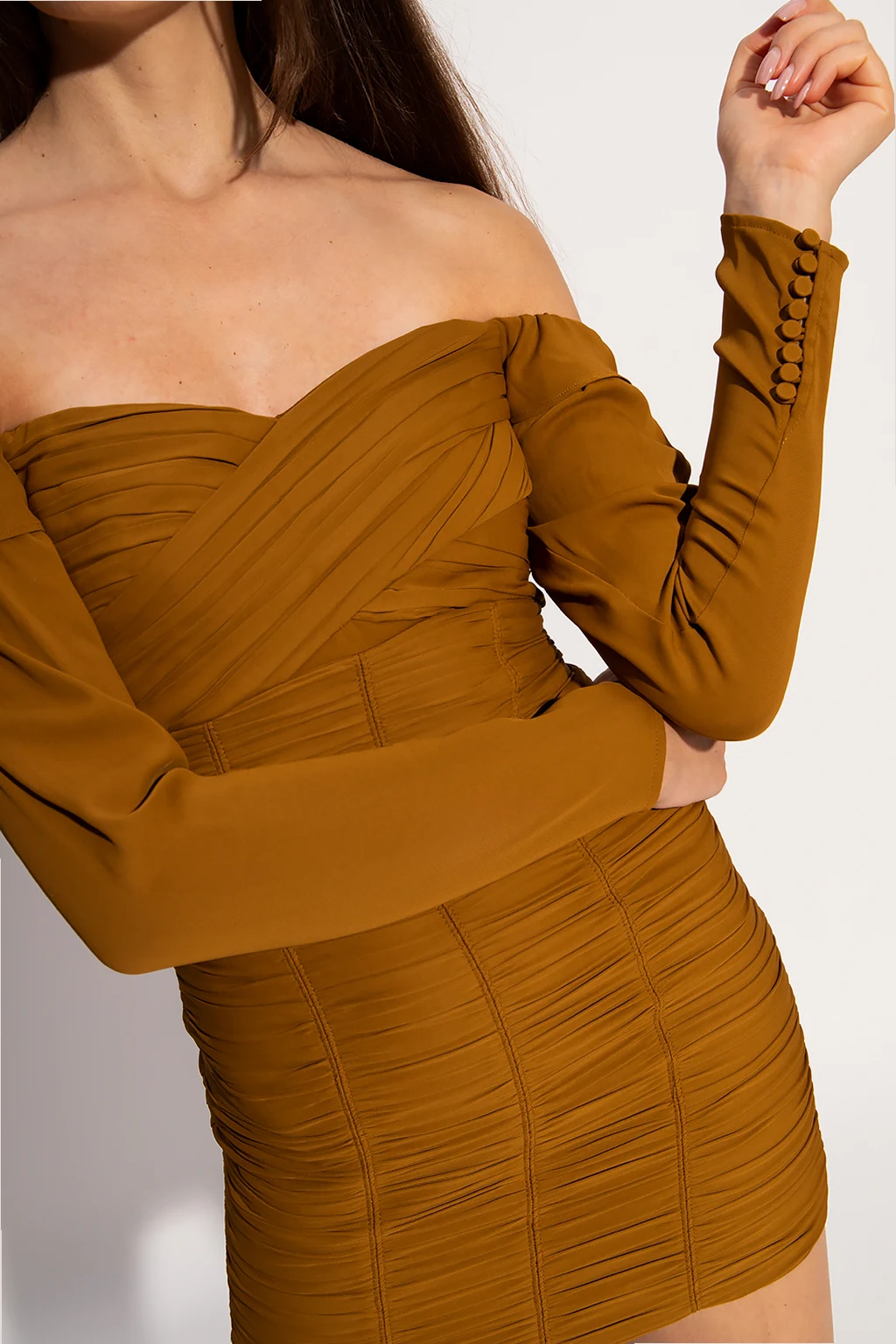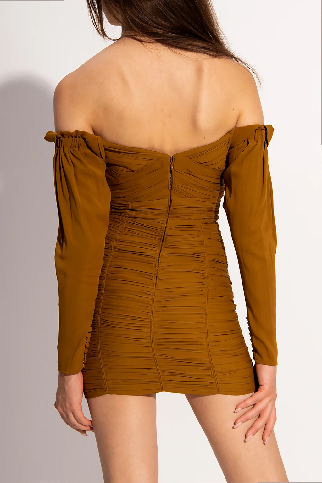 Brown and green dress from Self-Portrait. Crafted from stretch crepe, this style features a fitted silhouette, gathered details, a zip and a hook & eye closure on the back and long sleeves with buttons.