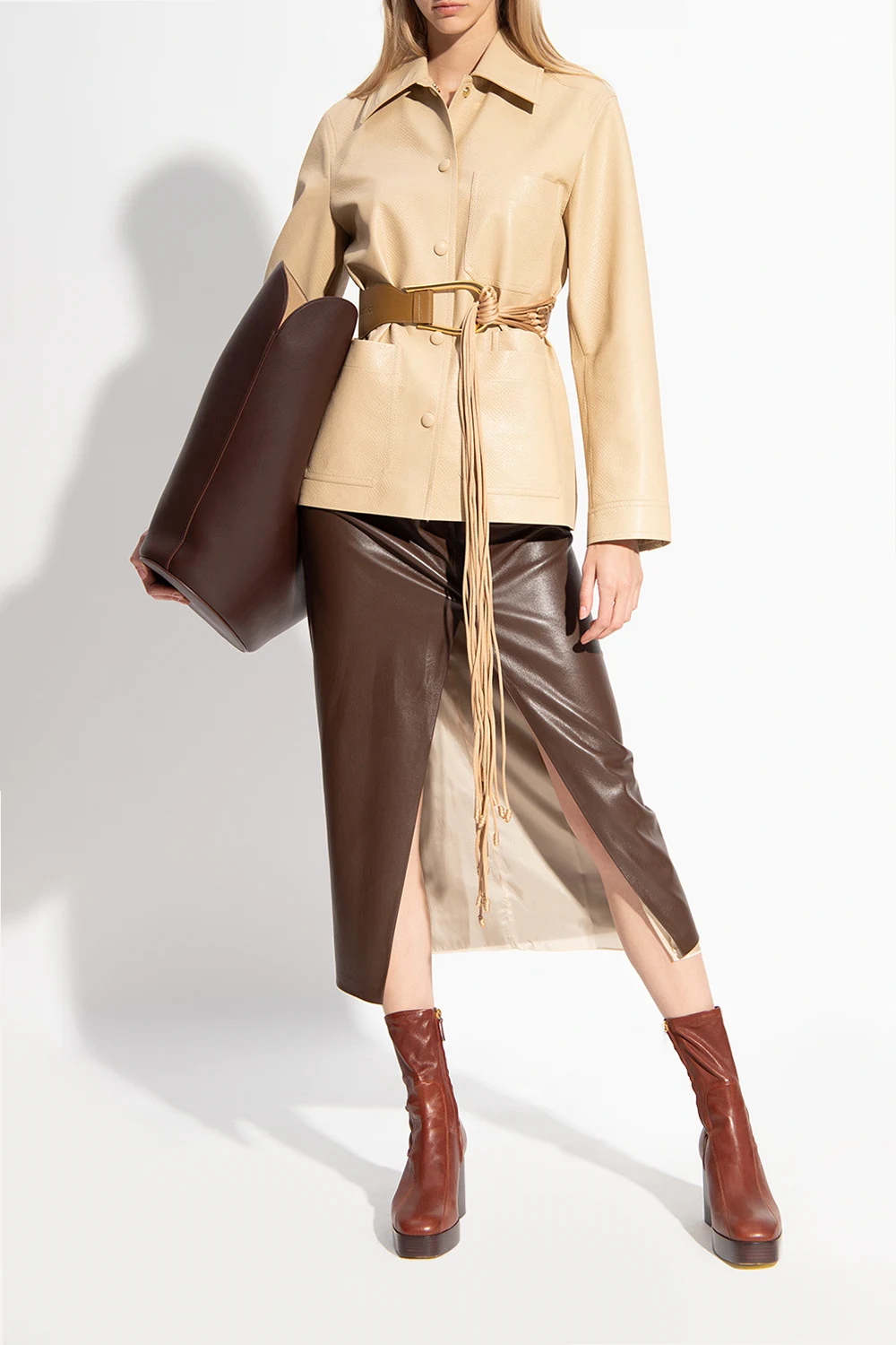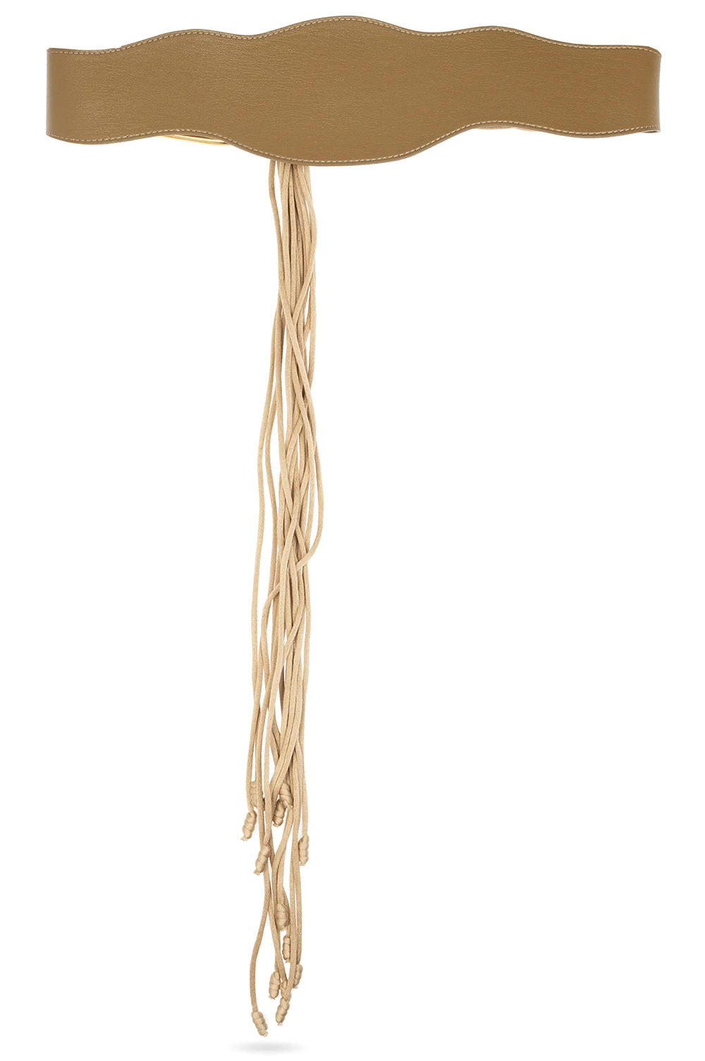 Brown waist belt from Nanushka. Made of vegan leather, this design is enriched by cotton fringes in beige and a gold-tone metal buckle.
