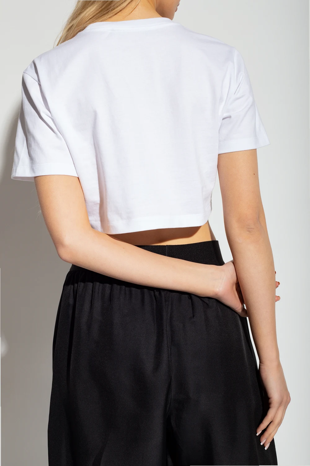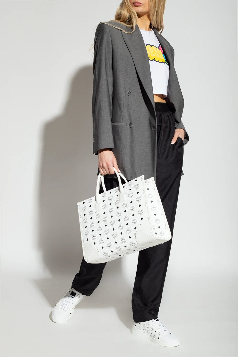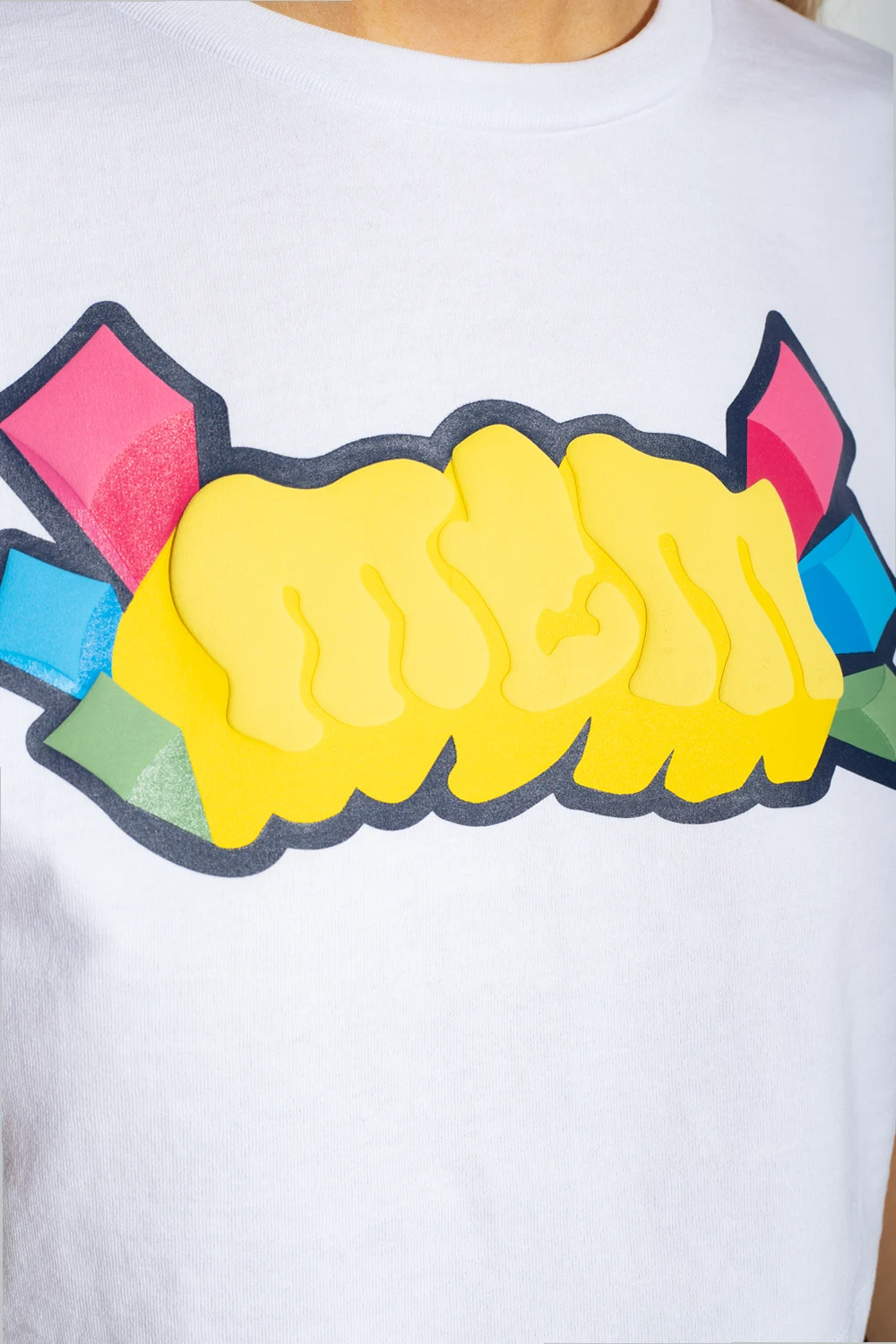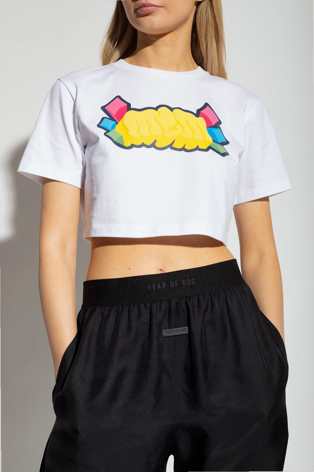 White crewneck T-shirt from MCM. Made of cotton with a cropped silhouette, this style features short sleeves, an elasticated collar and a colourful graphic print with the brand's logo on the front.