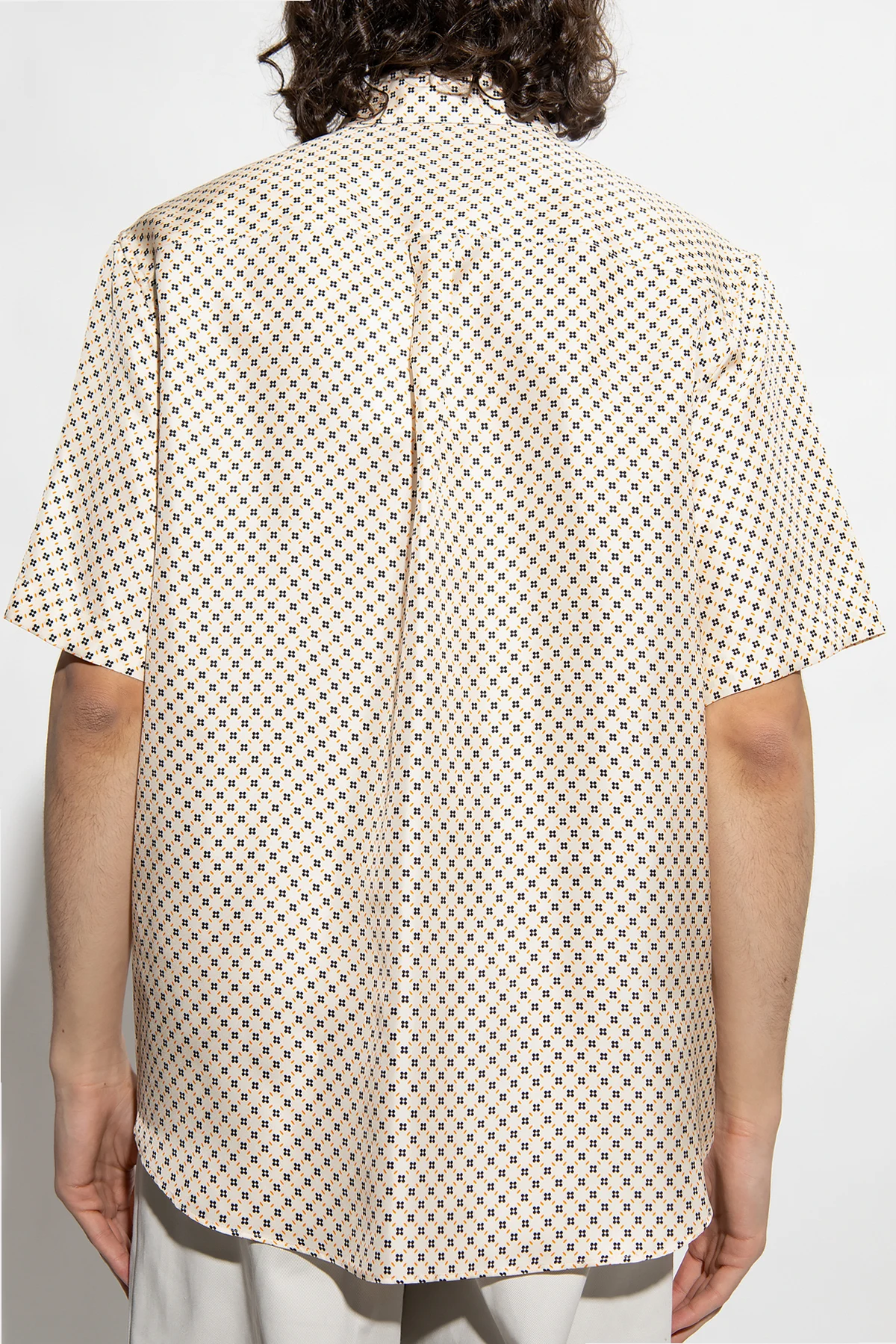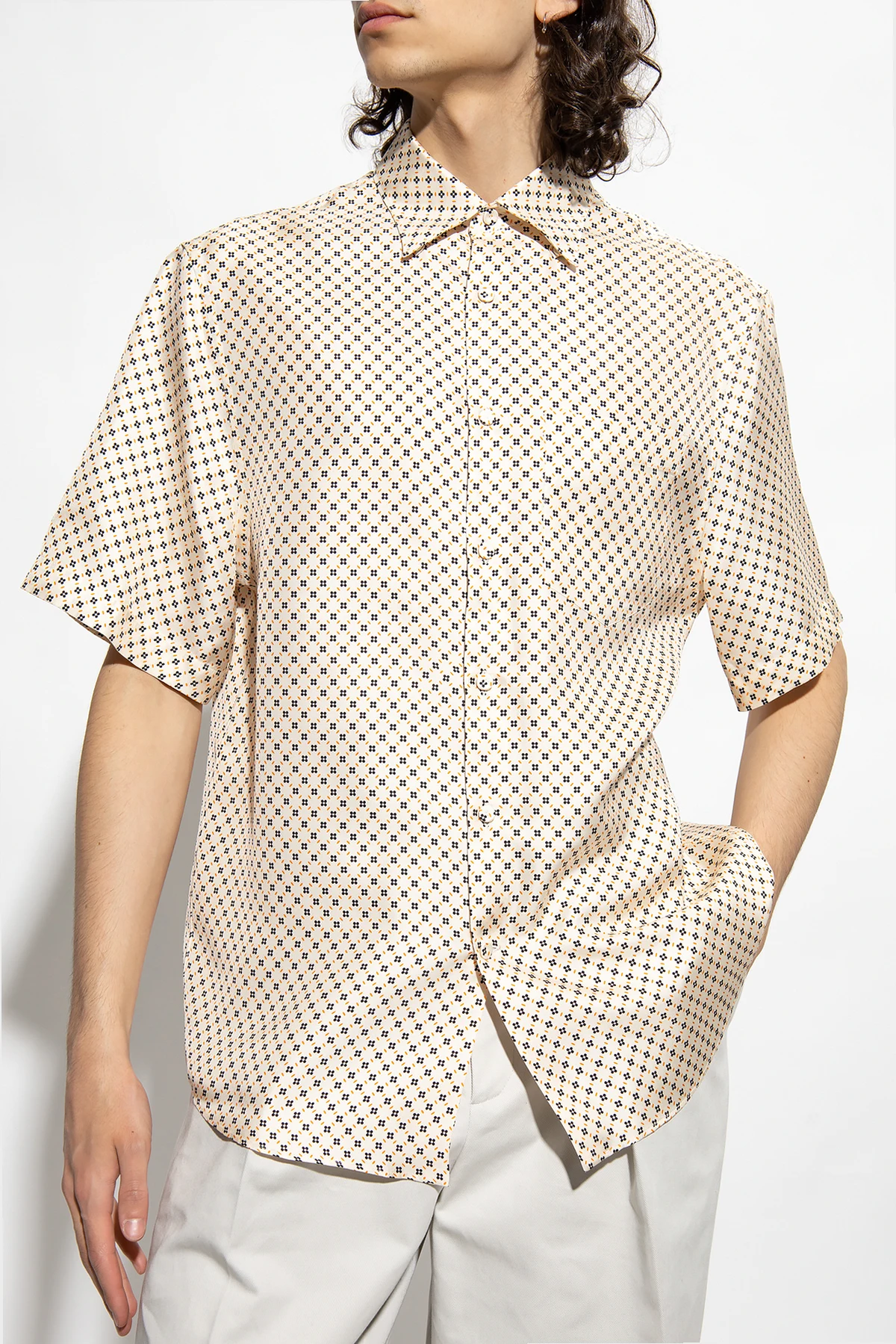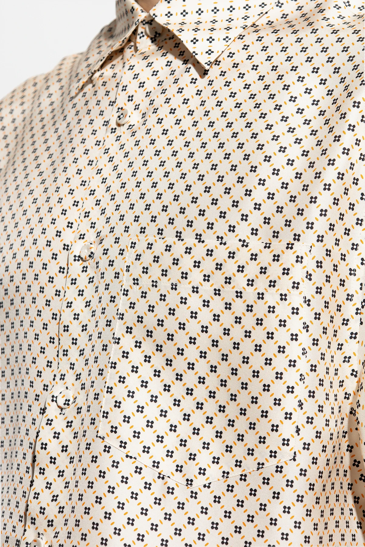 Cream shirt from Lanvin. Made of silk, this garment is decorated with a black and orange geometric pattern and complete with button fastenings, a front pocket, collar and short sleeves.