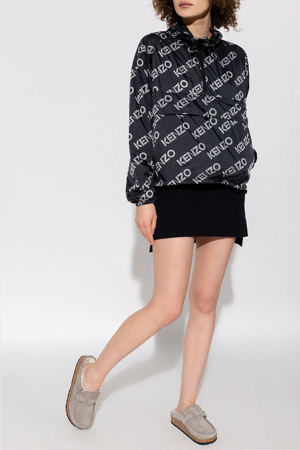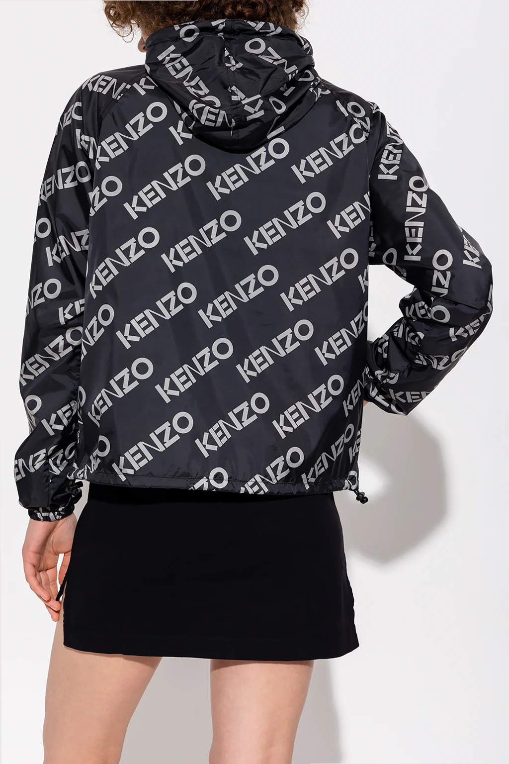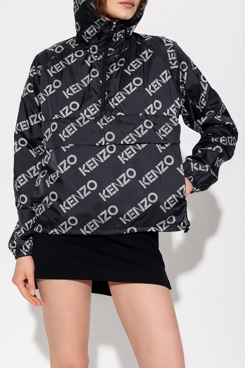 Black rain jacket from Kenzo. Printed with a grey monogram, this style features a quarter zip closure on the front, a drawcord-adjustable hood and hem, one zip pocket and long sleeves with elasticized cuffs.