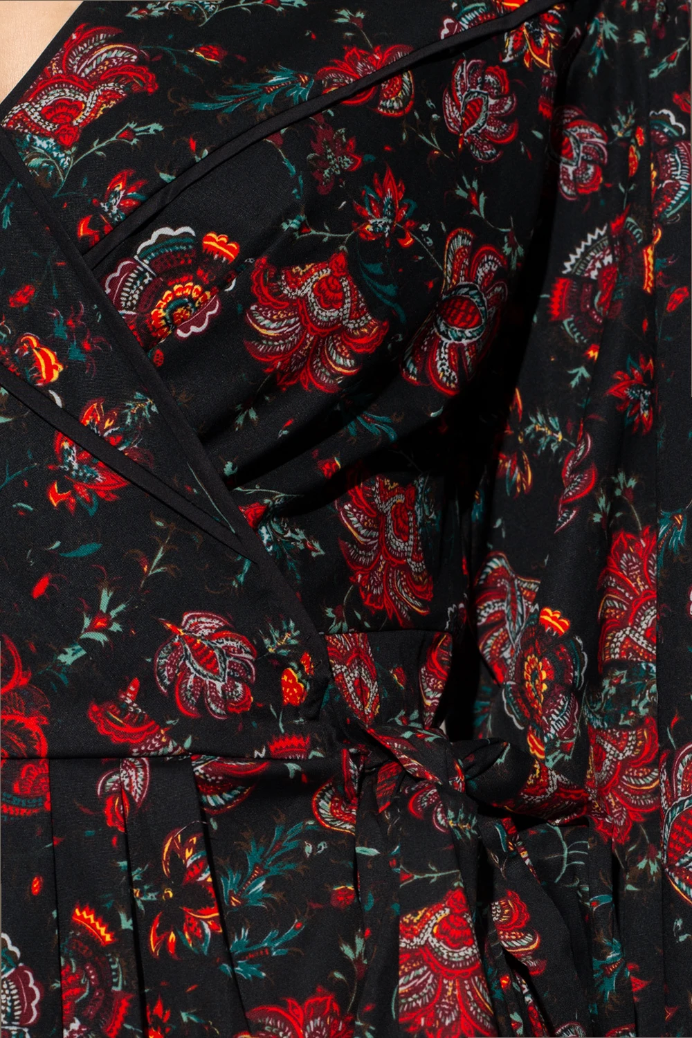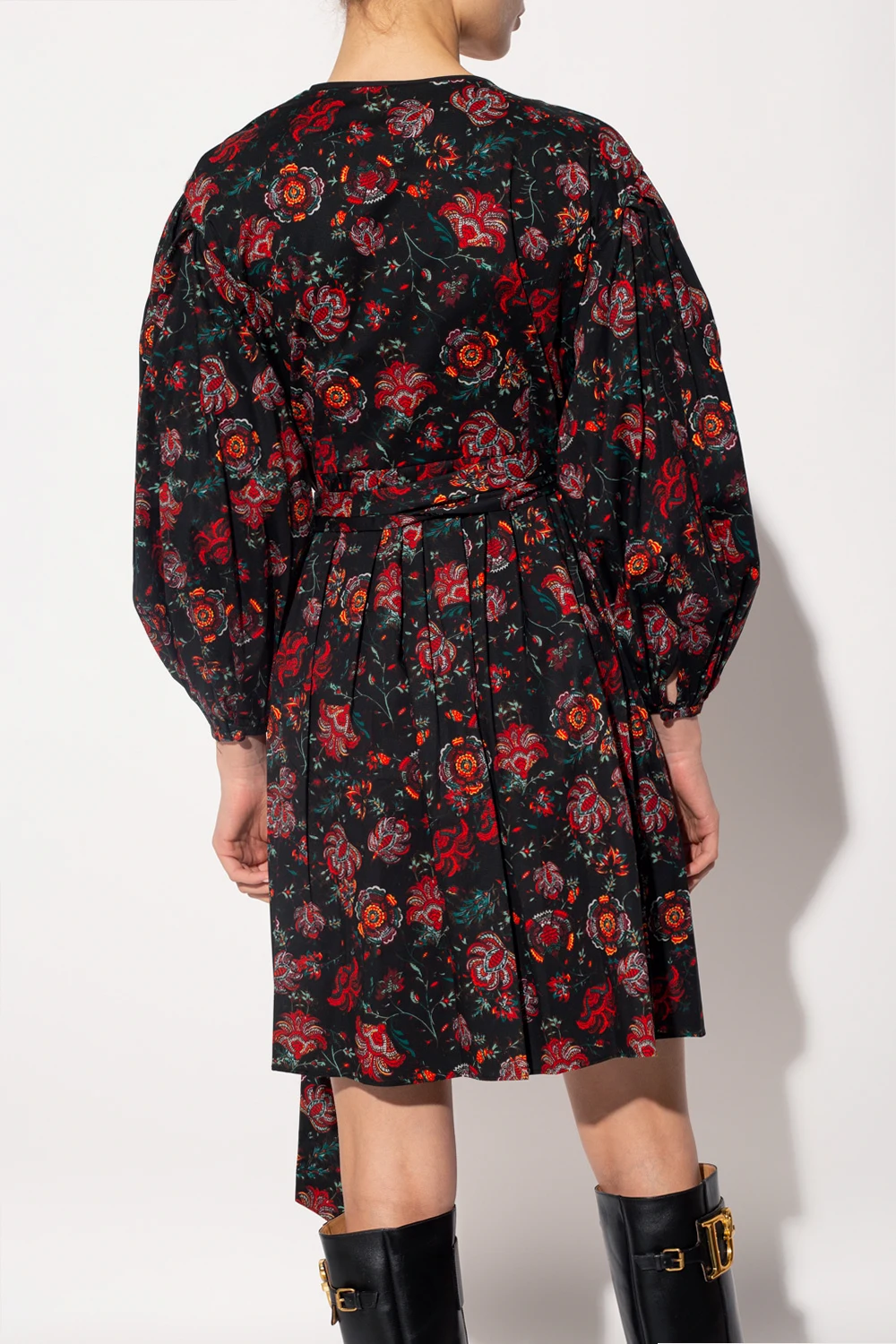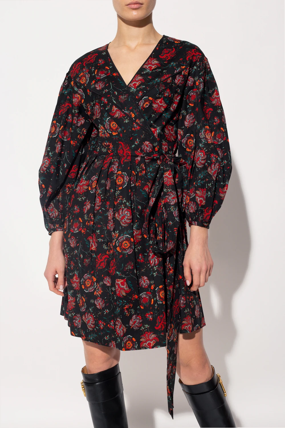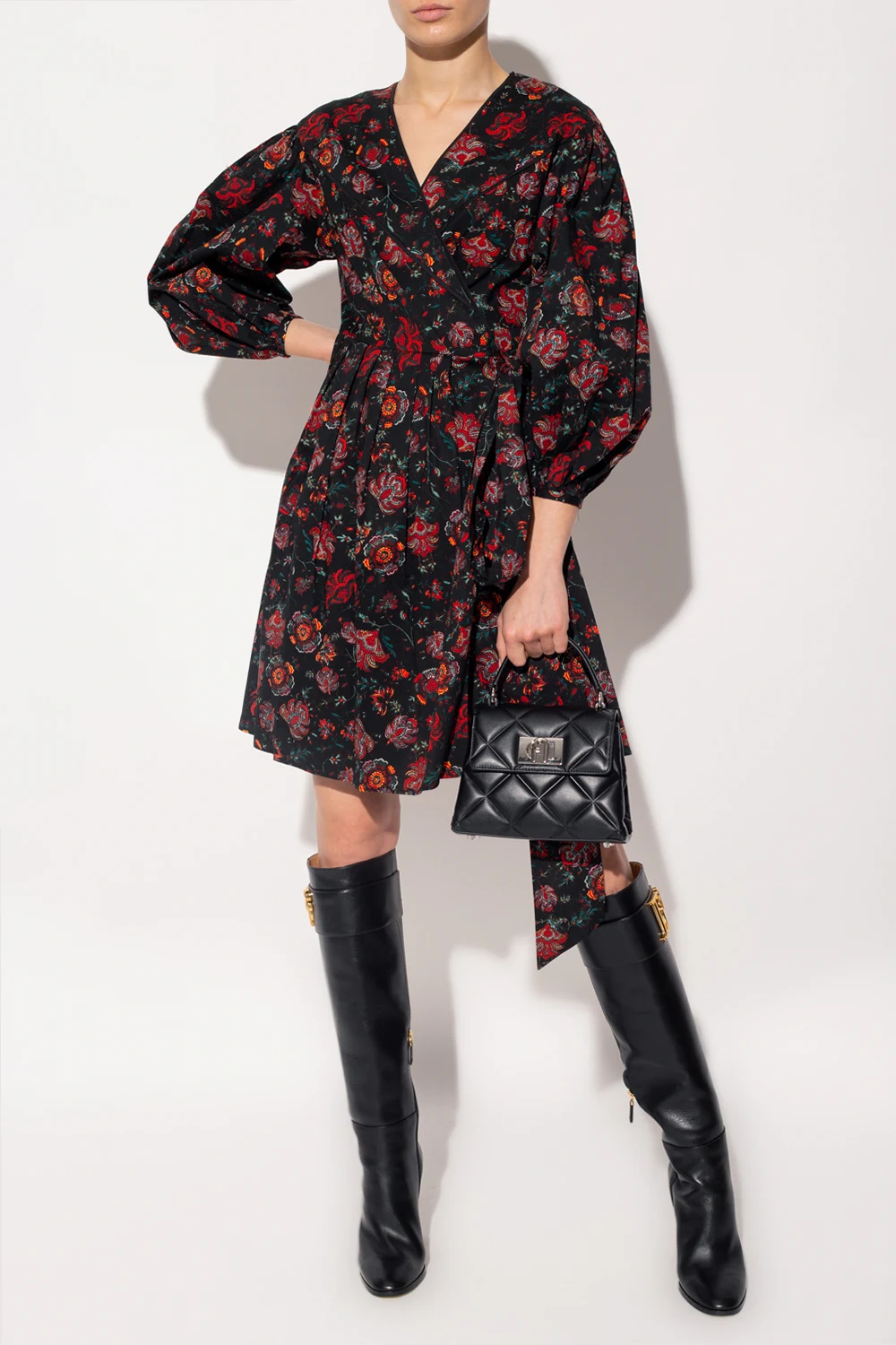 Black dress from Diane Von Furstenberg. Crafted from cotton and decorated with a colourful floral print, this style features a V-neckline, long sleeves, button fastenings, a self-tie belt and ruffle detailing.