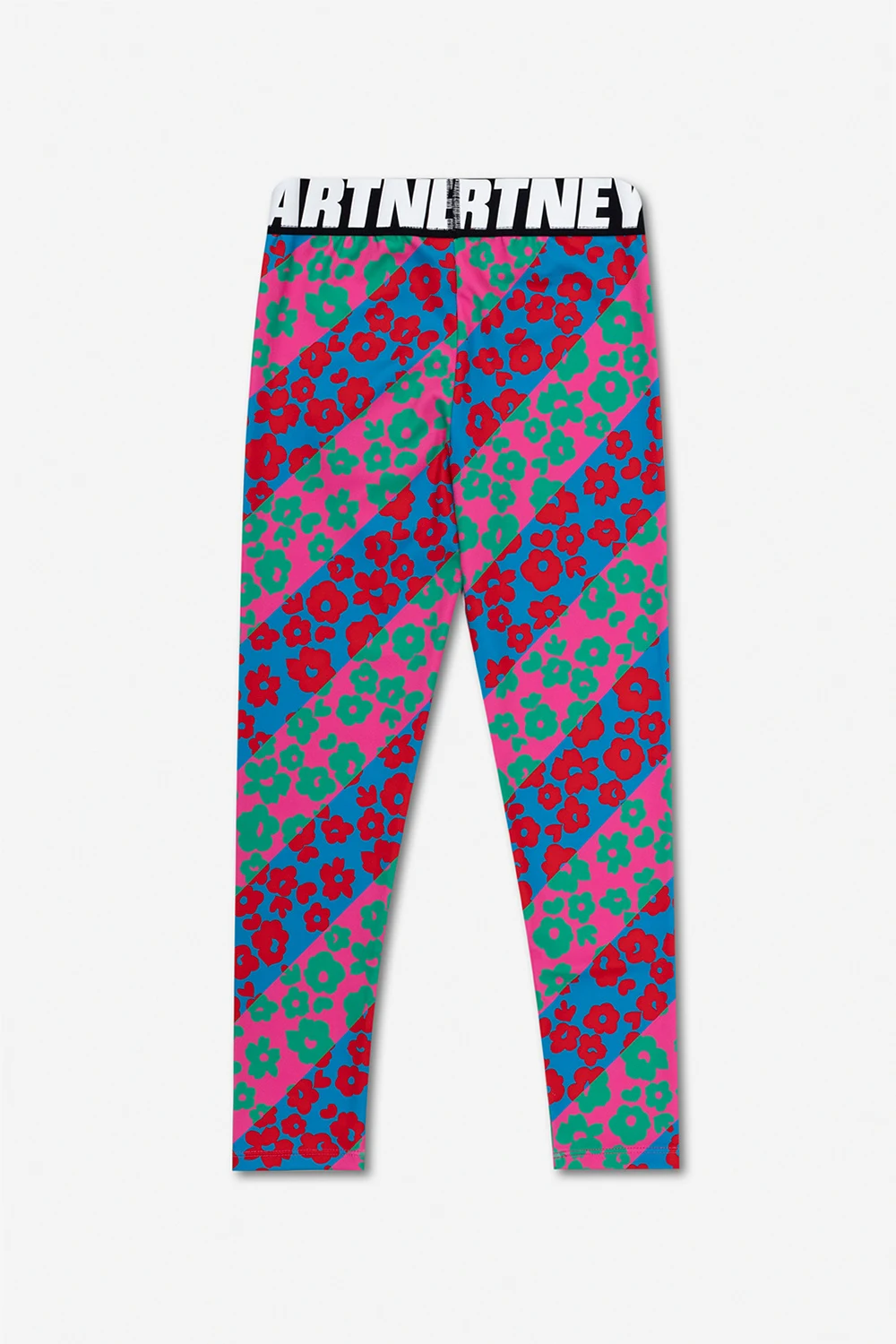 Multicoloured leggings from Stella McCartney Kids. Crafted from recycled material, they feature a white and black branded waistband and a floral pattern all over.