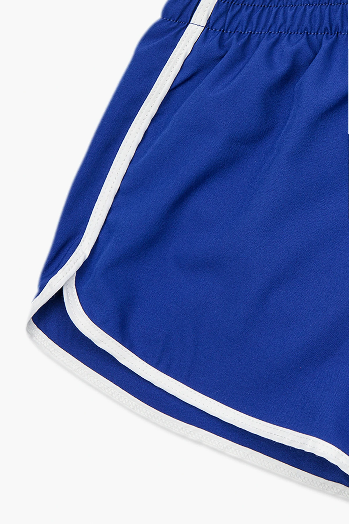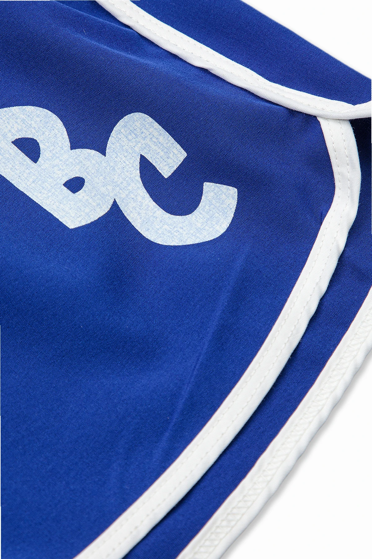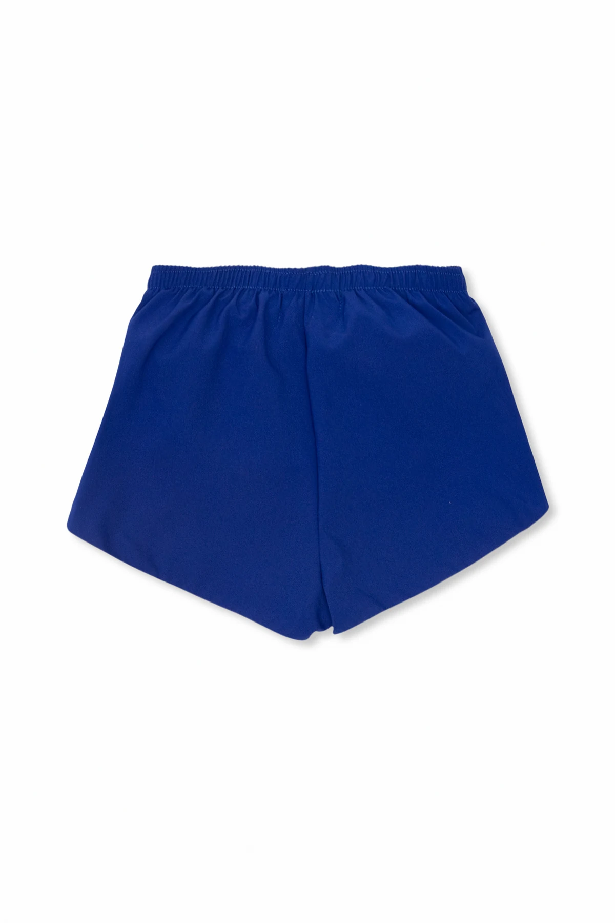 Navy swim shorts from Bobo Choses. Made of fabric with a UPF 50+ filter, this pair features an elastic waistband, white logo print and trimming.