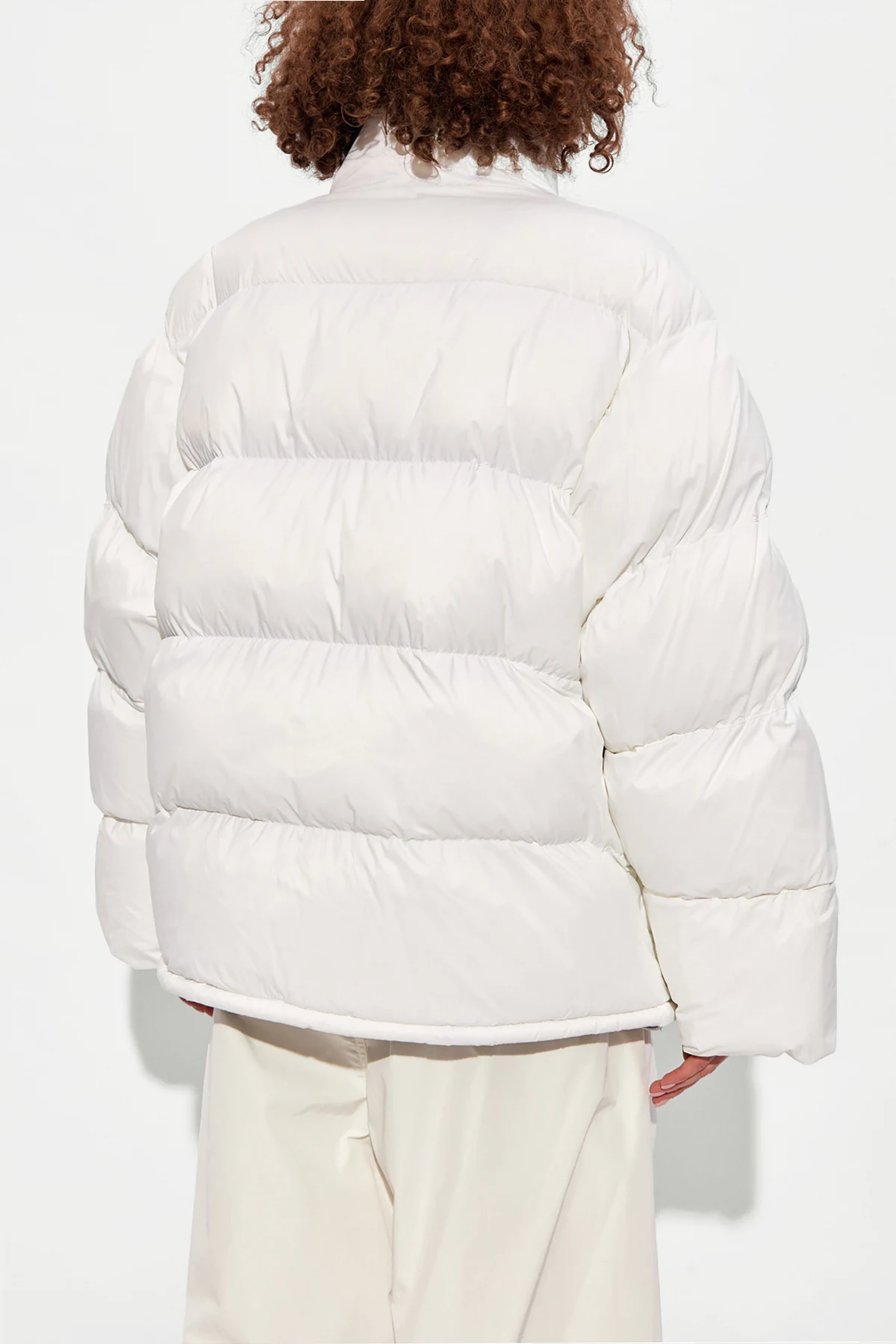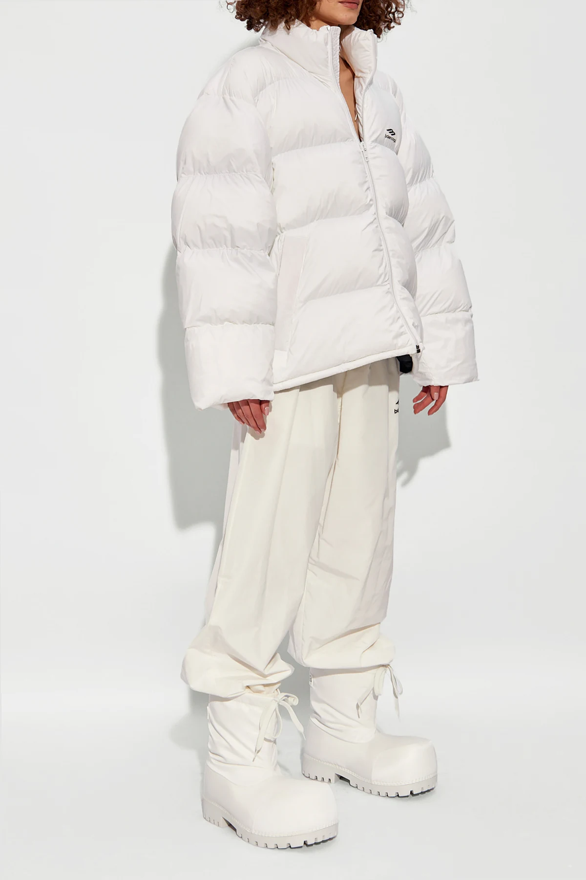 White down jacket from Balenciaga, the ‘Skiwear’ collection. Fastened with a zip, this design features a black logo, stand collar, two zip pockets, drawstring hem and waist as well as long sleeves.
