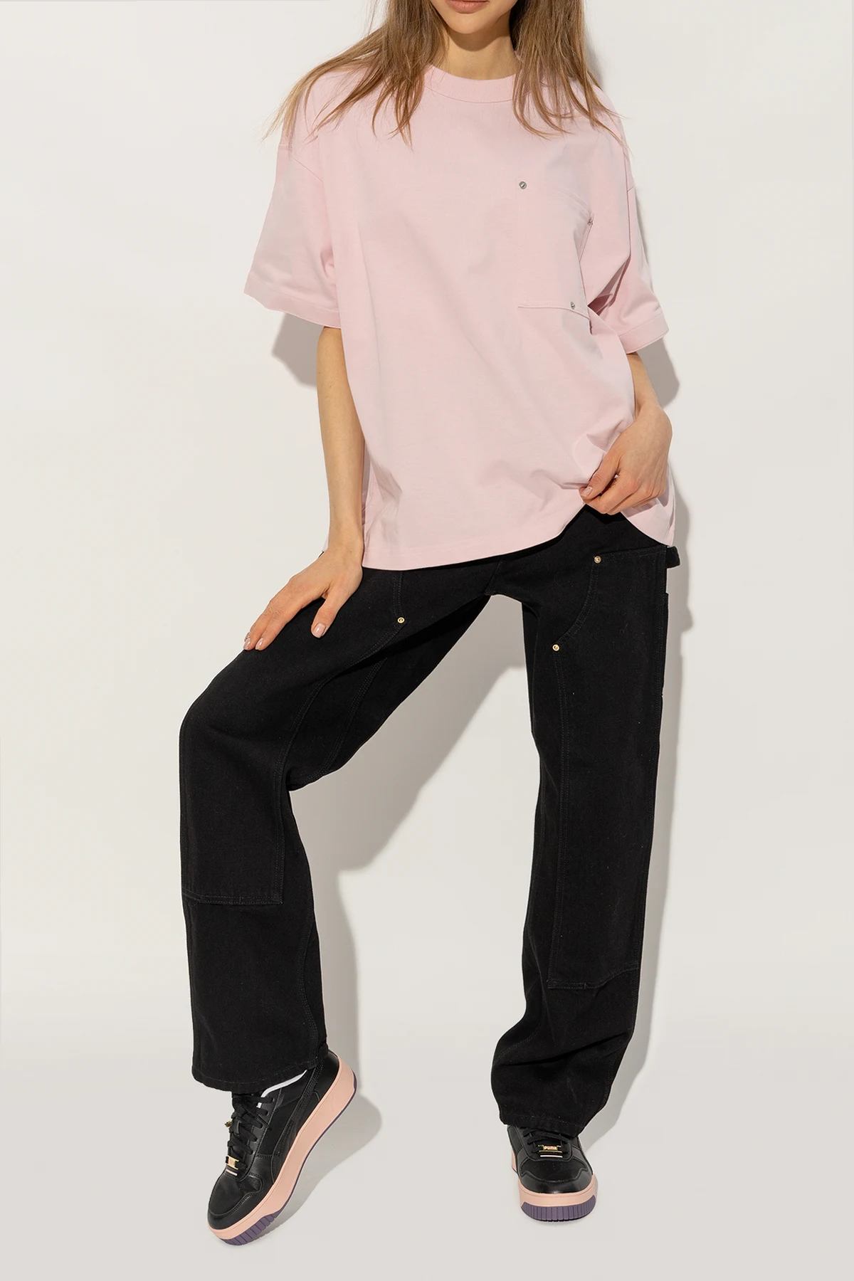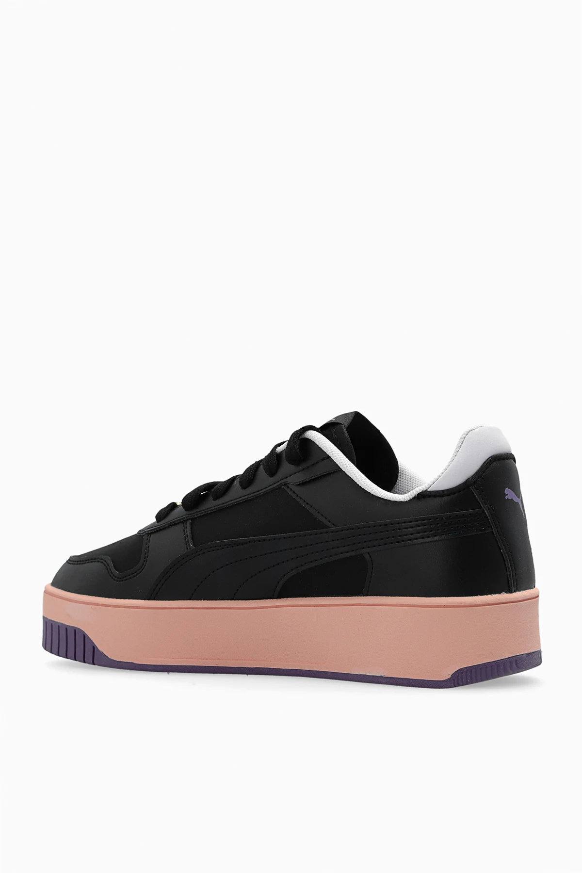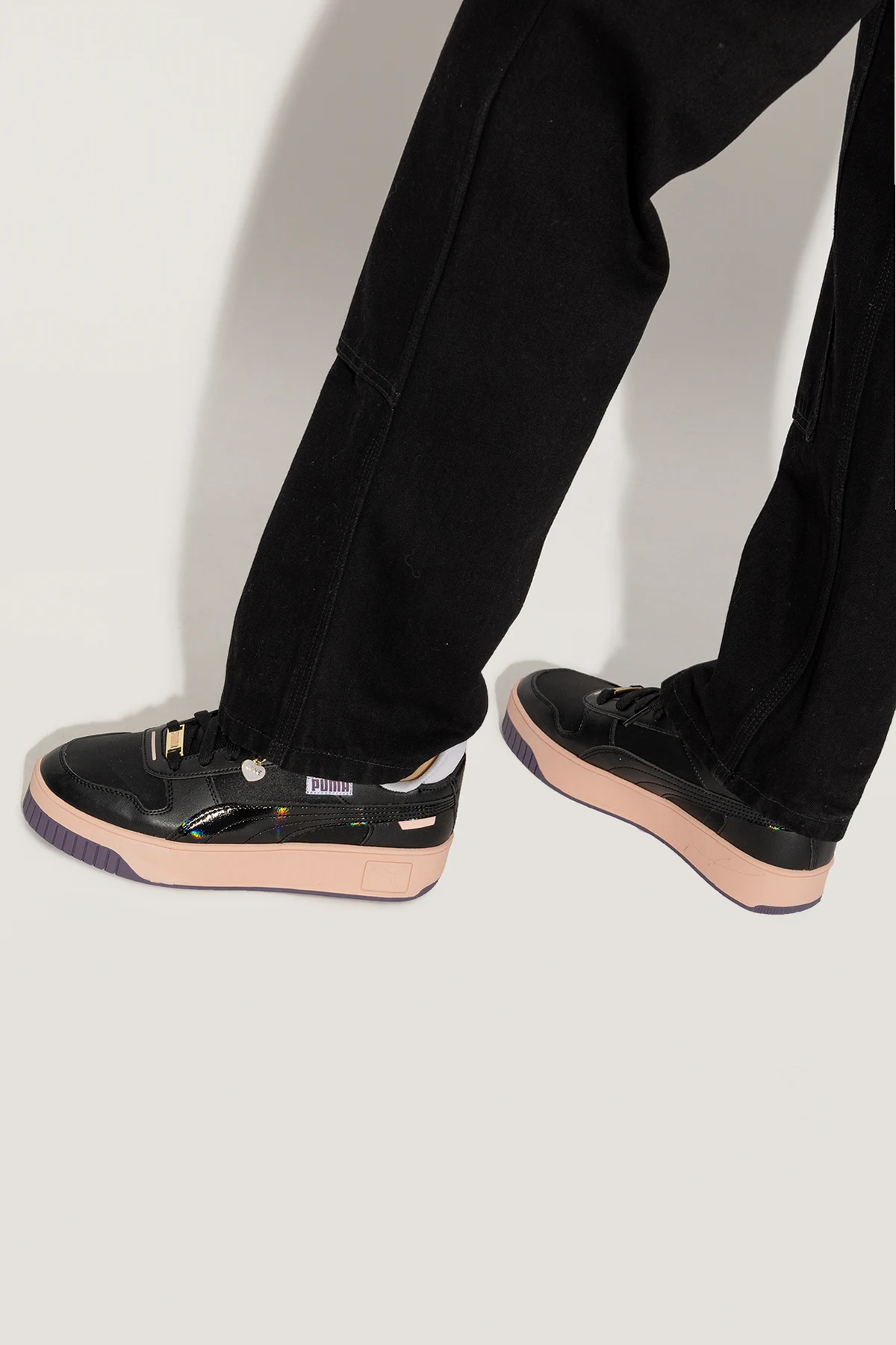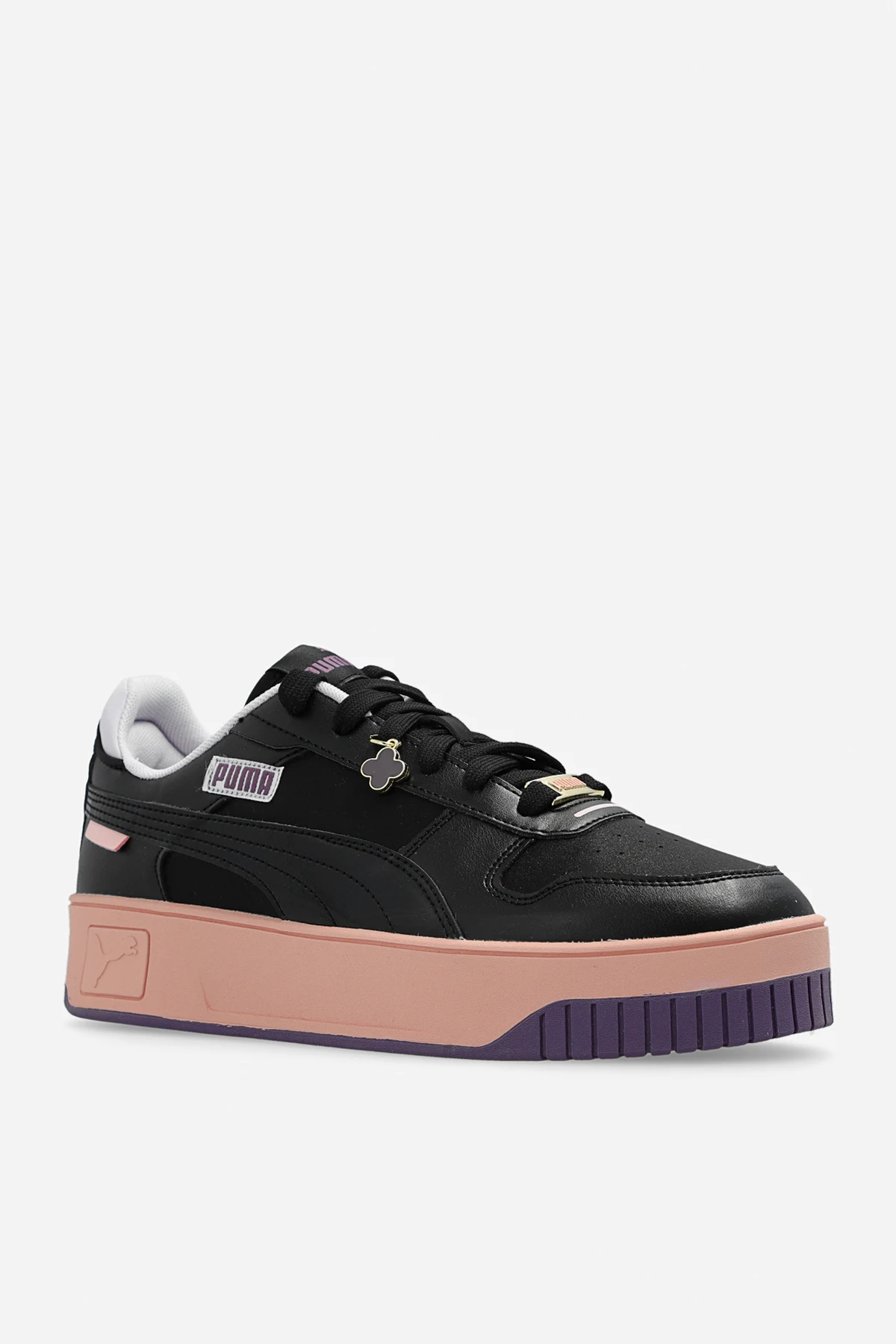 Black ‘Carina Street Charms’ sneakers from Puma. Crafted from faux leather and glossy material, this lace-up model sits on a pink and purple rubber sole and features an application and logo patches. Comes with a gold-tone and purple charm.