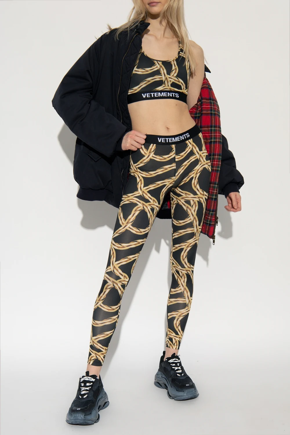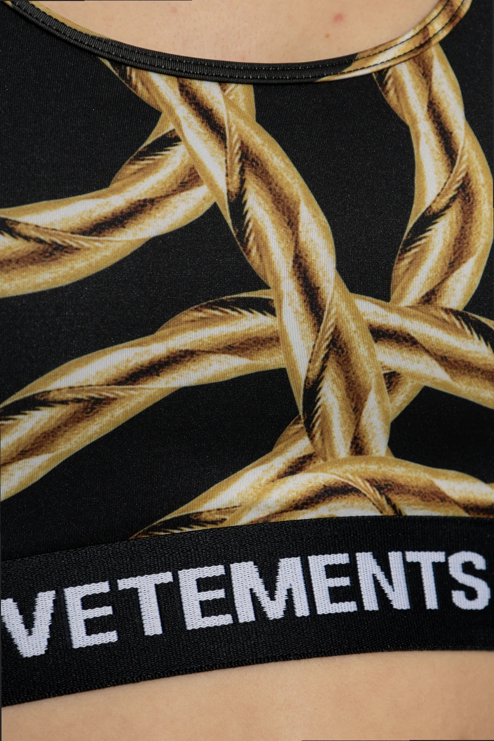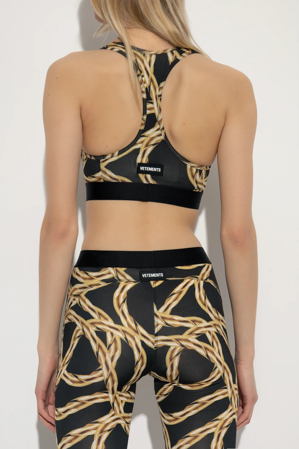Black sports bra from VETEMENTS. Crafted from stretchy material, this style showcases a gold-tone chain print, a rubber patch at the back, an elastic underband and white logo detailing.