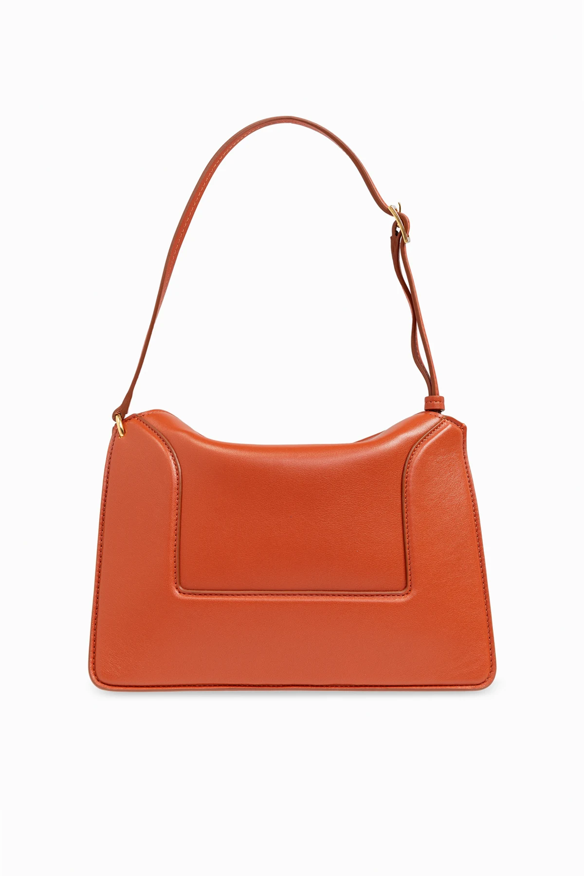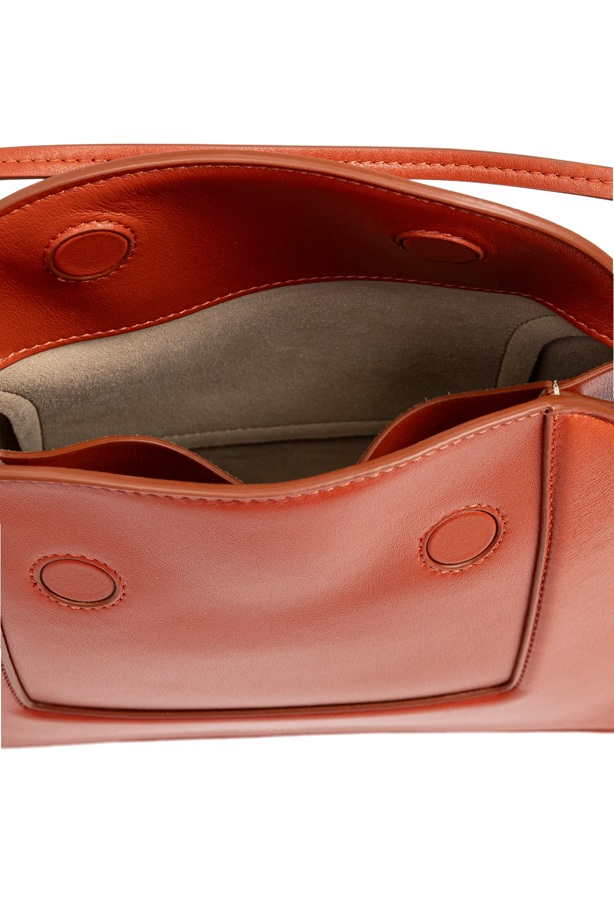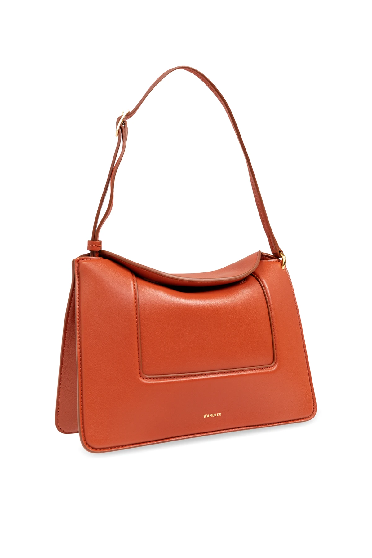 Gefertigt aus hochwertigem Kalbsleder , besticht die Tasche durch ihr minimalistisches Design. Einfarbig in einem intensiven Orangeton gehalten, weist sie keine Muster oder Aufdrucke auf, was ihren subtilen und raffinierten Charakter unterstreicht. Auf der Vorderseite befindet sich das zarte, goldene Logo der Marke WANDLER , das ihr Prestige verleiht.